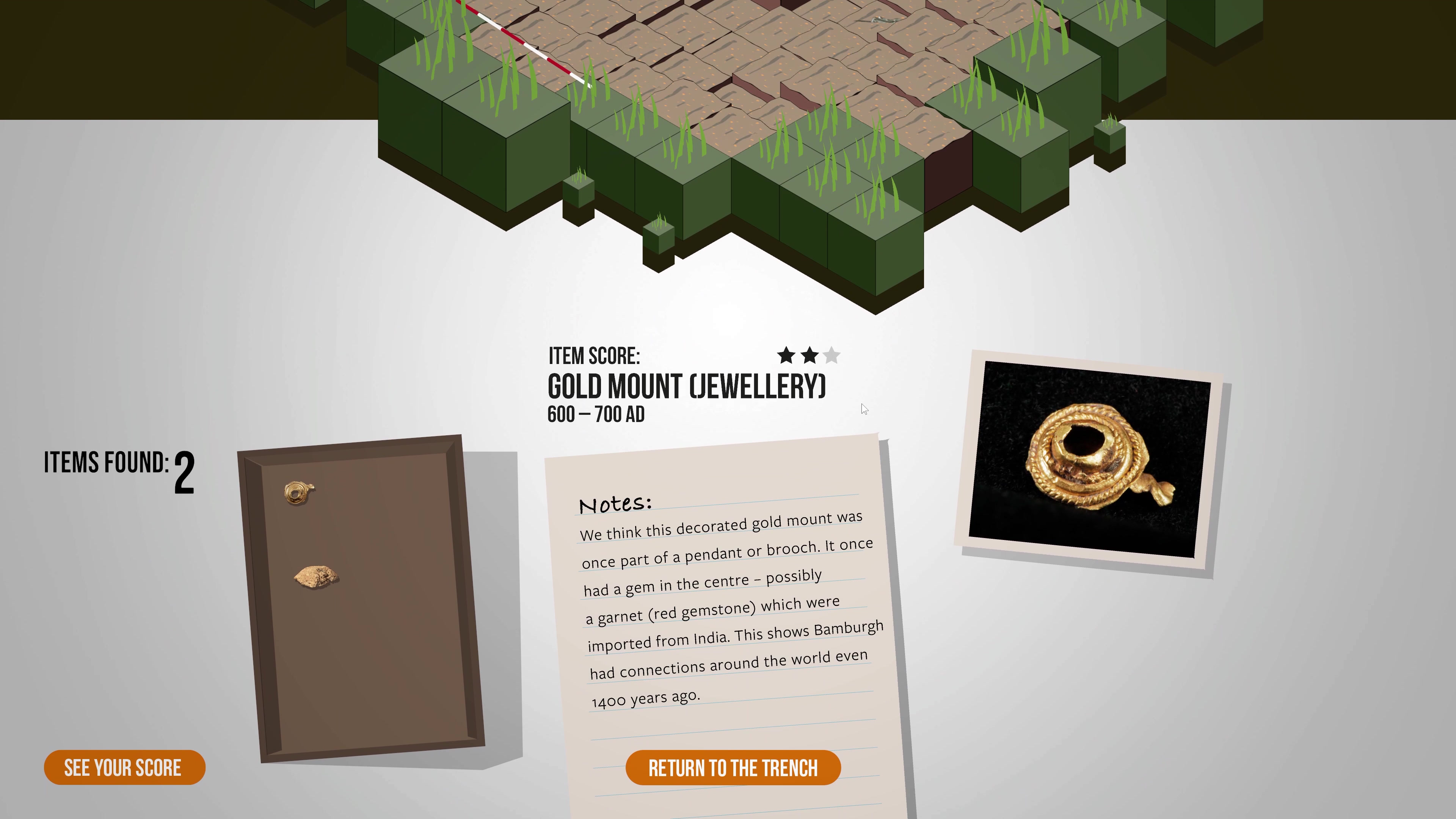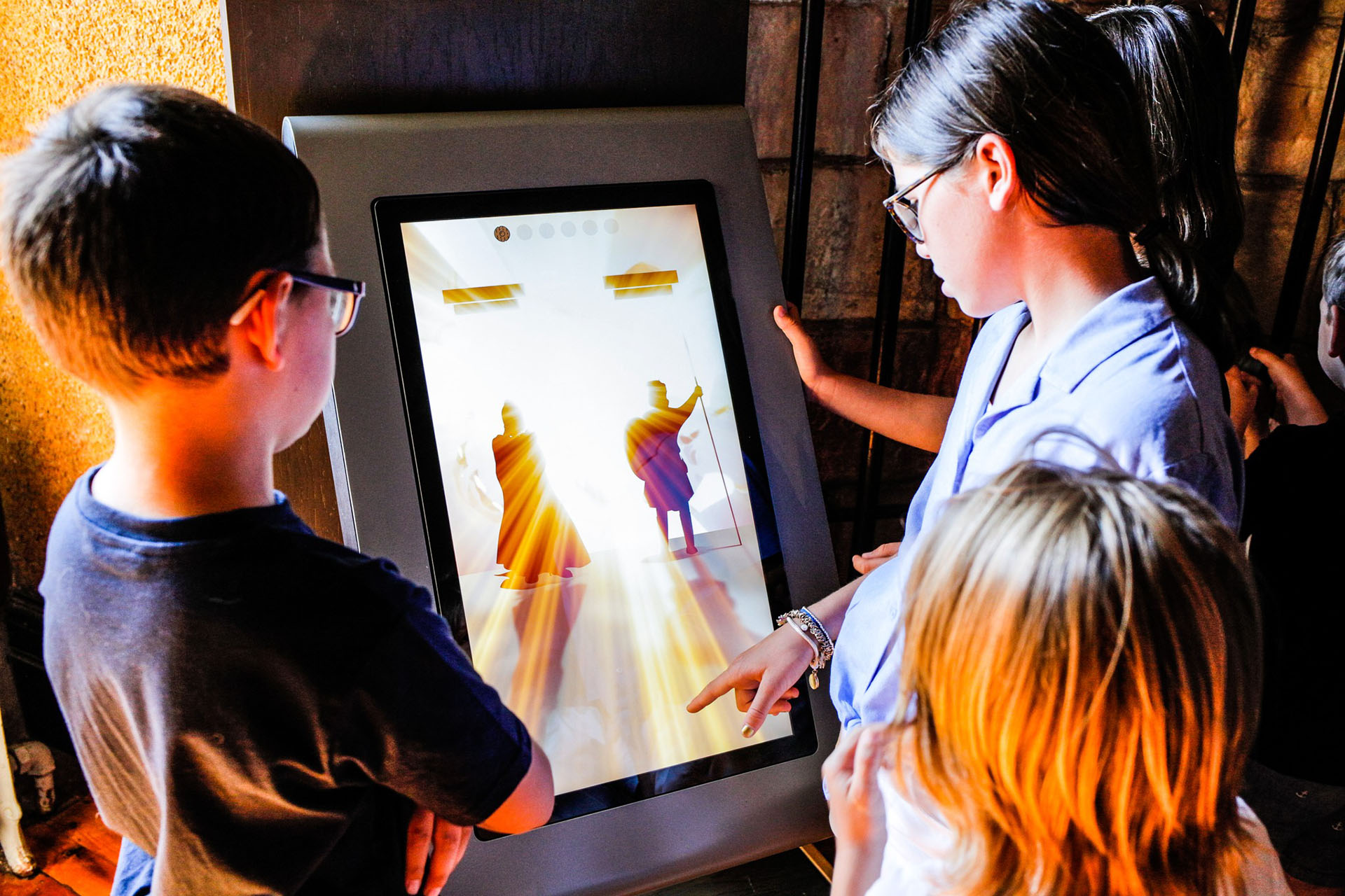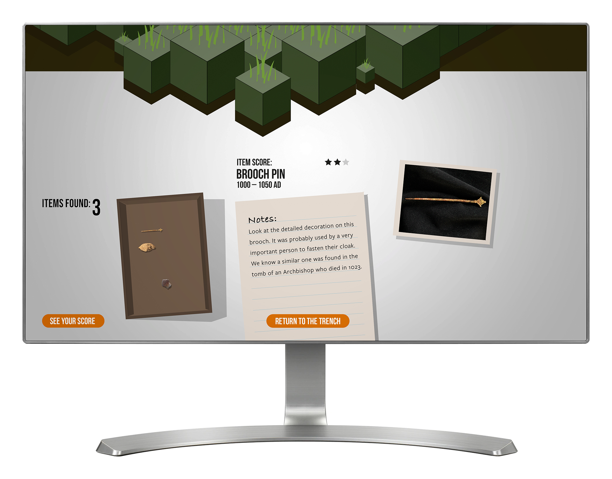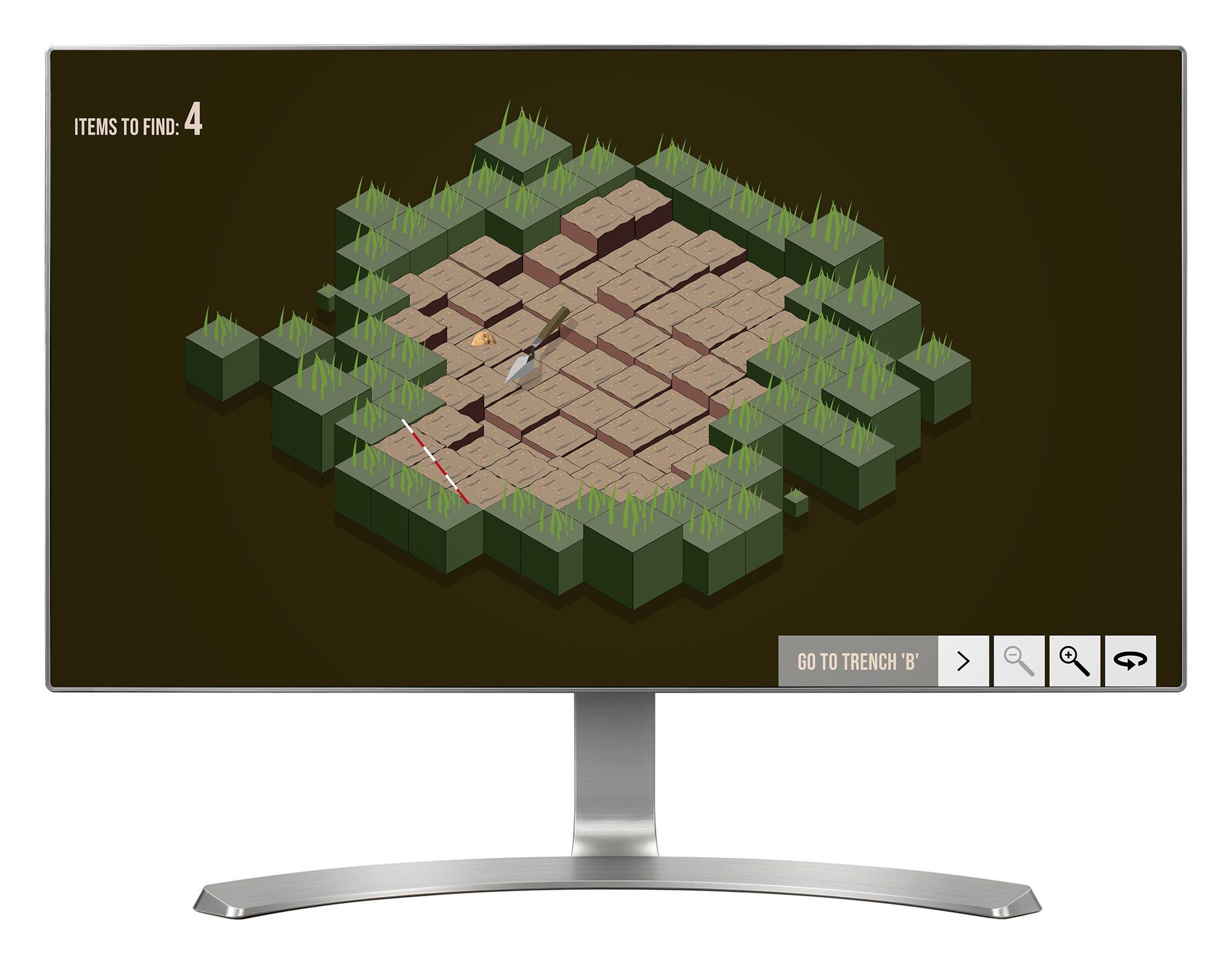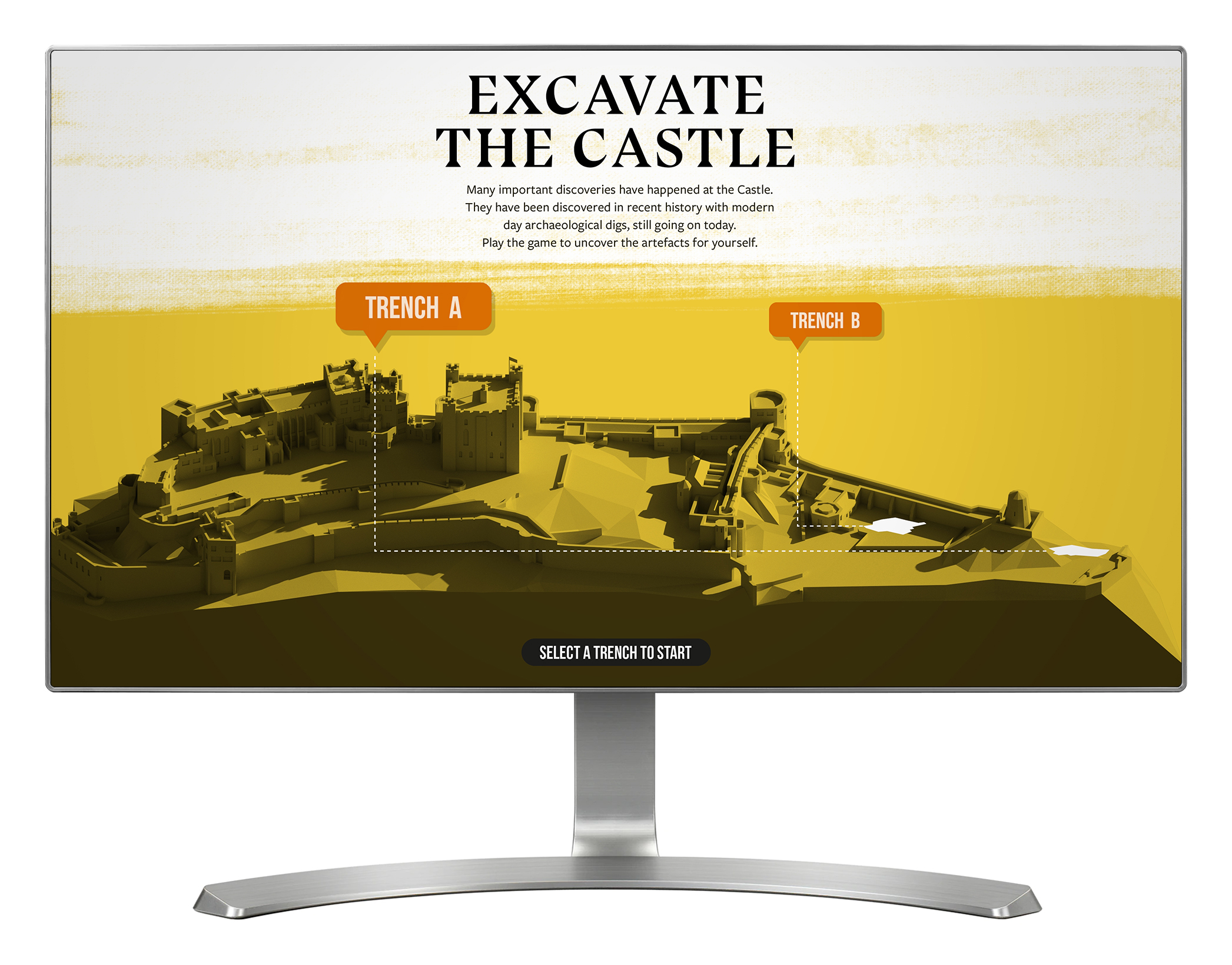 ‘Excavate the Castle’ is an engaging touch screen interactive that gives visitors the opportunity to excavate two of the archaeological dig sites at the Castle, and discover some of the artefacts that have been recovered over the past few decades. Developed as a 4K, 3D isometric experience, the interactive lets visitors move between two trenches as well as rotating and zooming each trench. There are fifteen artefacts to be found across both trenches, discovered by digging away in the soil to gradually reveal them. Visitors are rewarded for each artefact they discover with information, photos and points.