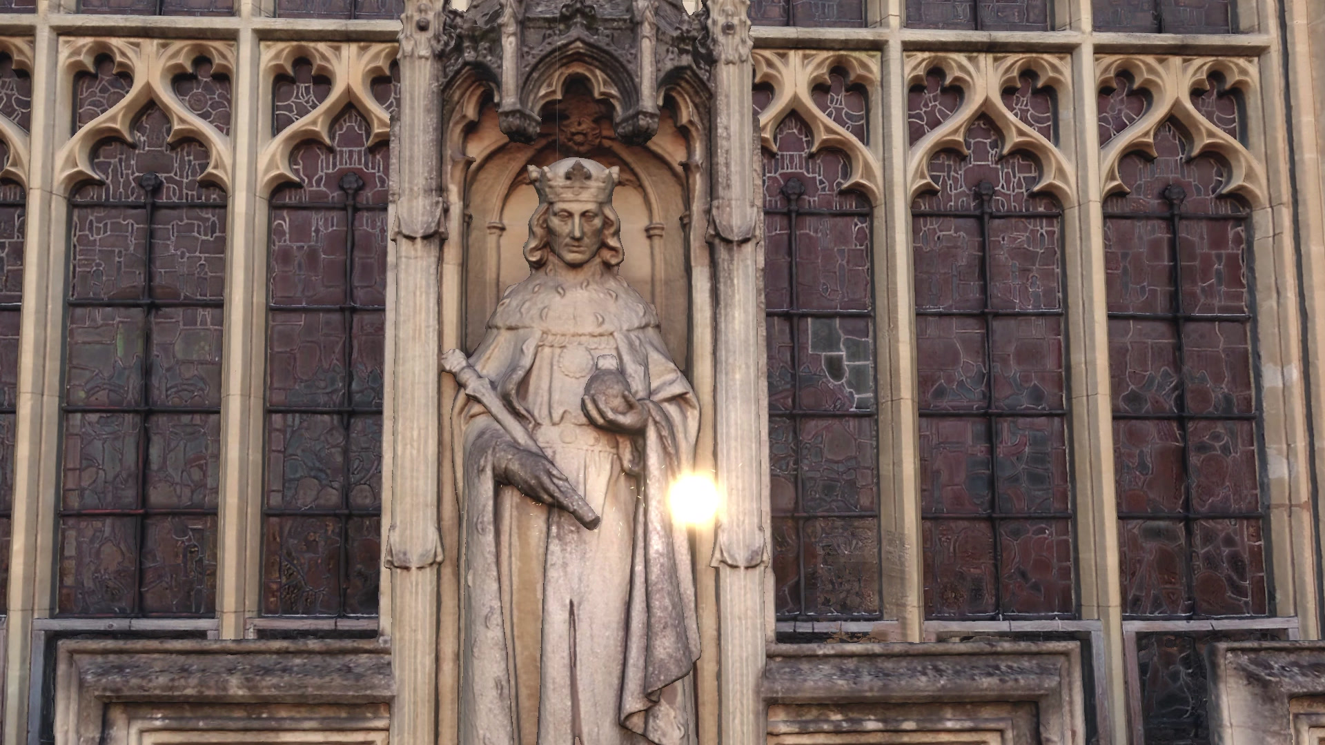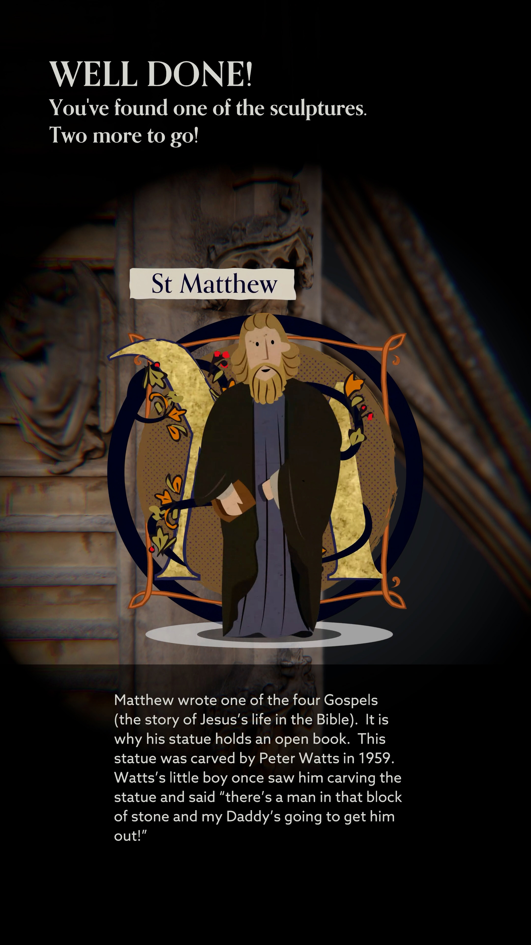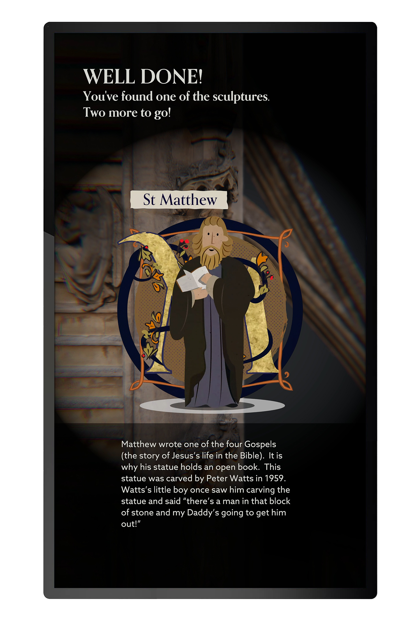 The West Front was recreated as a 3D photogrammetry model by Wessex Archaeology. Exploration of the West Front is gamified by arranging various architectural points of interest into groups of three. On locating each point of interest, visitors are rewarded with information and an animated illustration related to that point. When all three points have been located, the view reveals the entire West Front model, accompanied by short snippets of information about the key locations. Visitors can play again to get a different group of points to locate and learn about.