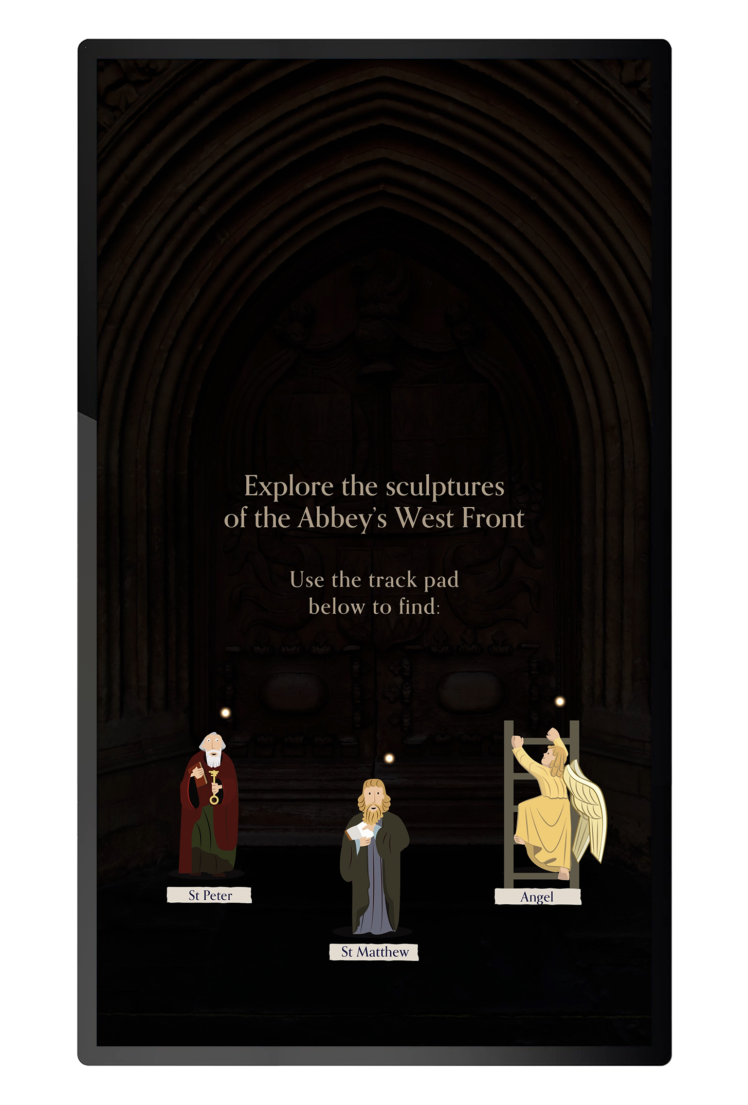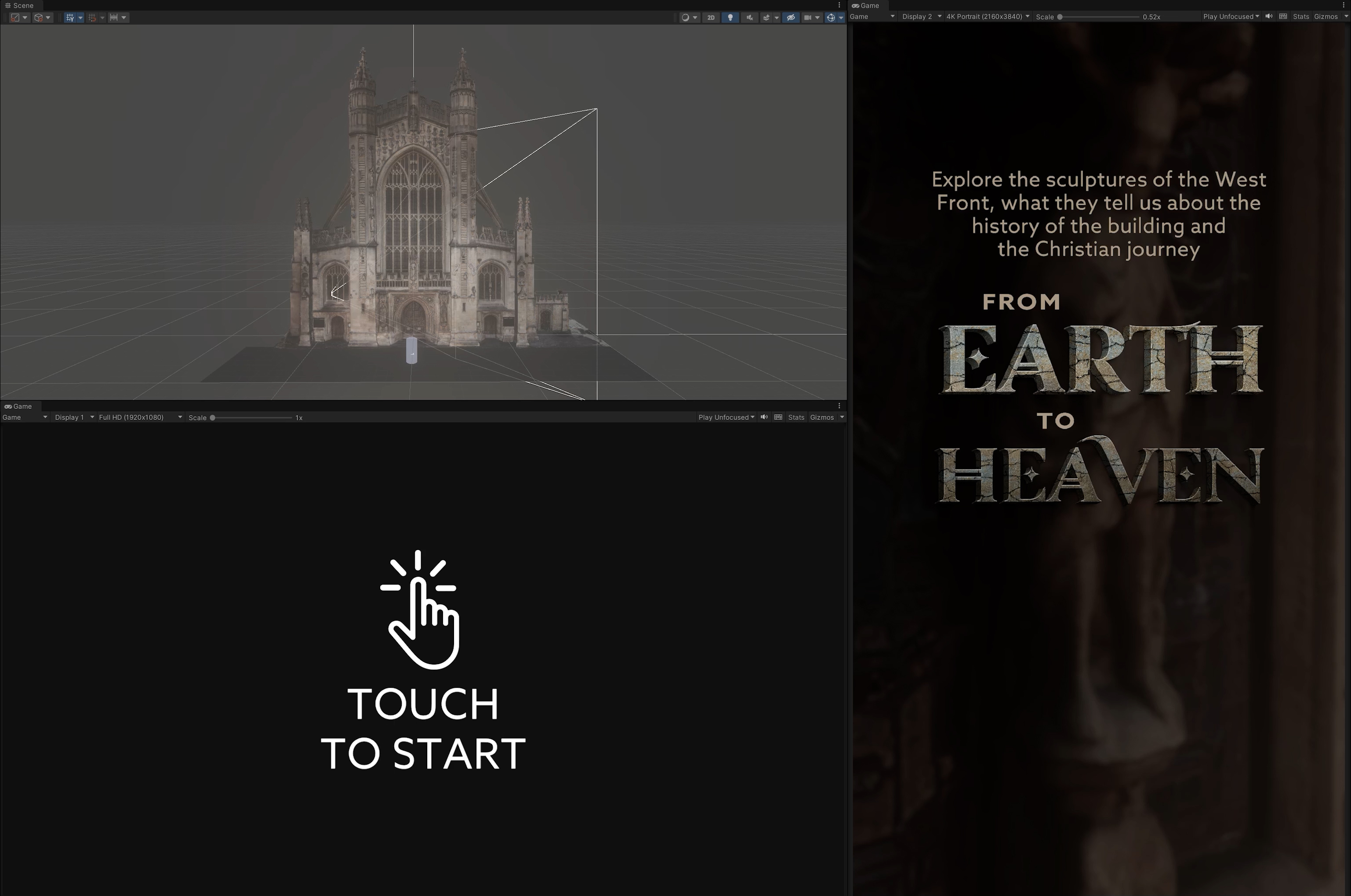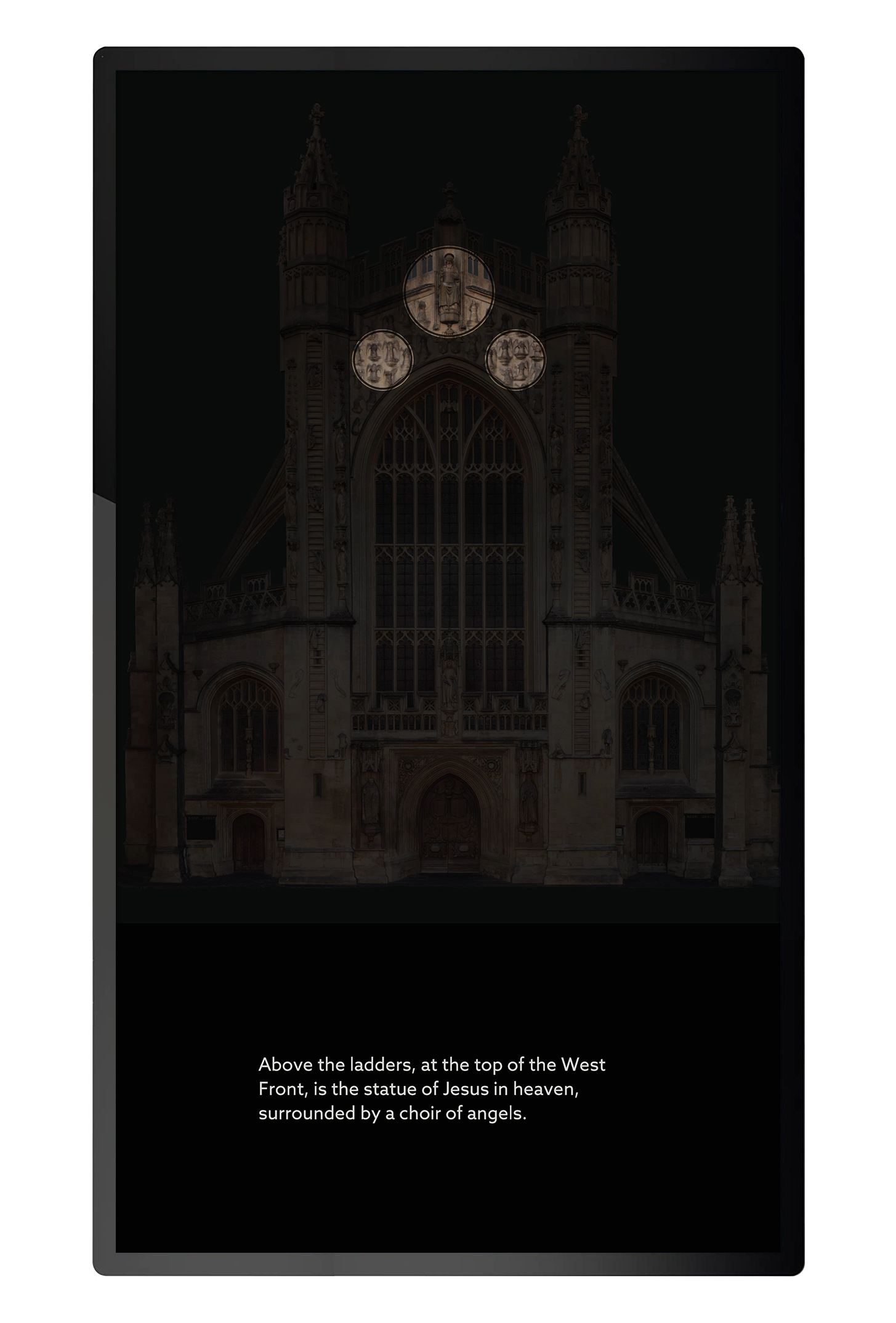 In early 2023 Bath Abbey opened a new discovery centre as part of their Footprint project. I developed several touch screen interactives for the new centre, the key one being a real-time 3D exploration of Bath Abbeys West Front, giving visitors an opportunity to view some of the architecture close up.