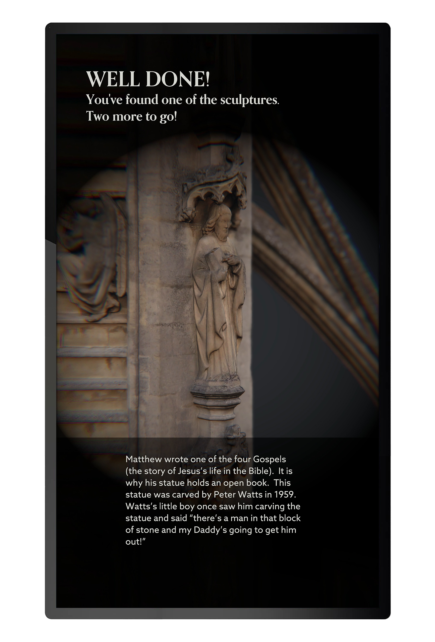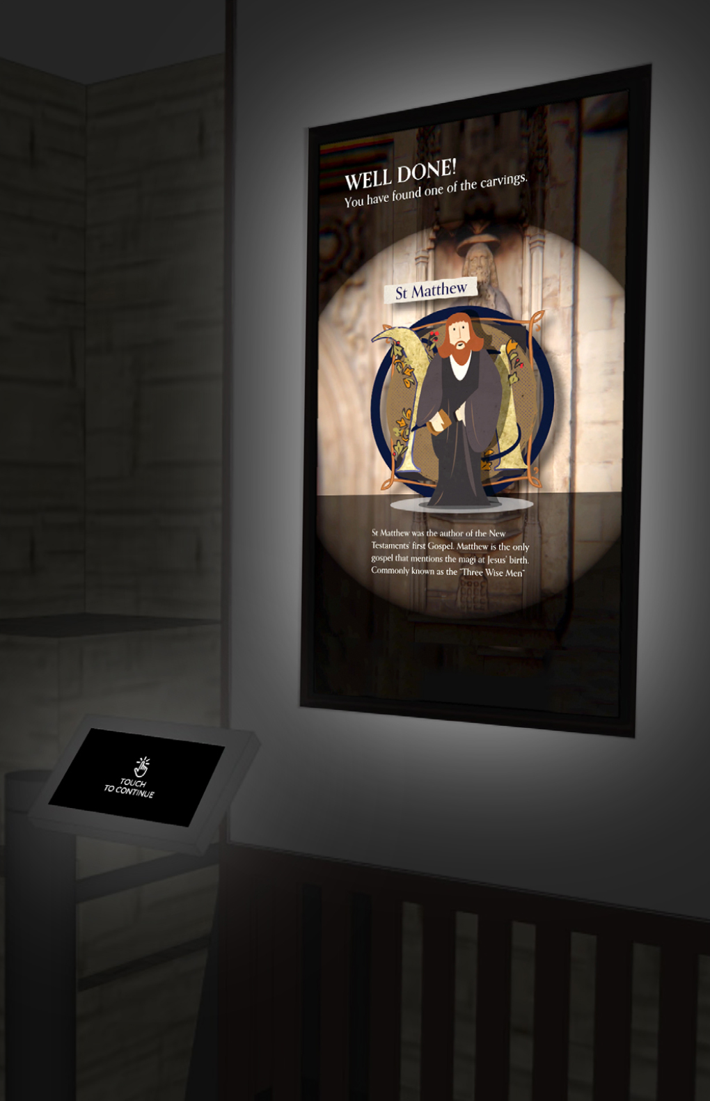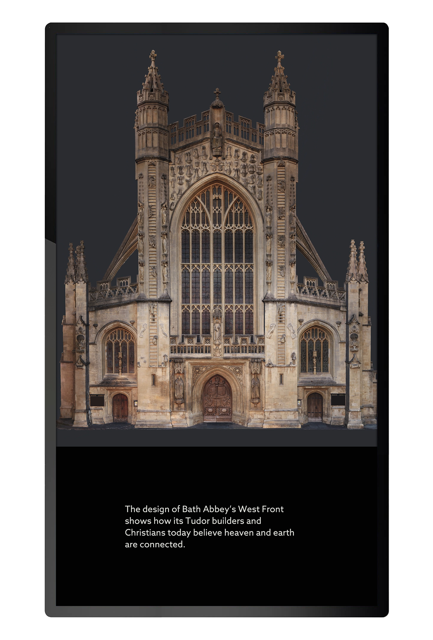 In early 2023 Bath Abbey opened a new discovery centre as part of their Footprint project. I developed several touch screen interactives for the new centre, the key one being a real-time 3D exploration of Bath Abbeys West Front, giving visitors an opportunity to view some of the architecture close up.