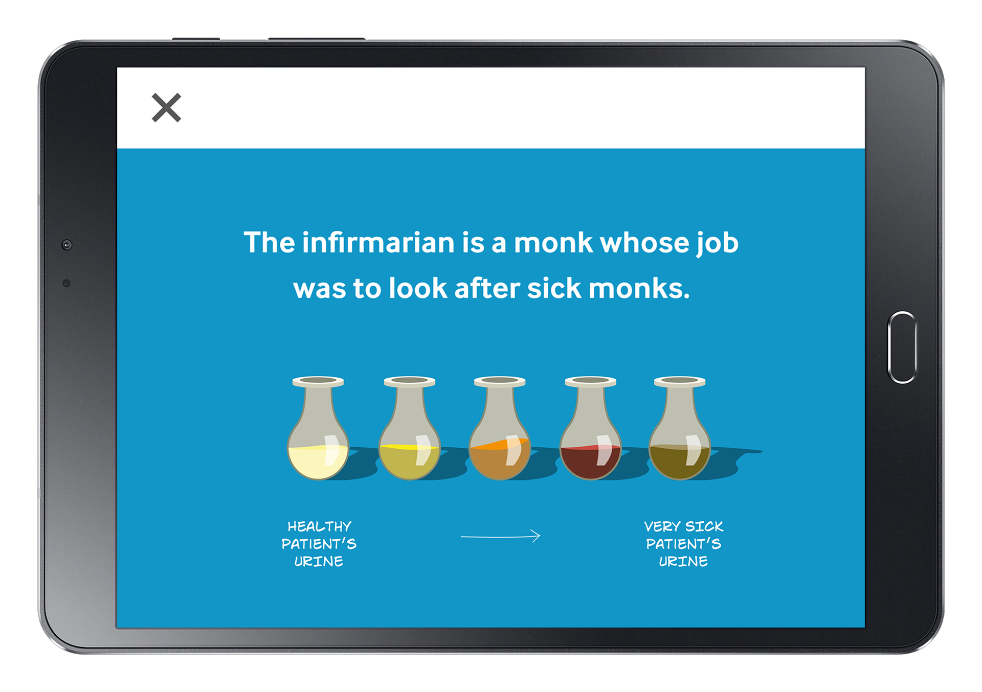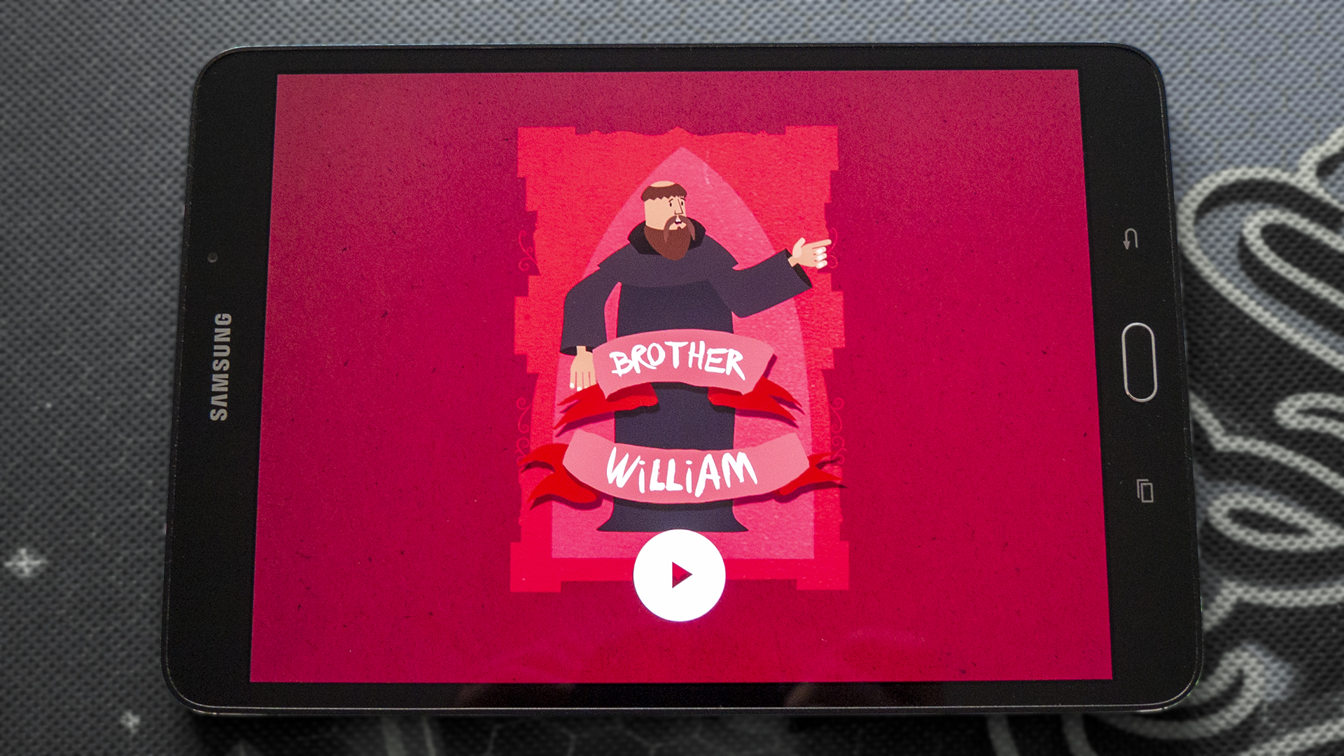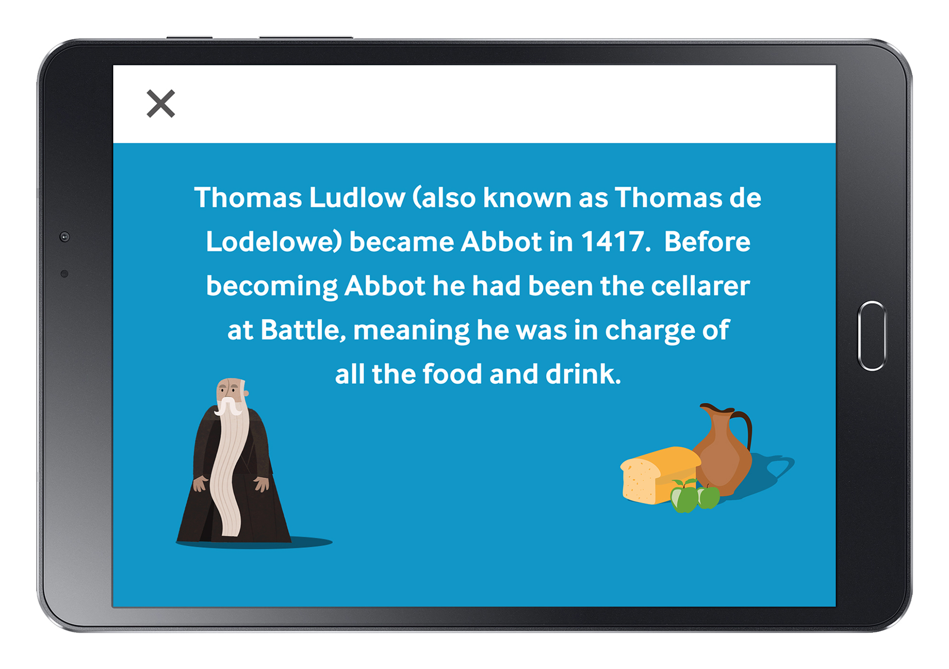 Brother William returns again to entertain visitors with humorous stories and facts related to the object, and after he has finished a menu offers more facts, questions and activities, all related to the current object and it's stories. The app contains stories, facts and activities for five objects located in three rooms.