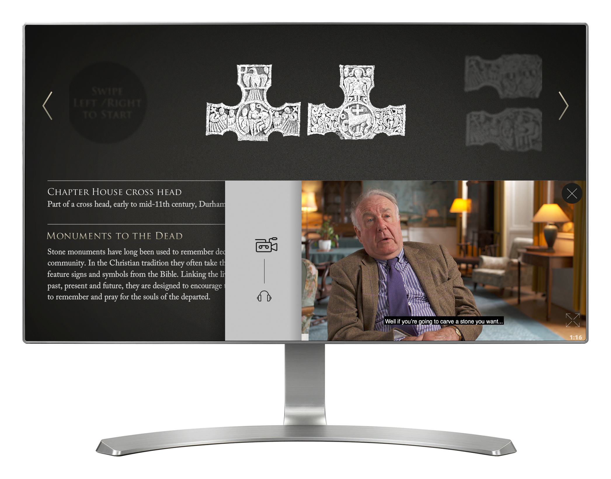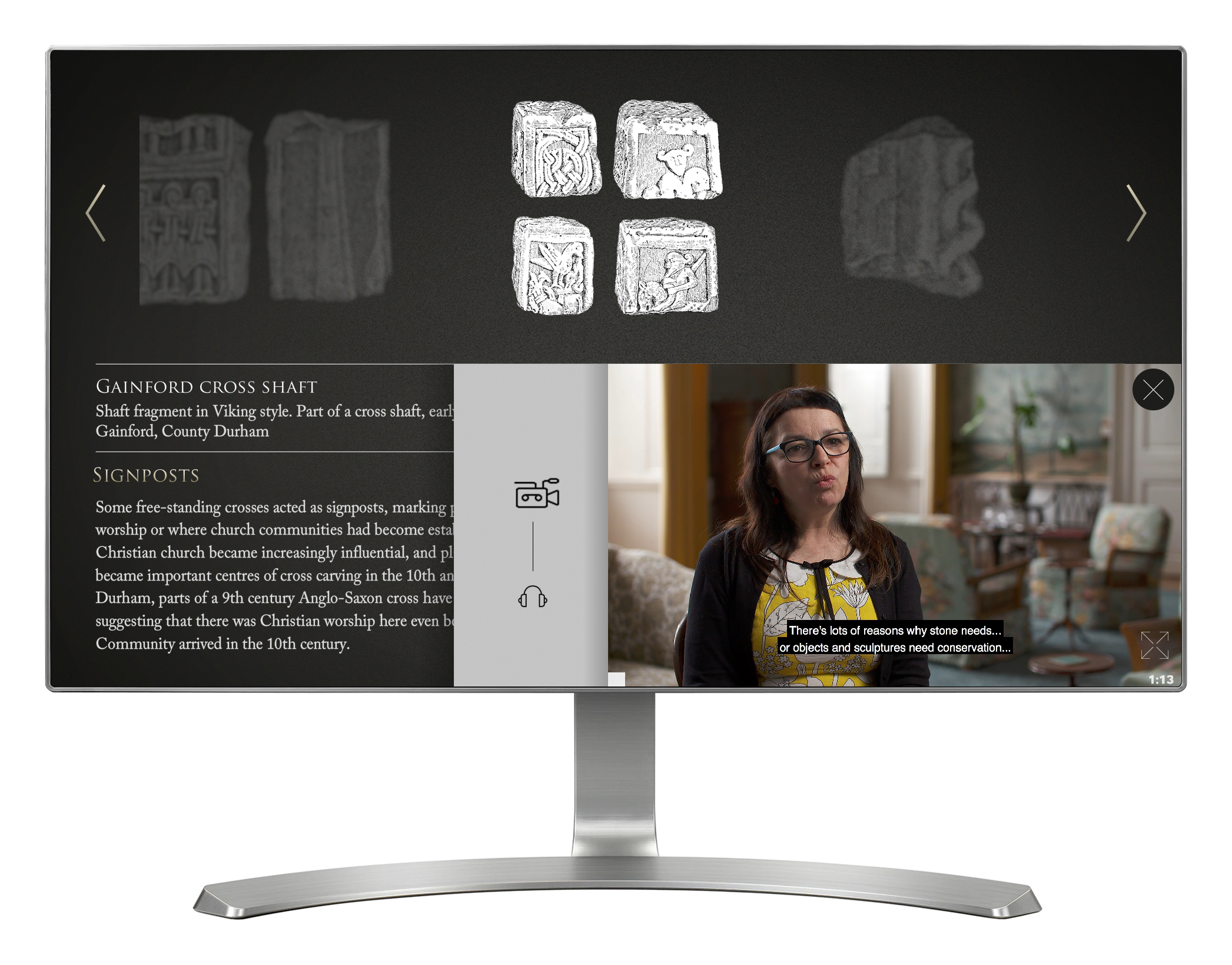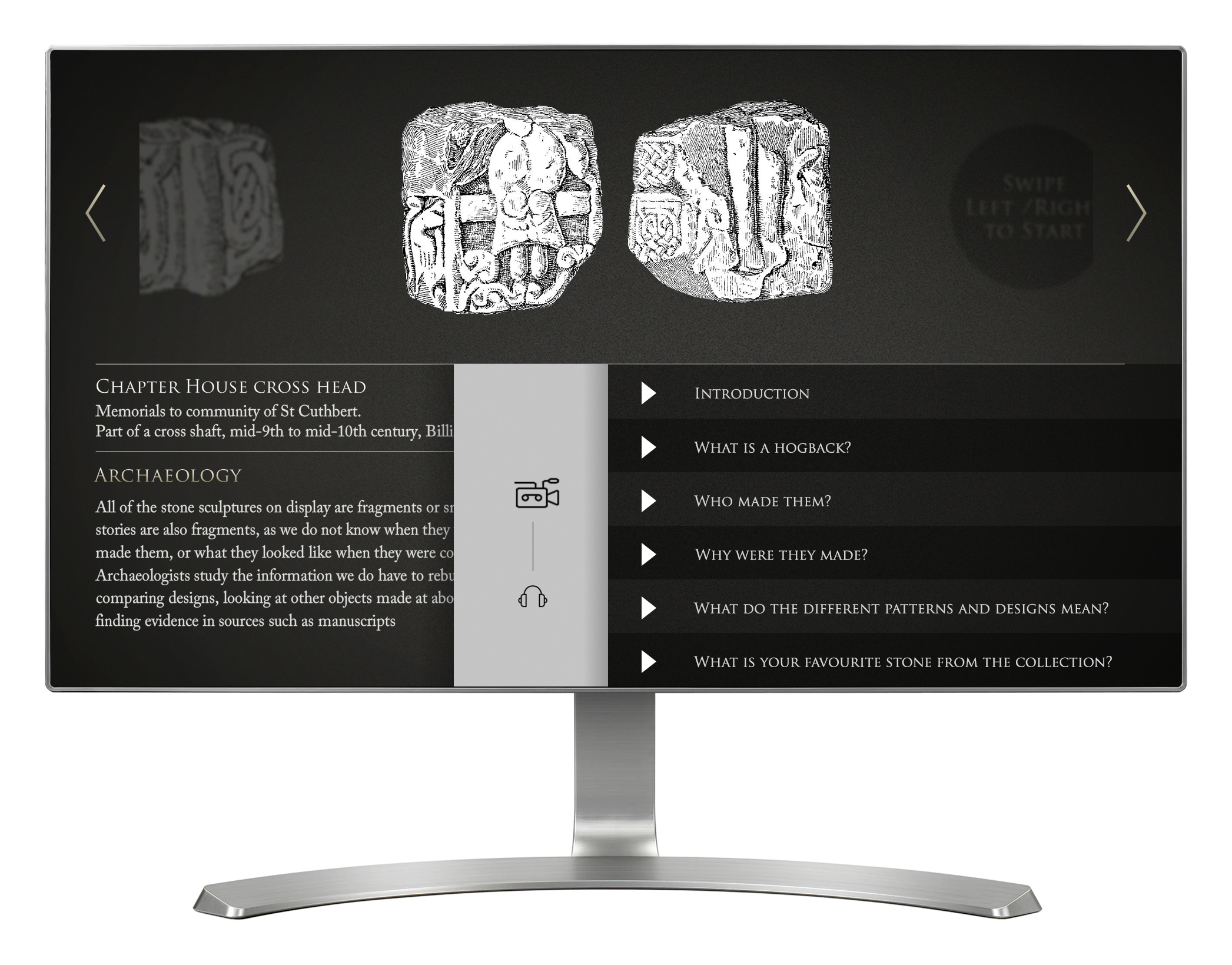 'Stone Collection' is an interactive dedicated to exploring and understanding religious stones from the North East of England. Four separate touch screen installations provide access to seven different themes, including Roman stones, preaching crosses, monuments to the dead, signposts, early monastic stones, memorials to the dead and archaeology. Each of the four installations also provides it's own video questions and answers with an expert. There are 80+ stones across the seven themes, and both the stones and videos are managed through a CMS. This allows any of the four installations to easily shown their own unique themes, and gives the client the ability to easily edit the information.
