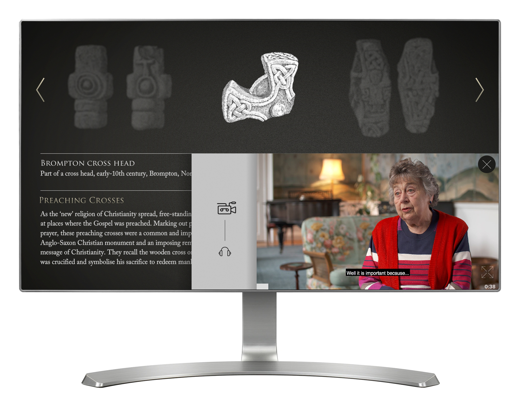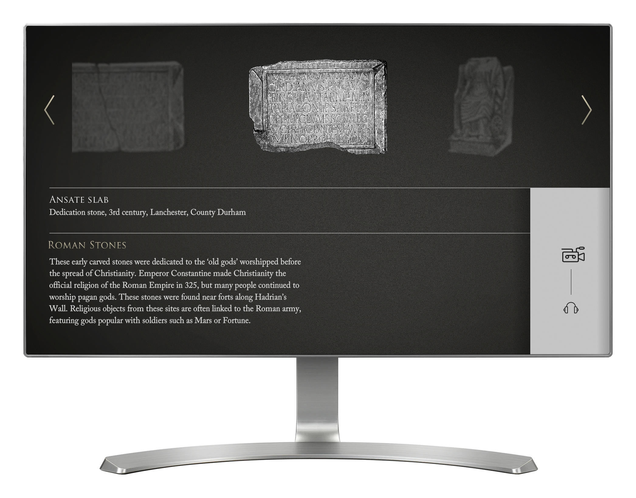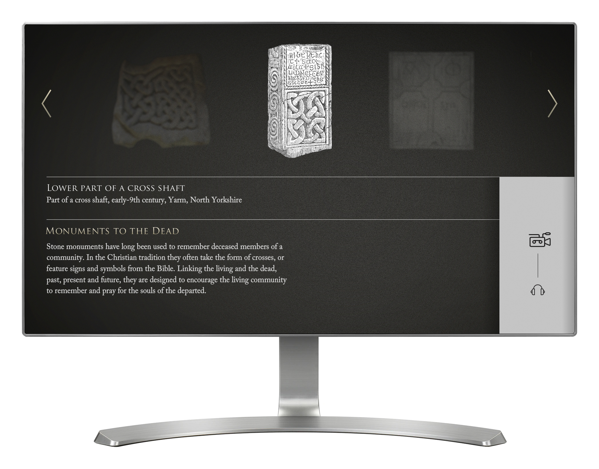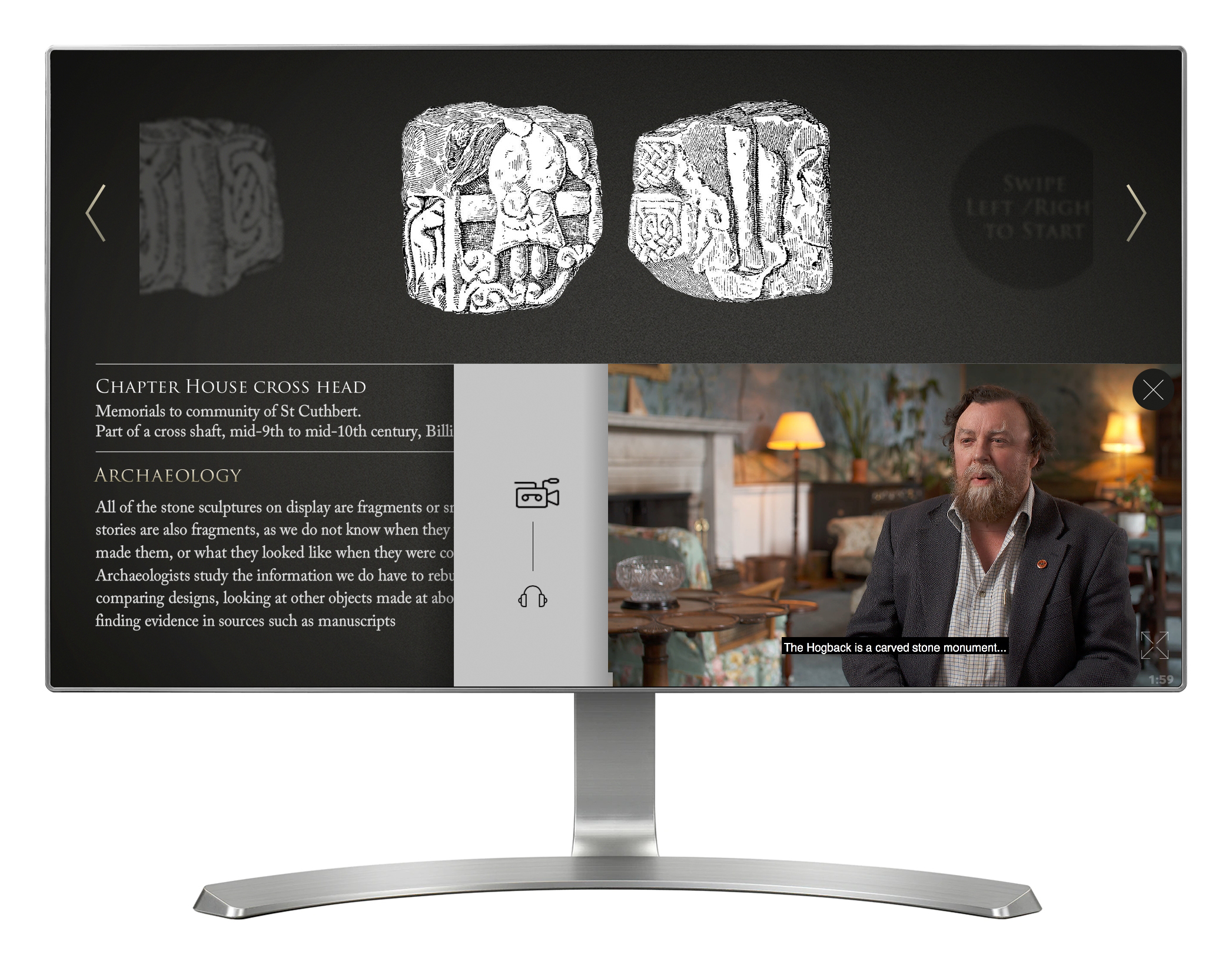 'Stone Collection' is an interactive dedicated to exploring and understanding religious stones from the North East of England. Four separate touch screen installations provide access to seven different themes, including Roman stones, preaching crosses, monuments to the dead, signposts, early monastic stones, memorials to the dead and archaeology. Each of the four installations also provides it's own video questions and answers with an expert. There are 80+ stones across the seven themes, and both the stones and videos are managed through a CMS. This allows any of the four installations to easily shown their own unique themes, and gives the client the ability to easily edit the information.