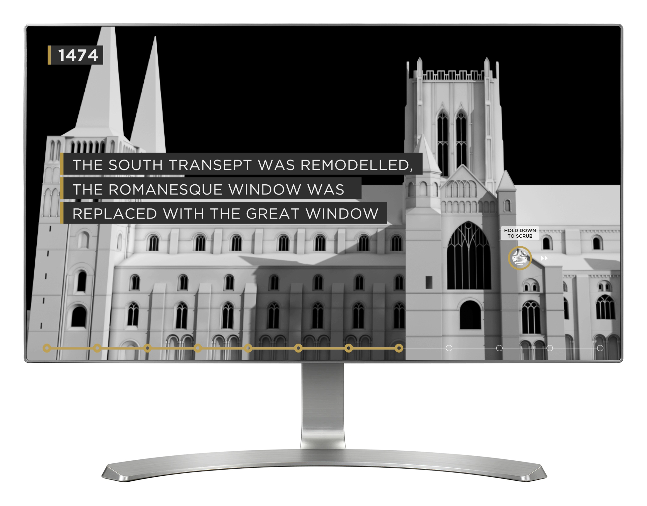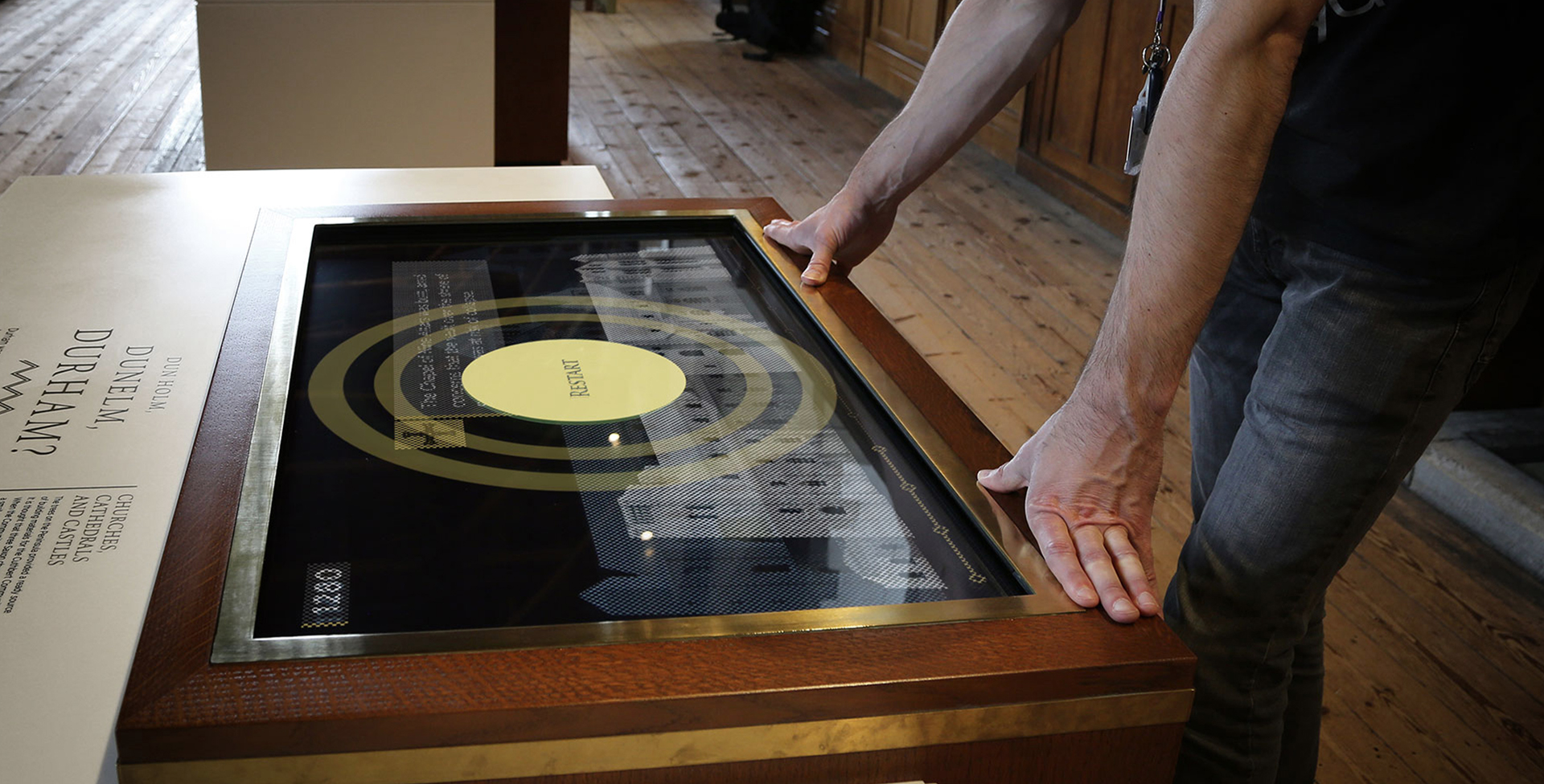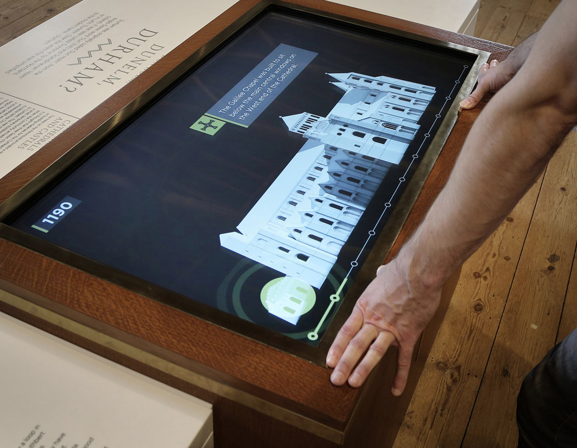 'Peninsula' is a classic touch table interactive that provides an overview of the main architectural changes to Durham Cathedral over the course of 700 years. When a visitor interrupts the screensaver and begins the interactive, it will automatically play through as a linear sequence, showing the changes over time and pausing briefly at key points in history. Additionally, visitors can swipe or drag left and right across the screen if they want to fast forward or rewind the sequence to any point.