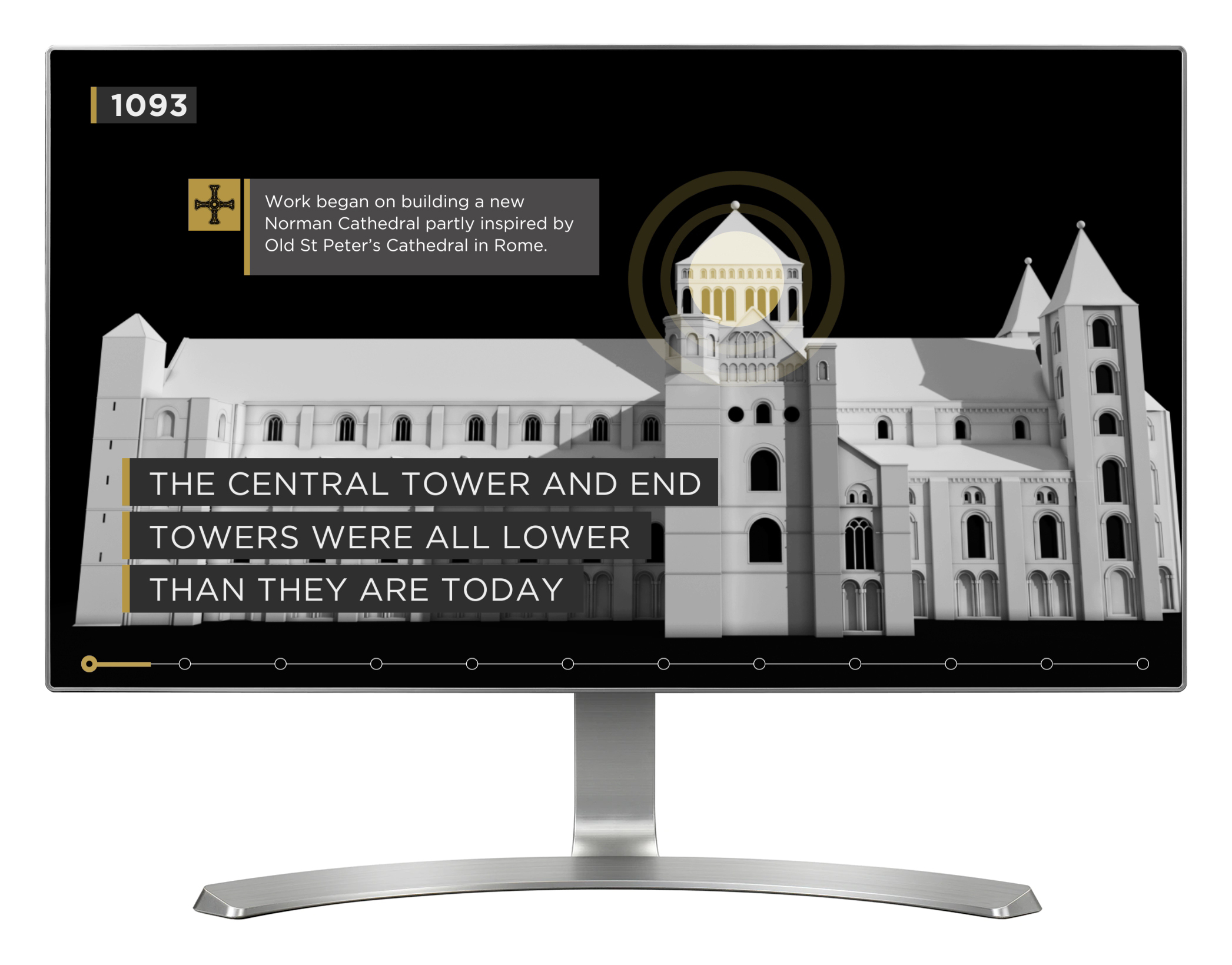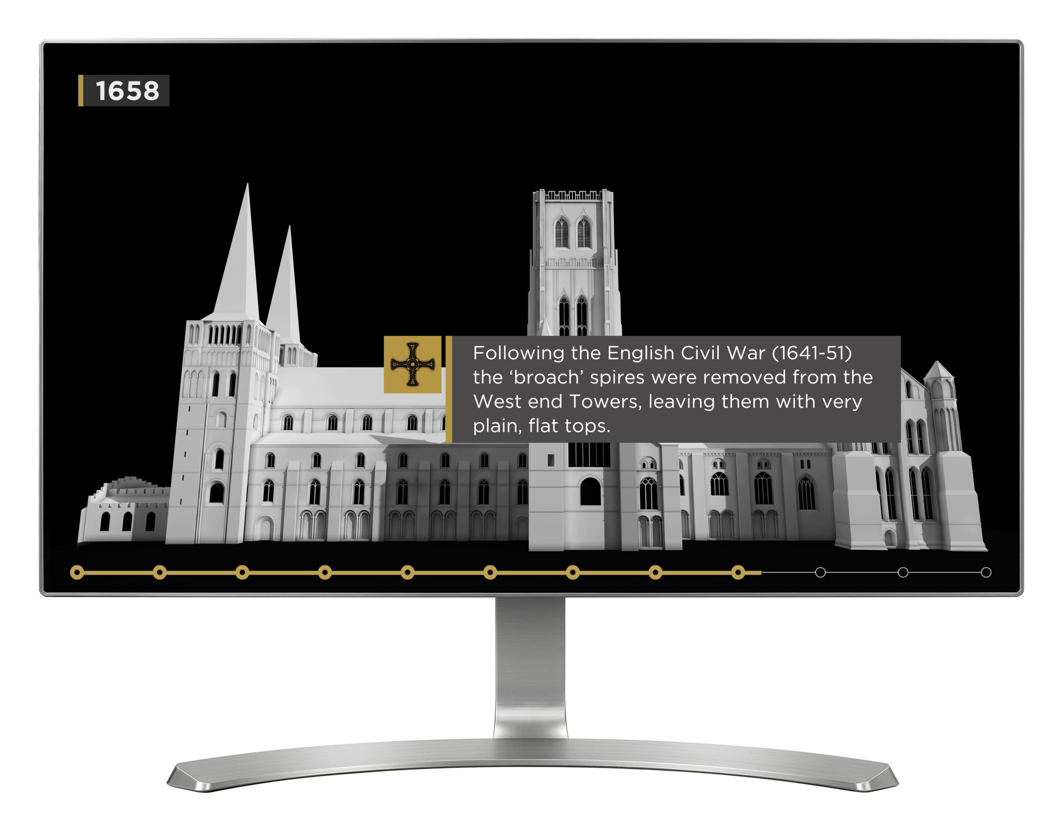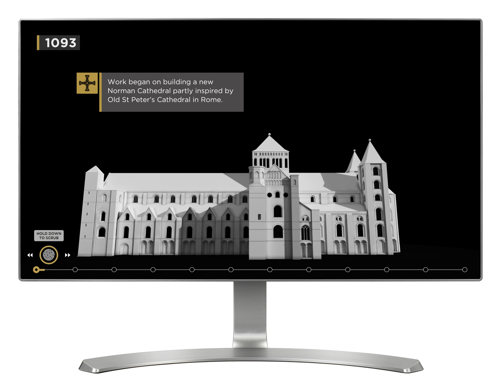 'Peninsula' is a classic touch table interactive that provides an overview of the main architectural changes to Durham Cathedral over the course of 700 years. When a visitor interrupts the screensaver and begins the interactive, it will automatically play through as a linear sequence, showing the changes over time and pausing briefly at key points in history. Additionally, visitors can swipe or drag left and right across the screen if they want to fast forward or rewind the sequence to any point.