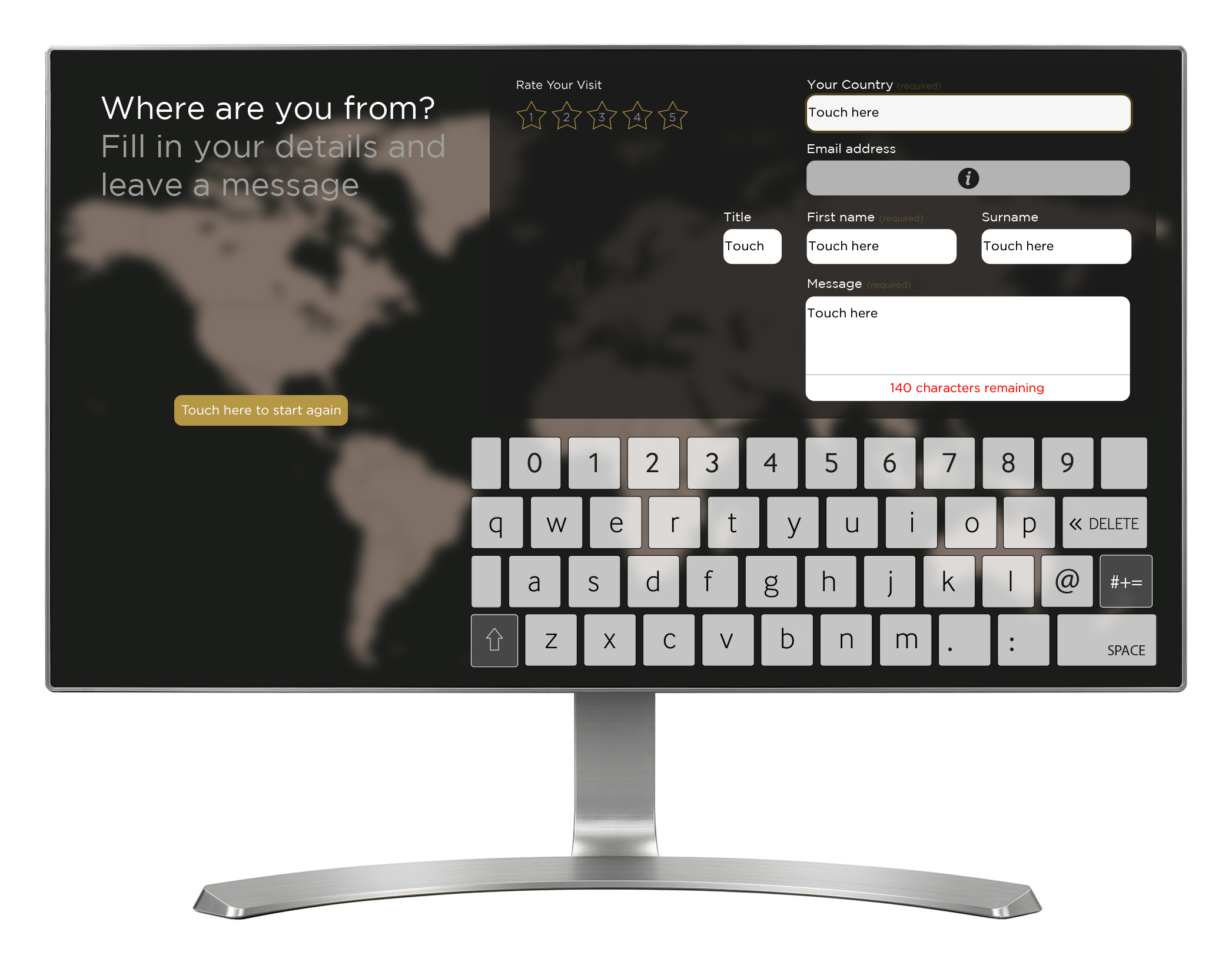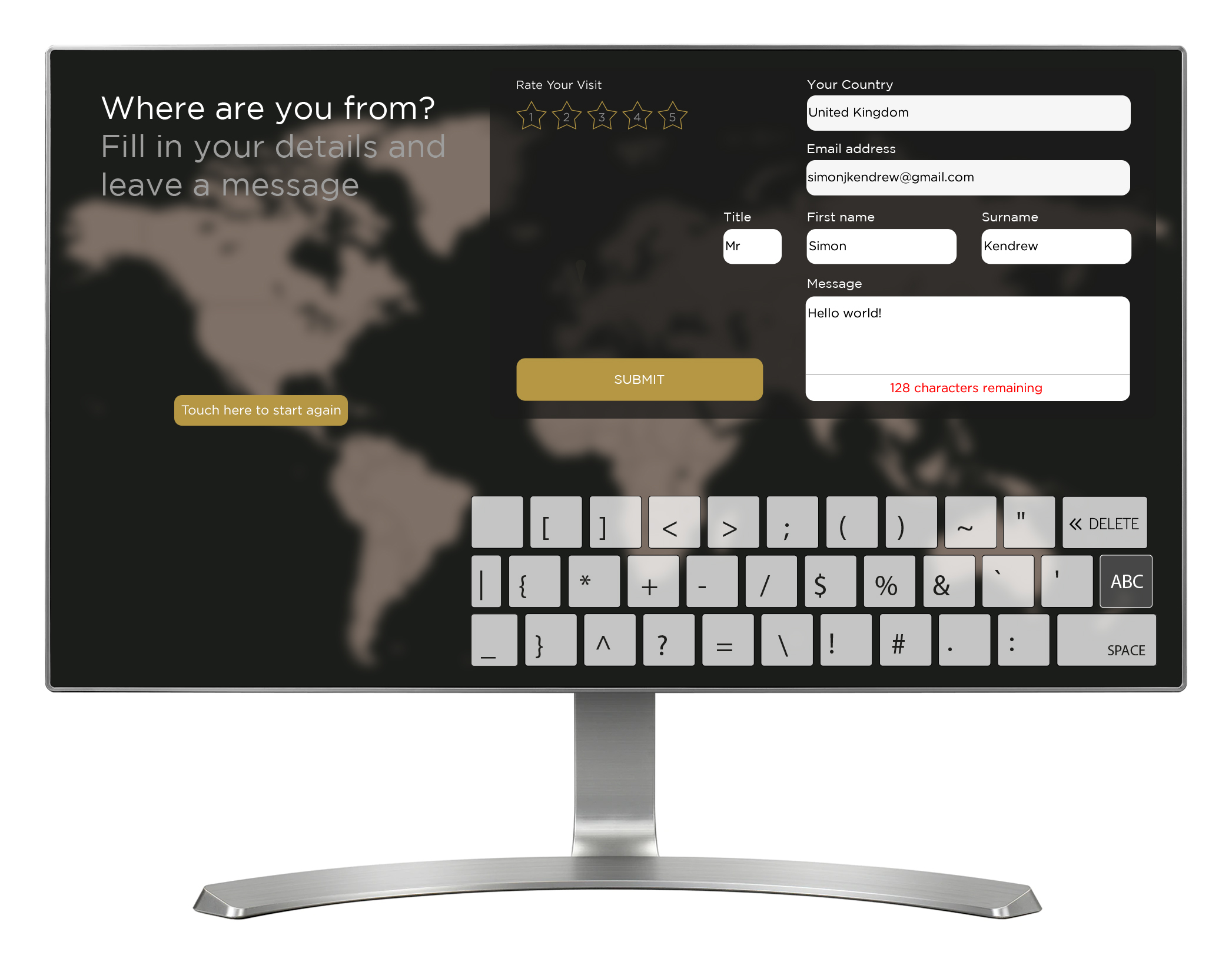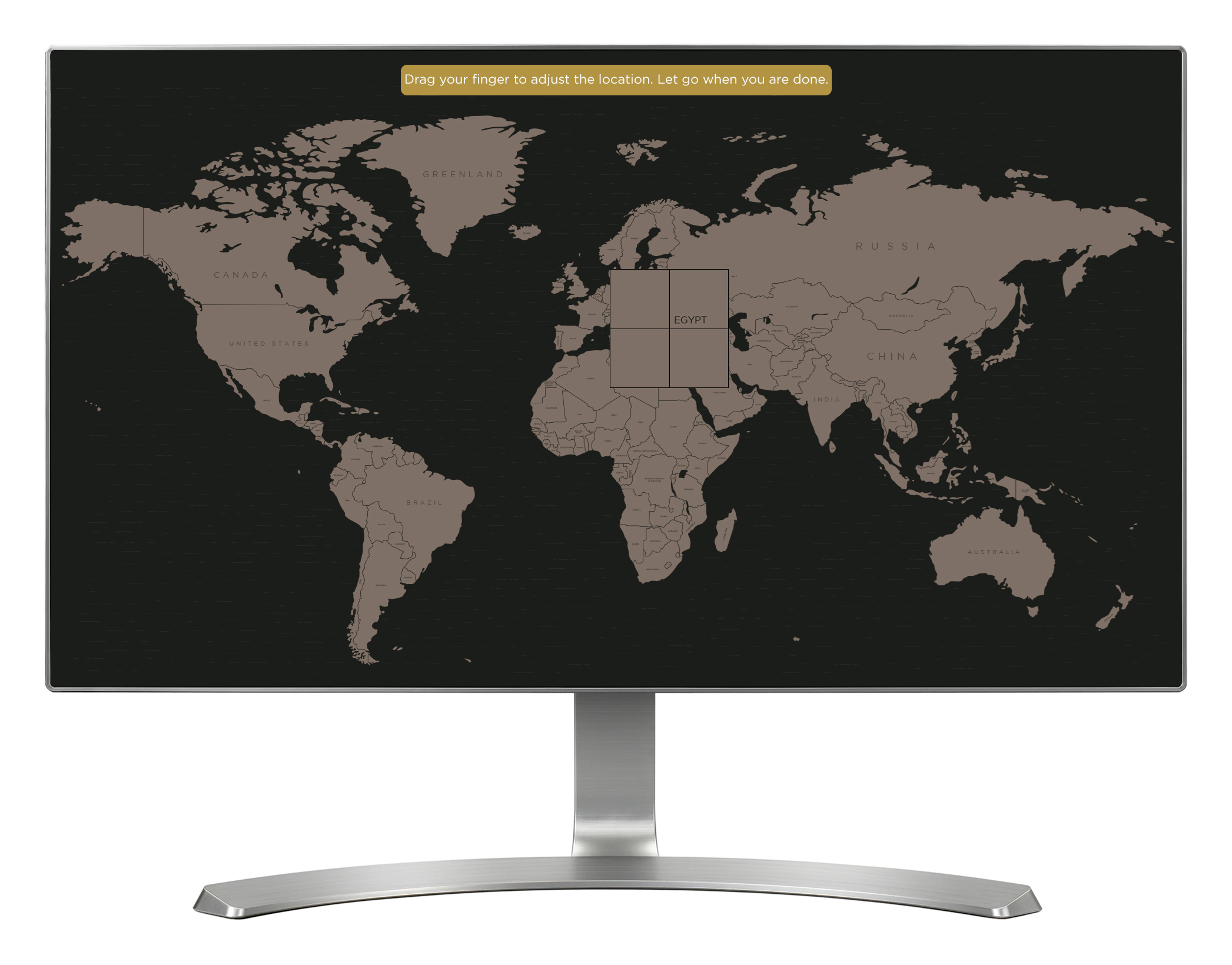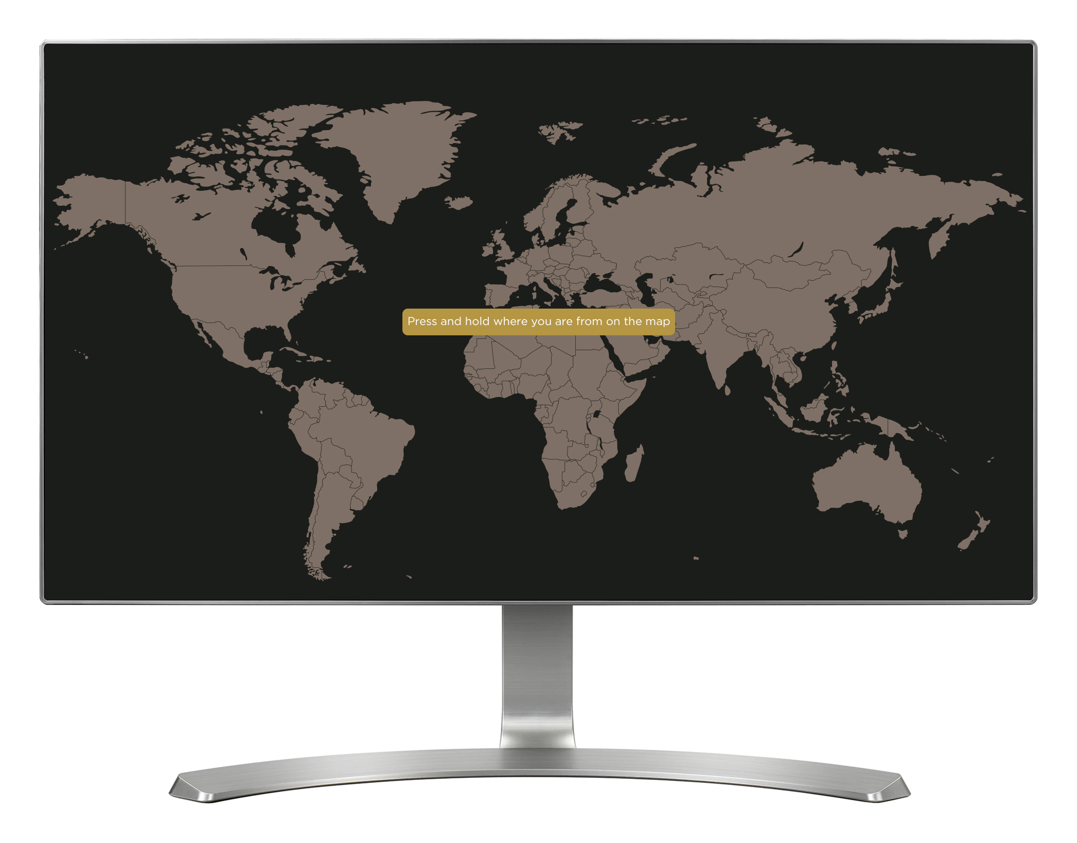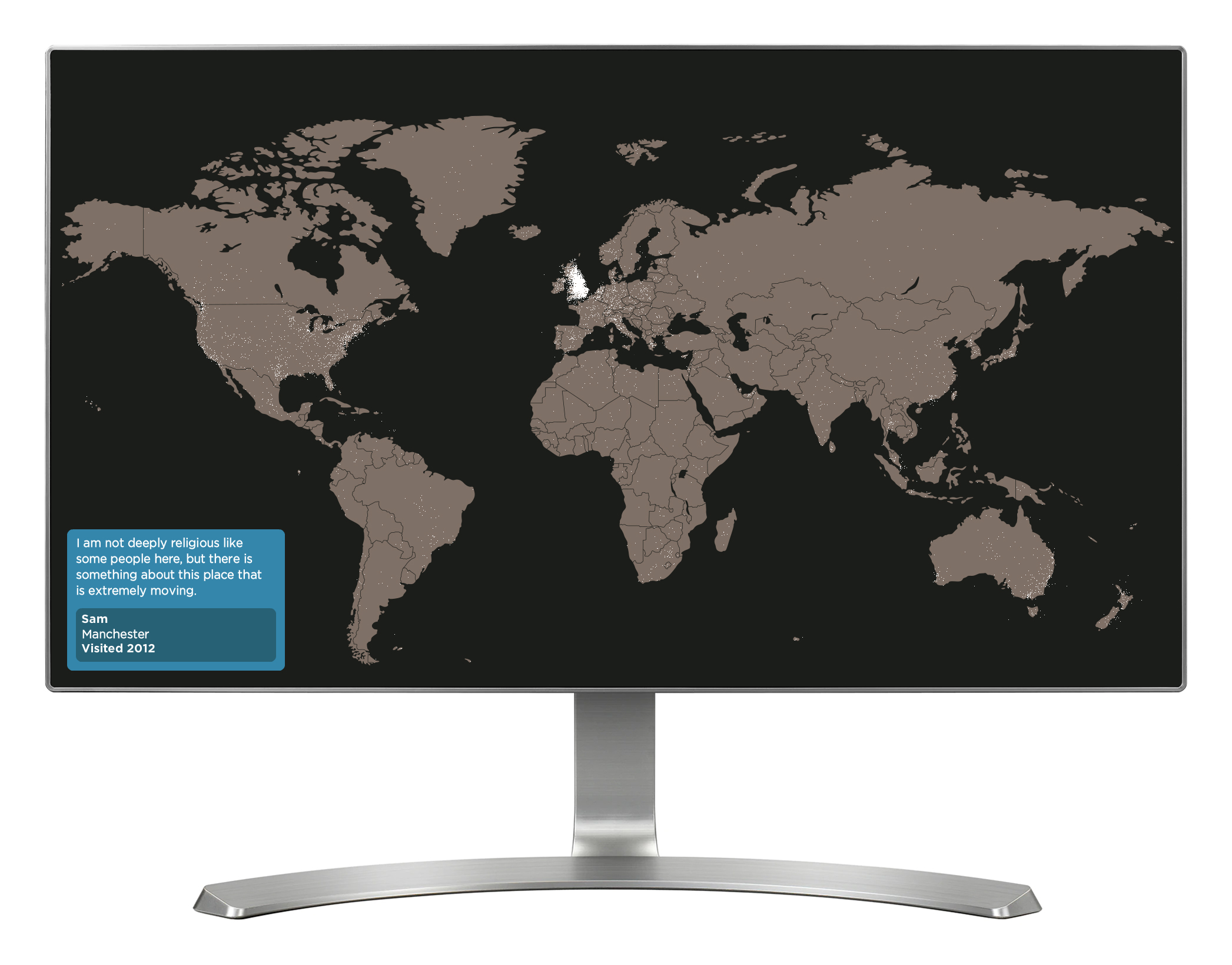 'Pilgrimage Today' allows visitors (or pilgrims) to the exhibition to add their details to a wall-projected world map, and then view details of other previous visitors. The interactive is installed on two touch screens, each located either side of the wall map. Two networked computers run each touch screen, and one of them additionally runs the wall projection. Visitors start by selecting their home town location on the touch screen, done by dragging a magnifying glass around the map until they have their location. Next up, visitors add their name, email address, home country and a short, personal message up to 140 characters. Visitors can optionally rate their visit to the exhibition from one to five stars. On submitting their details, the hometown location is added to the wall map as a white pixel, and the personal message is also displayed on the wall map, but only once in case it contains rude or offensive words. The message is saved so that it can be reviewed remotely by a staff member, and once approved it will be randomly shown again on the wall map (along with historical pilgrim messages). All inputted visitor data is saved locally, and can be extracted remotely later. The pilgrim messages that appear in the bottom left corner of the wall projection are controlled through a CMS, and cycle between historical pilgrim messages and approved visitor messages.