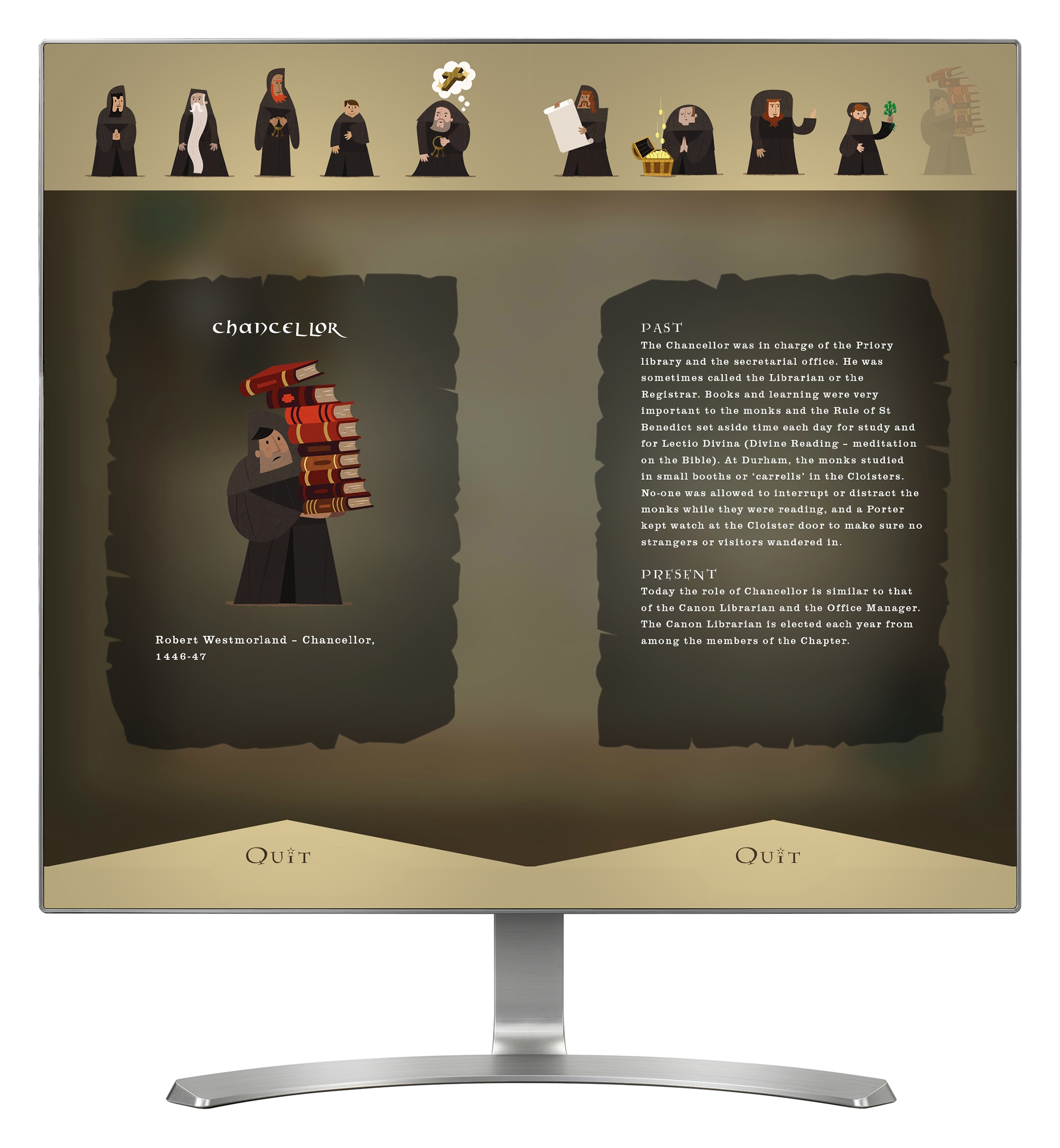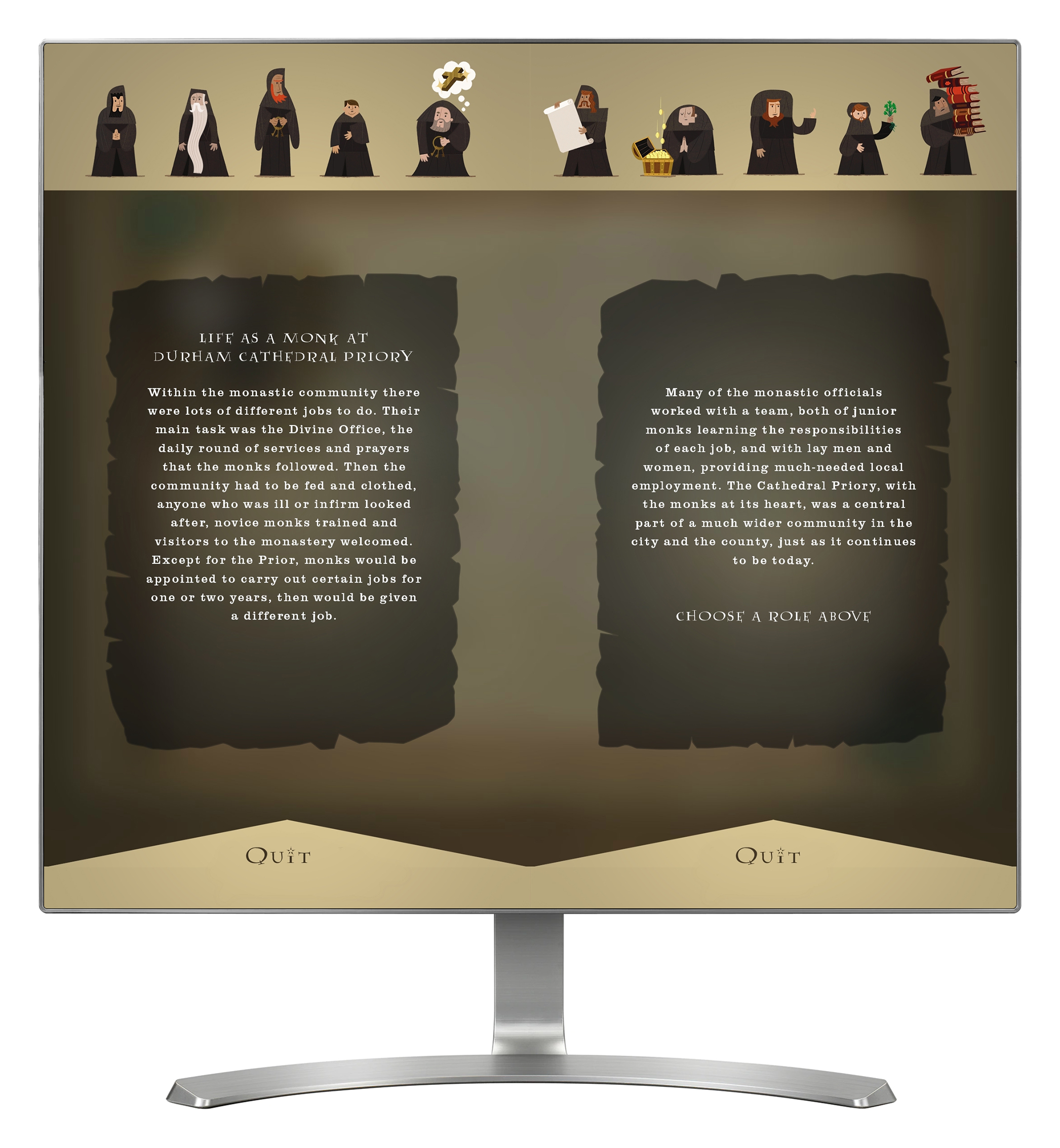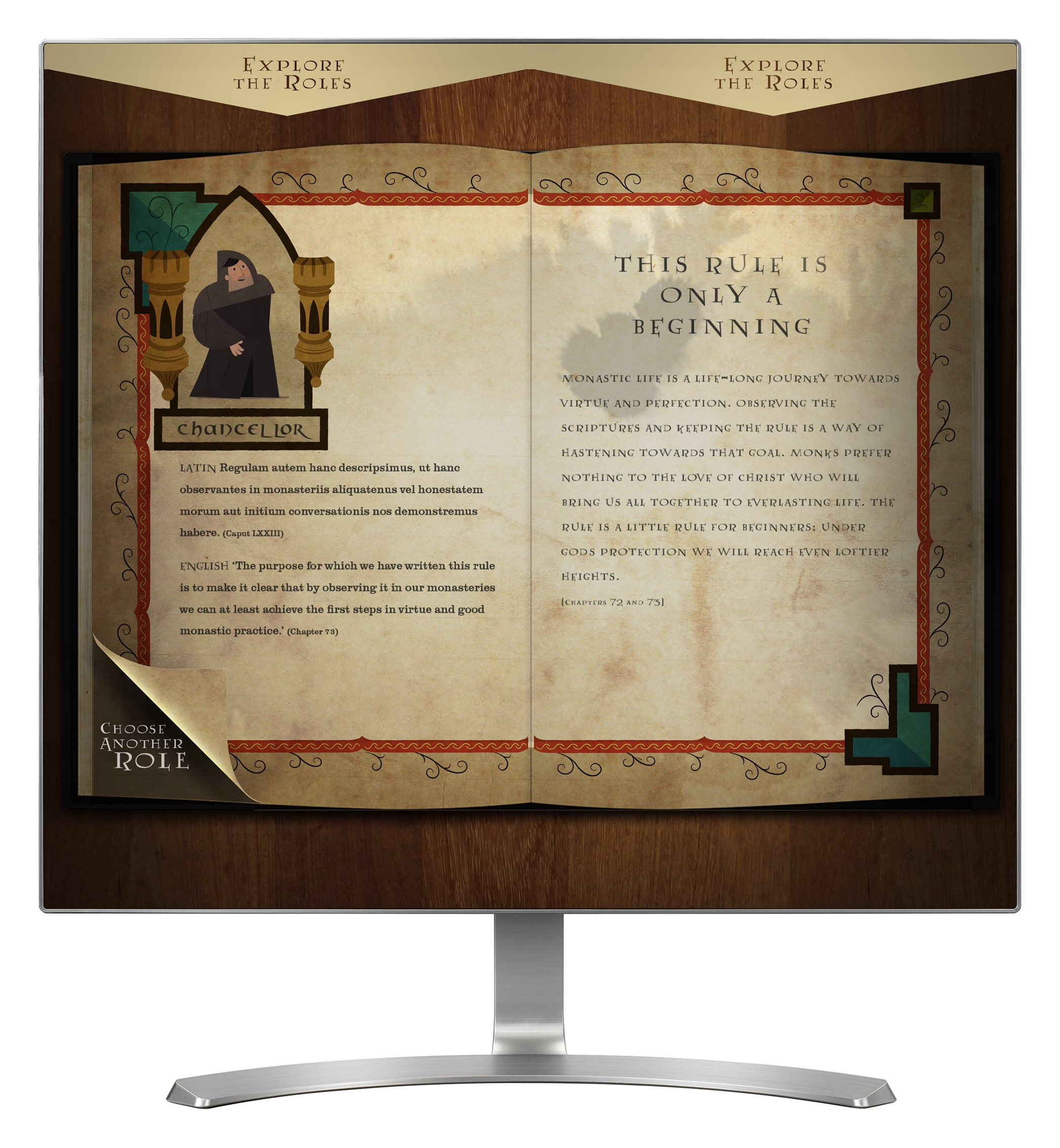 'Benedictine Rule' offers a glimpse into the daily life of monks, through 10 different illustrated and animated monks, each having a different role. The interactive is presented as an illuminated manuscript, and is accessed via two touch screens on the same computer, each screen representing one page, or side of the book. Selecting a monk turns the page to provide a little more information about their role. For each role there is also an option to dig a little deeper and find out more, including how the role differs today from the past.