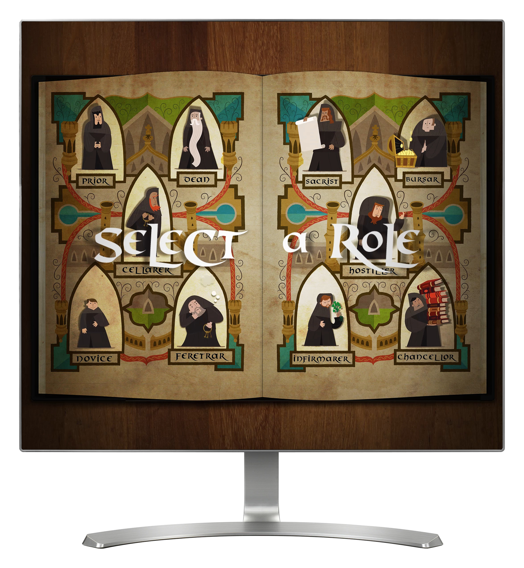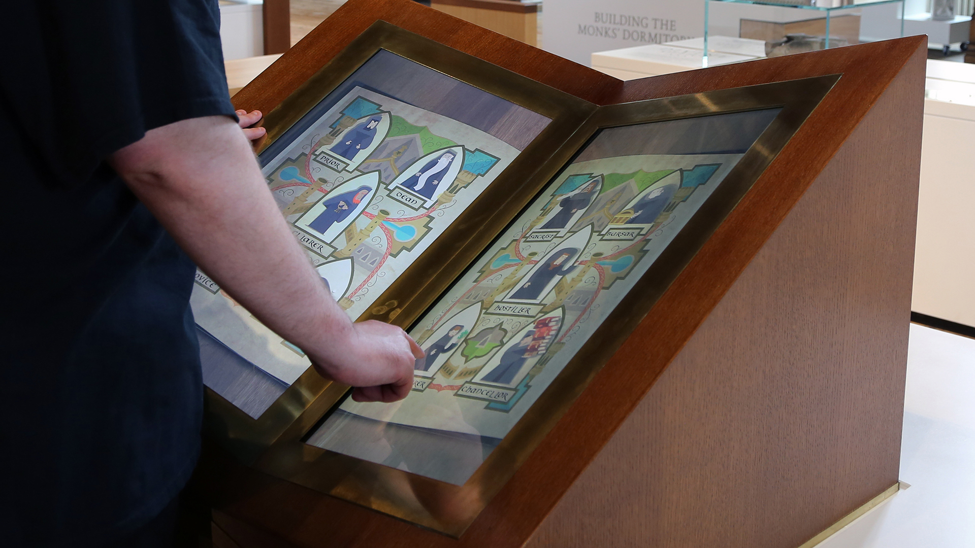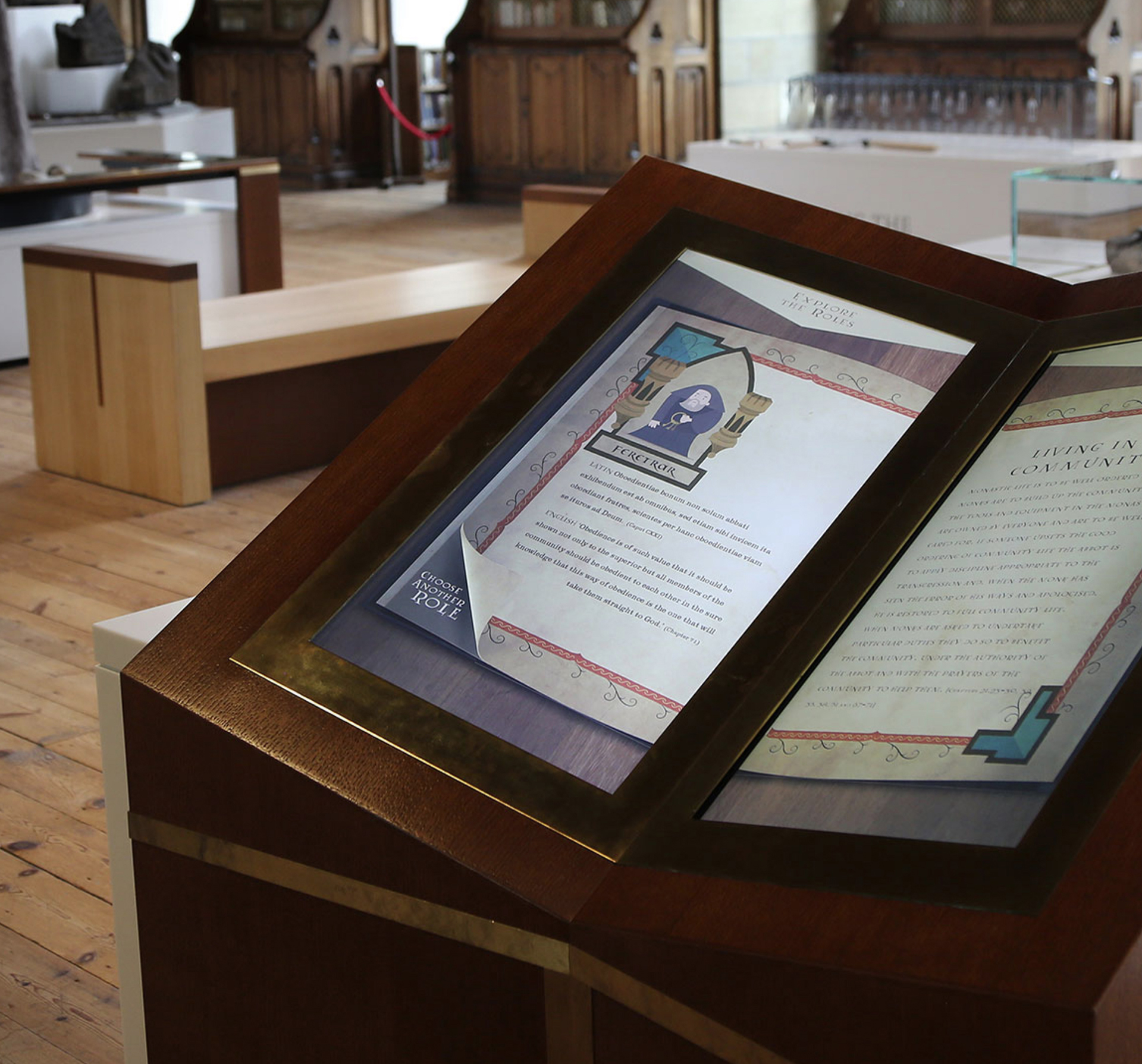 'Benedictine Rule' offers a glimpse into the daily life of monks, through 10 different illustrated and animated monks, each having a different role. The interactive is presented as an illuminated manuscript, and is accessed via two touch screens on the same computer, each screen representing one page, or side of the book. Selecting a monk turns the page to provide a little more information about their role. For each role there is also an option to dig a little deeper and find out more, including how the role differs today from the past.