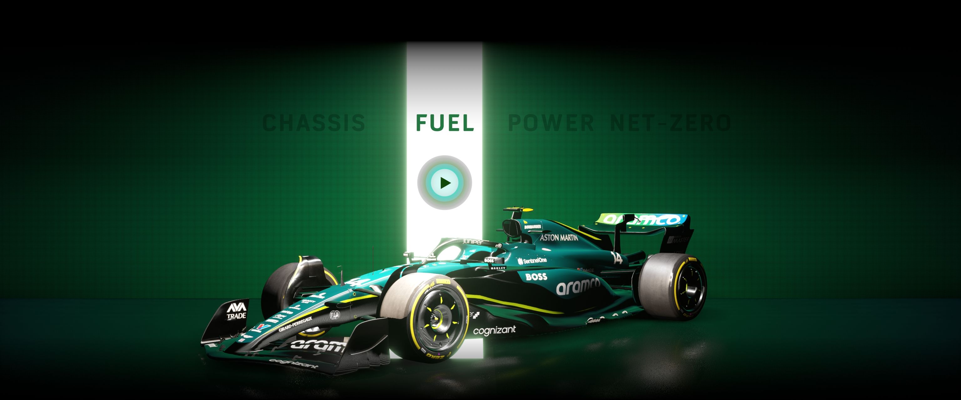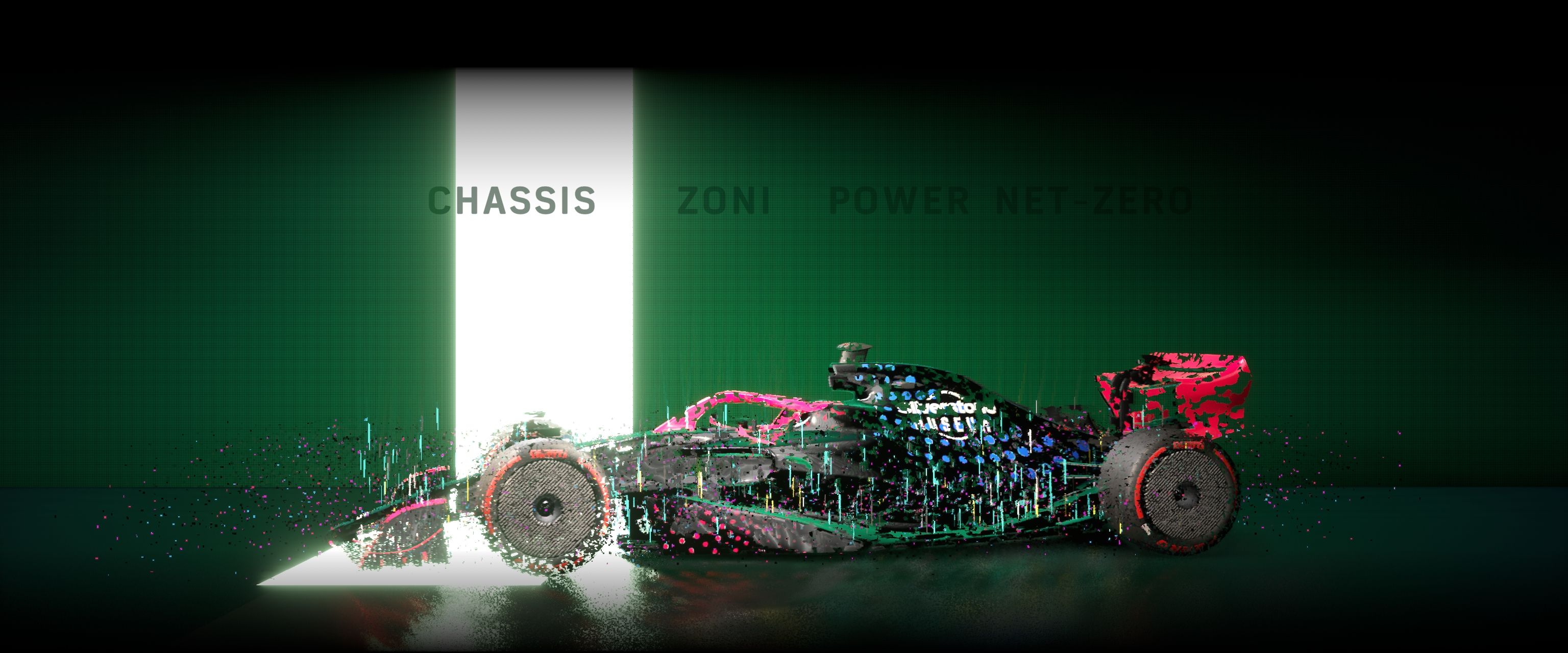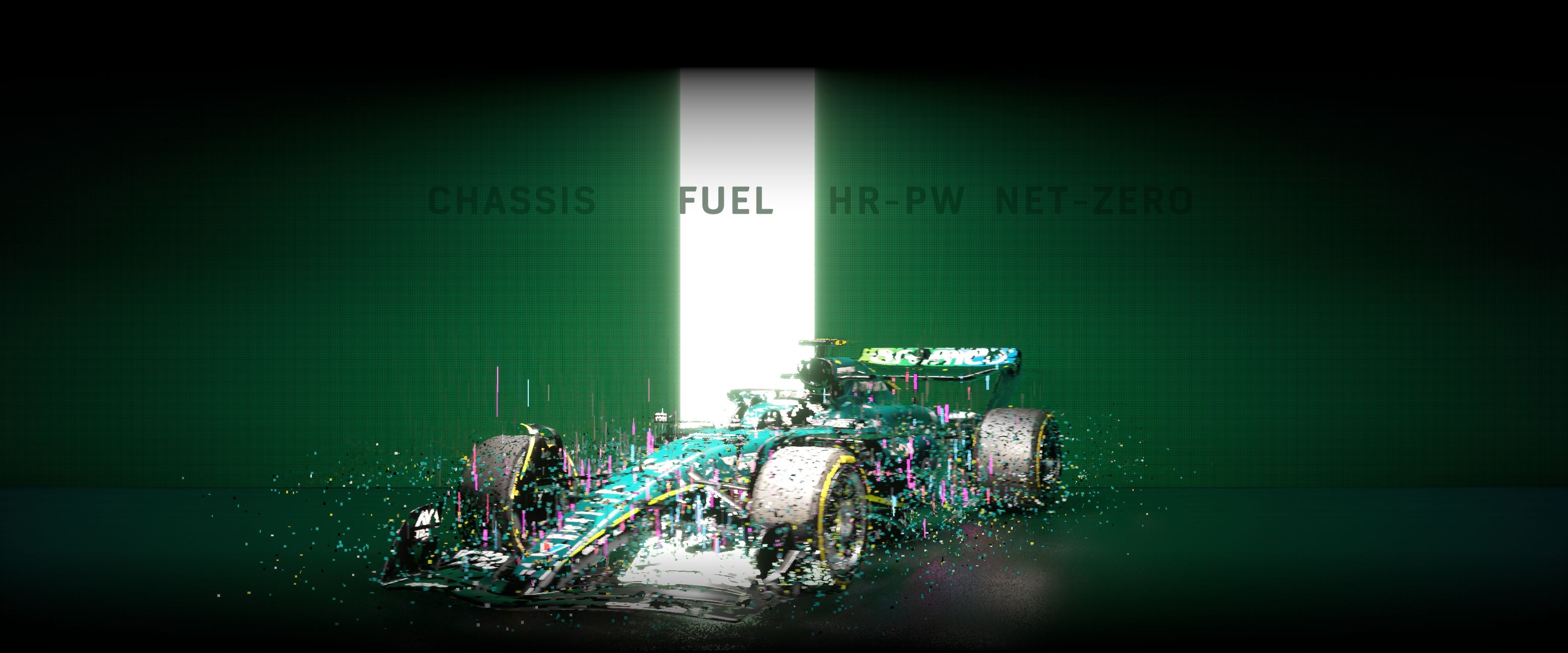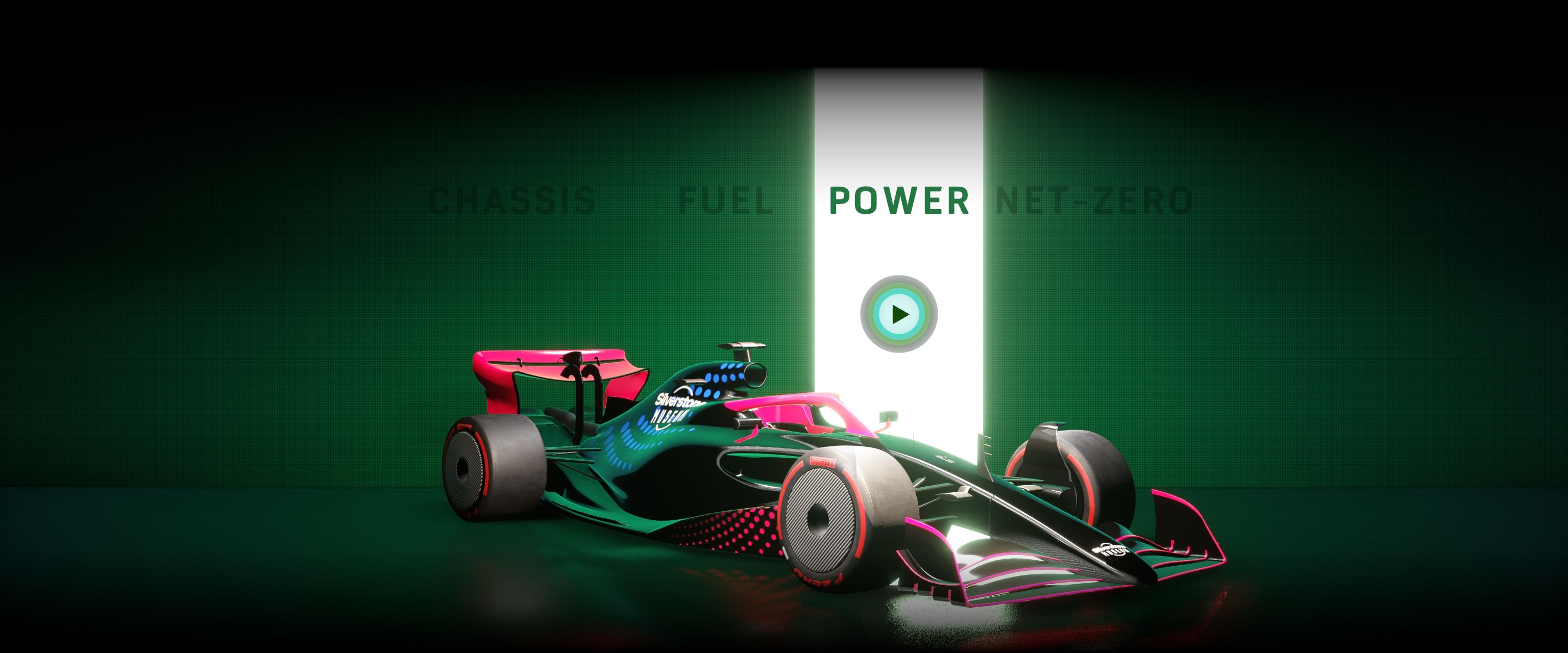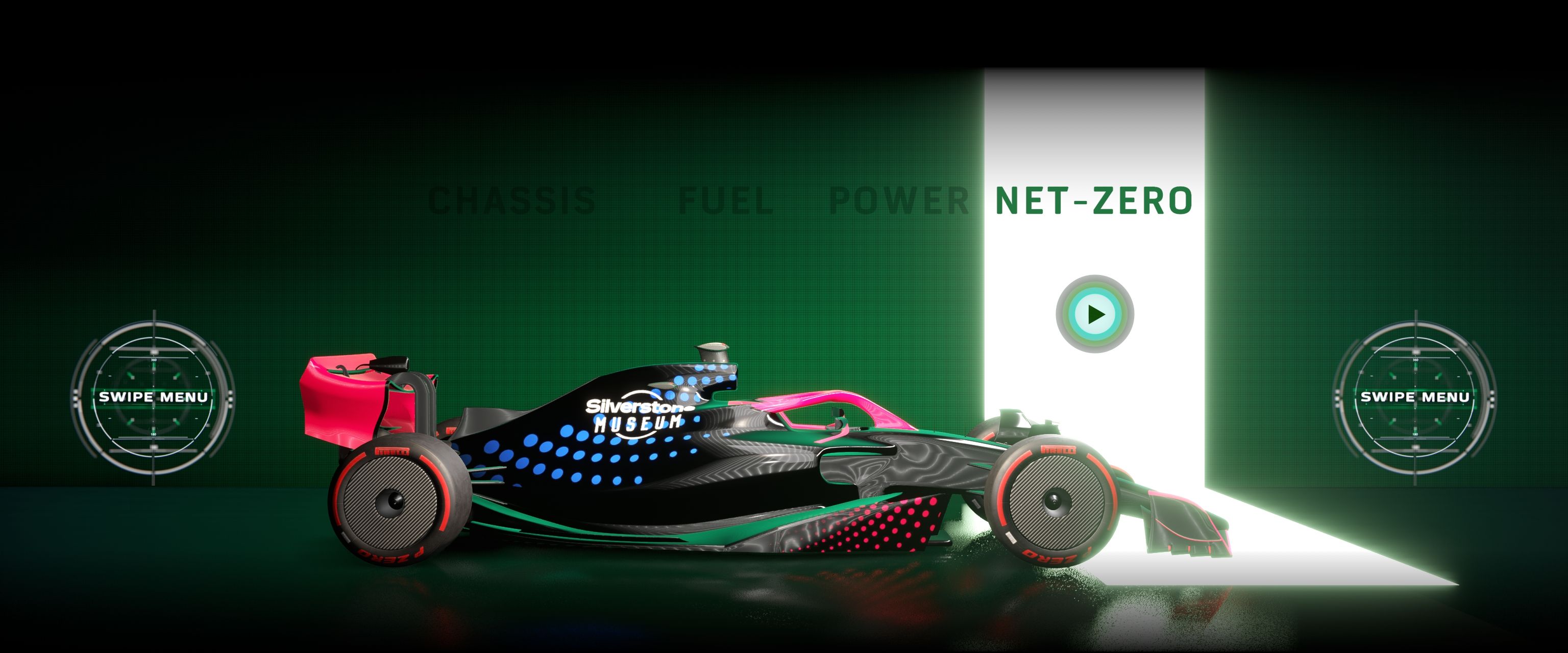 Interacting with the screensaver transitions seamlessly from the video to a real-time 3D formula one car, rendered using HDRP. Visitors can now swipe left and right to rotate the car between four menu options: power, chassis, fuel and net-zero. The 3D car changes between different models on some of these options, and I blended the transitions here by combining a dissolve shader and a Visual Effect Graph particle effect, both of which I created.