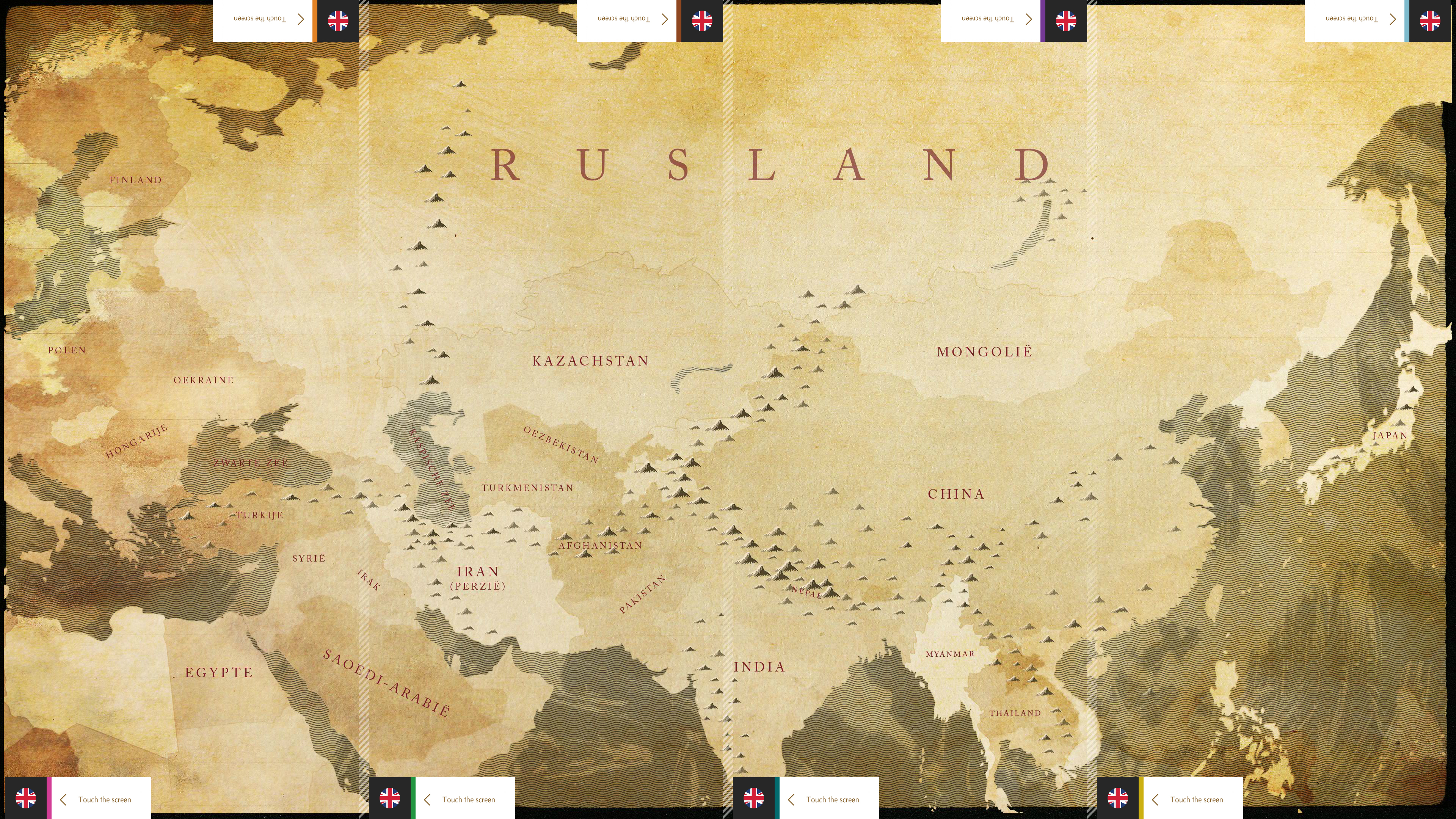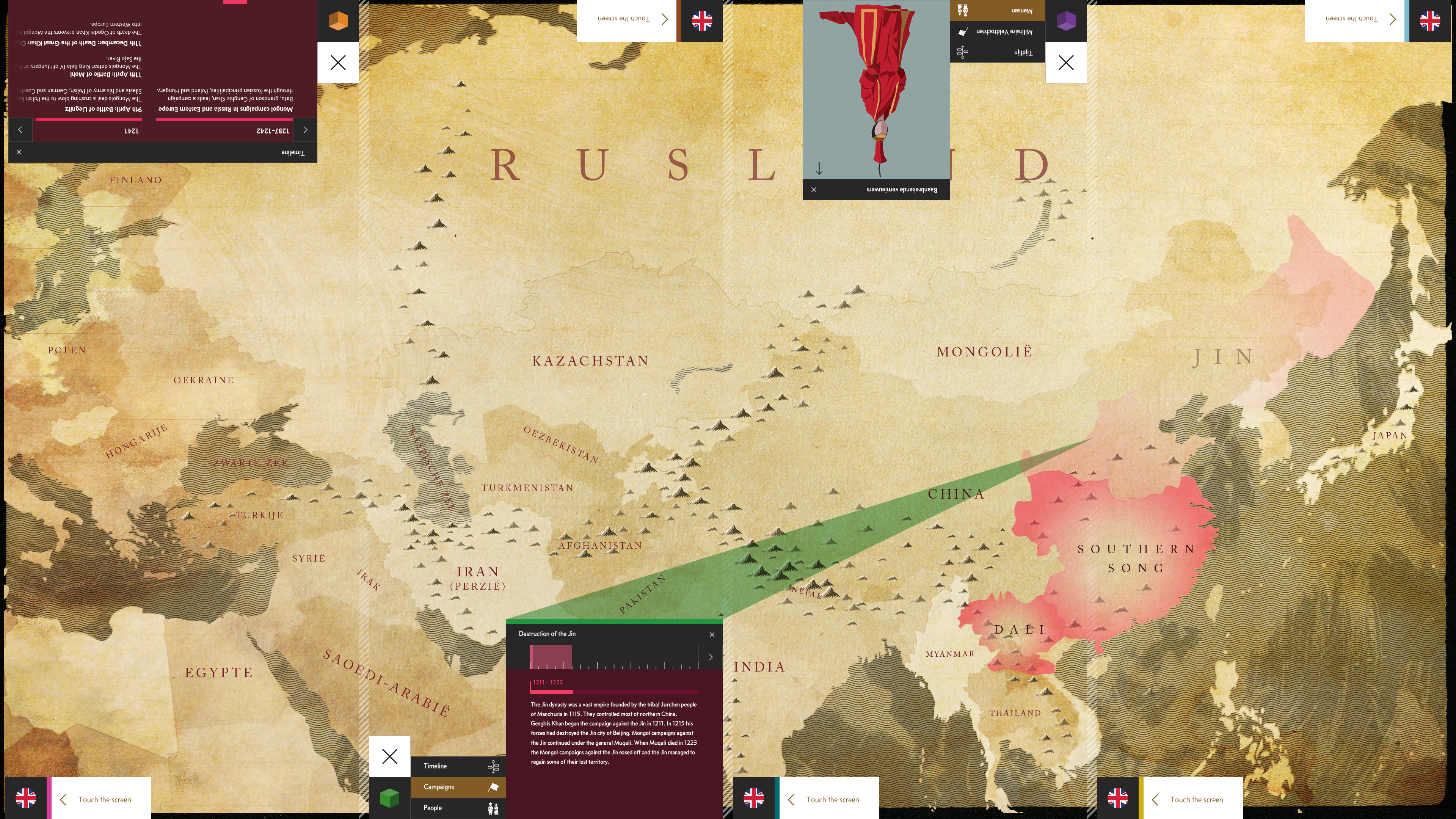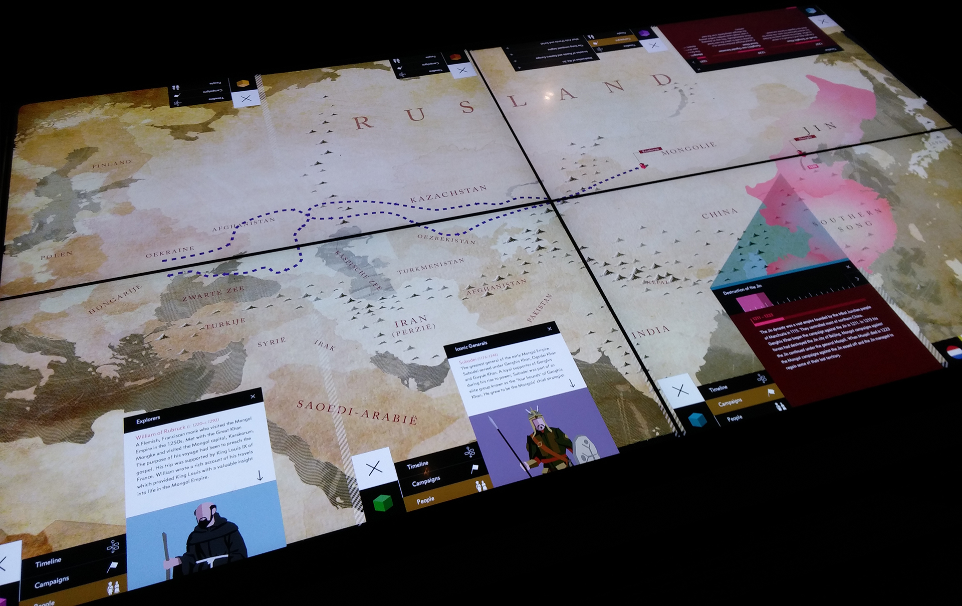 'The Mongol Empire' is a multi-touch table that allows up to eight users to simultaneously explore a map of the Mongol Empire. Displayed across four screens, the installation is approx 90" in size and shows Asia, Eastern Europe and The Middle East. There are eight user interface (UI) 'stations' around the map, each providing access to the same options and information. Visitors can discover the key people in Mongol history; some of these were explorers and their journeys are shown on the map. There are four major military campaigns to explore, each broken down into bite size chapters and animated across the map. There is also a comprehensive timeline that covers the key events. When visitors view content that links onto the map, each UI station has it's own accent colour that helps reinforce the link to that content.