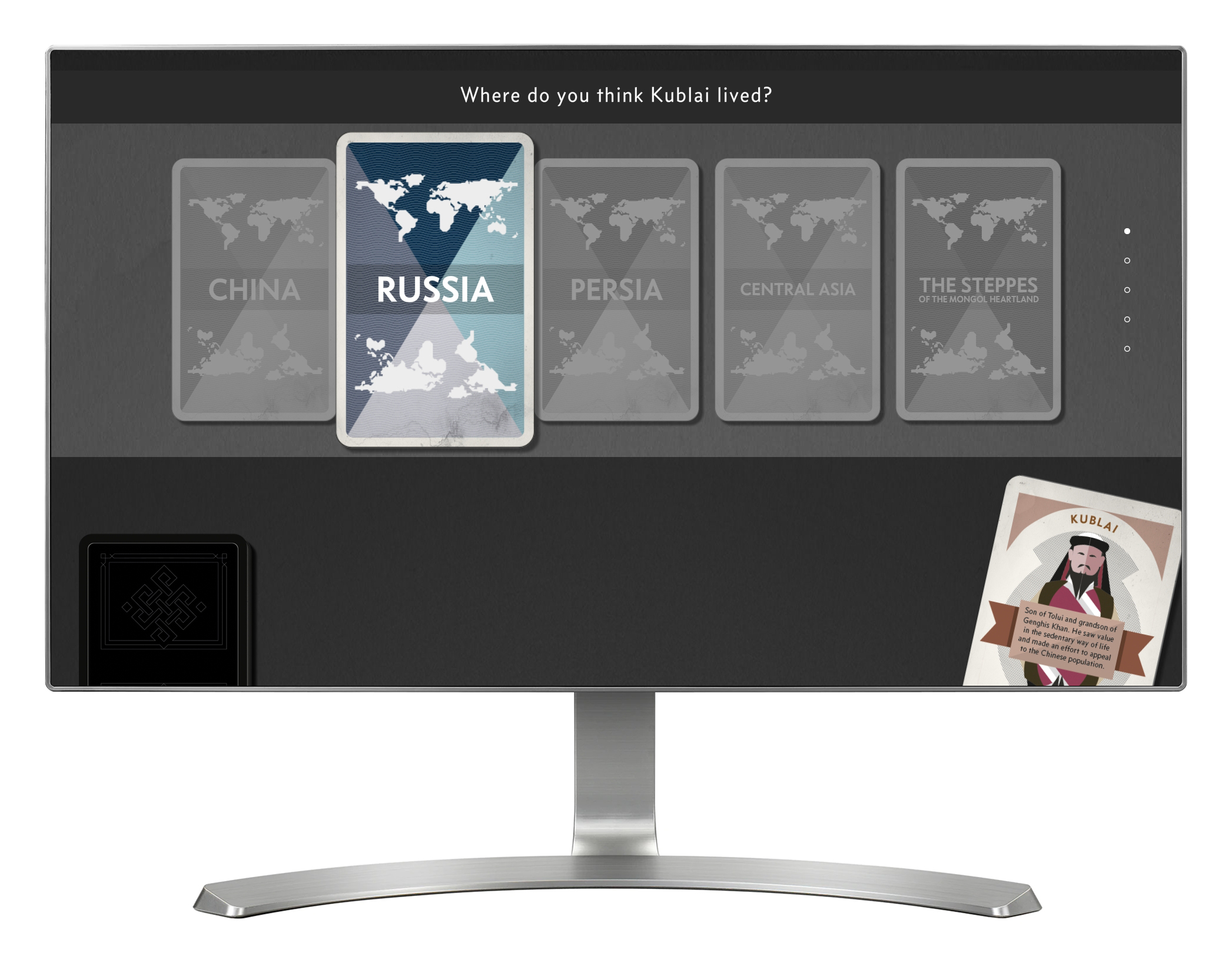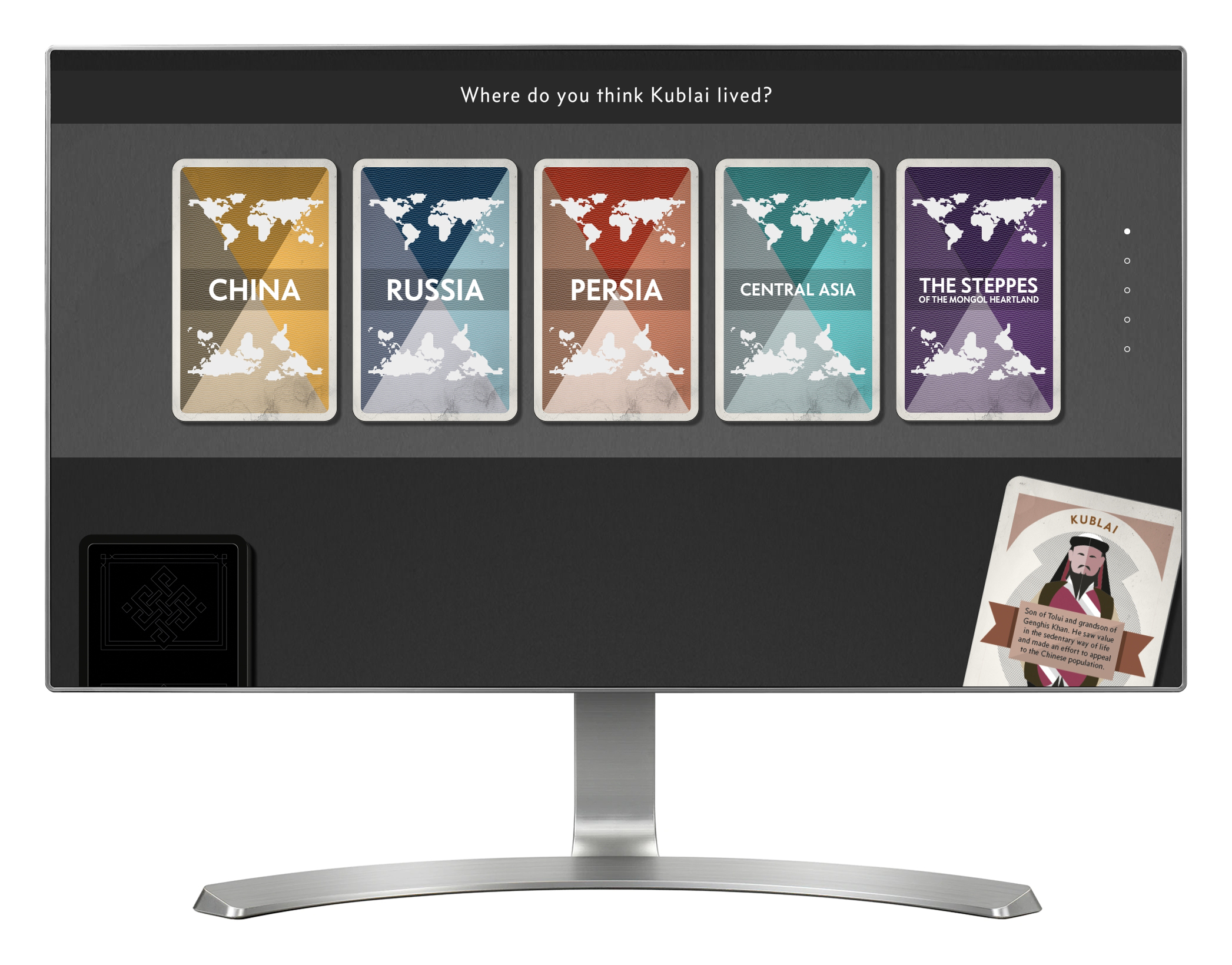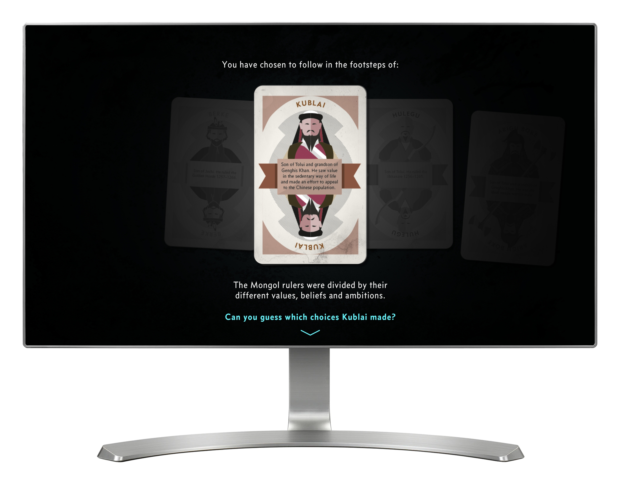 'House of Khans' is installed on two separate touch screens and is presented in a playing card style. Visitors choose one of the great Khans from history and have to answer questions about them. At the end of the game, players find out which questions they answered correctly, and are presented with short facts about each question.