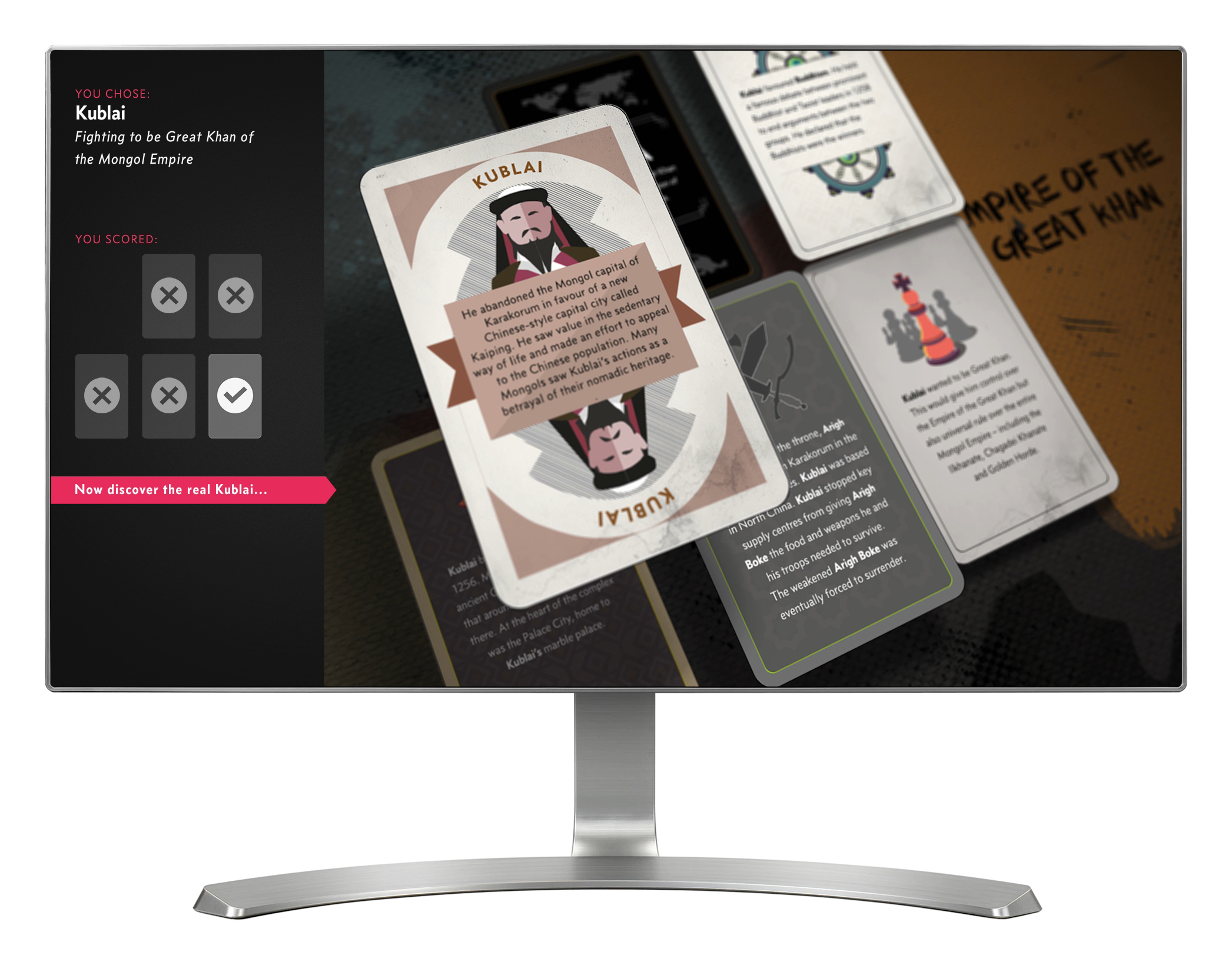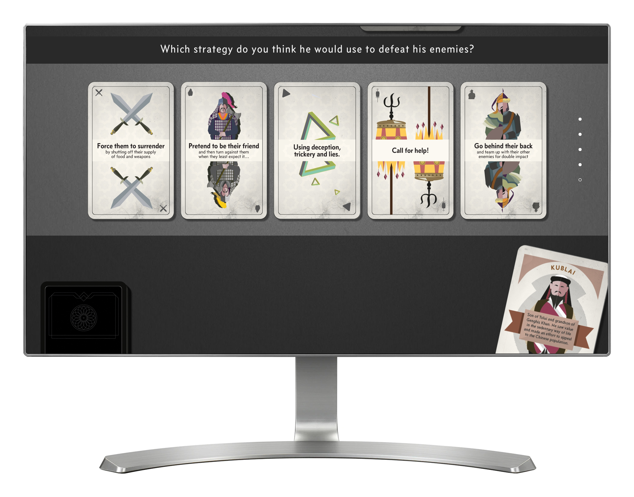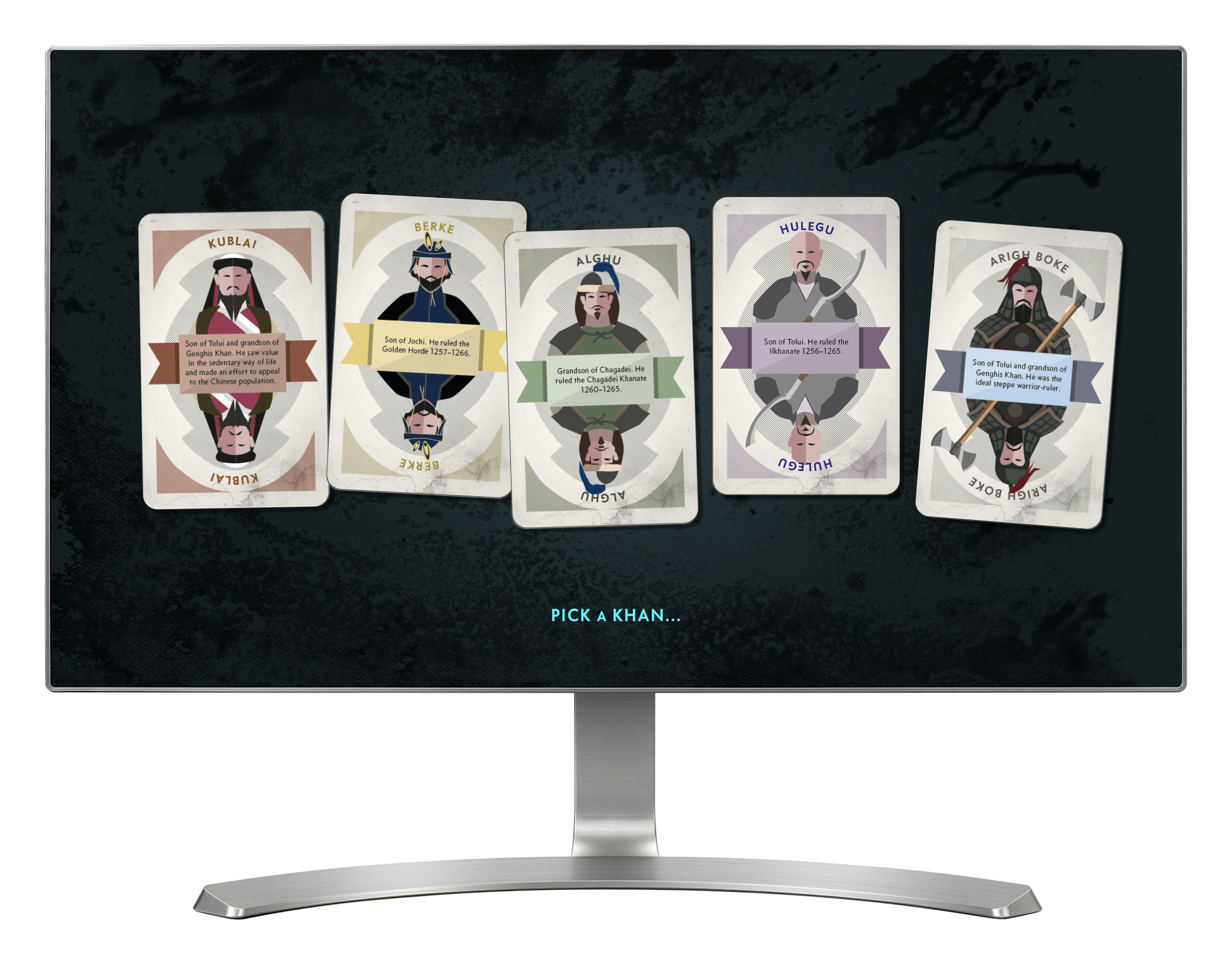 'House of Khans' is installed on two separate touch screens and is presented in a playing card style. Visitors choose one of the great Khans from history and have to answer questions about them. At the end of the game, players find out which questions they answered correctly, and are presented with short facts about each question.