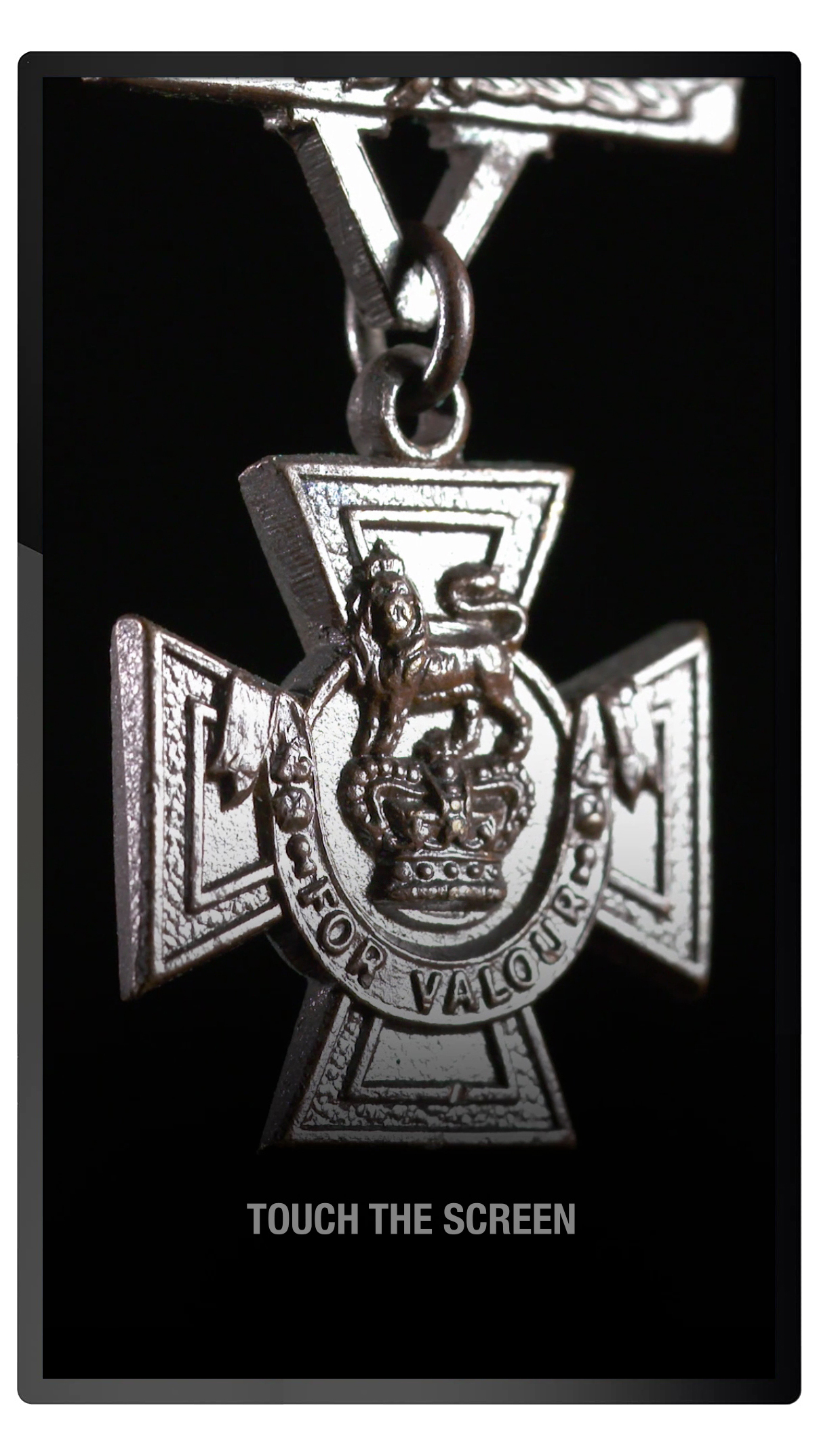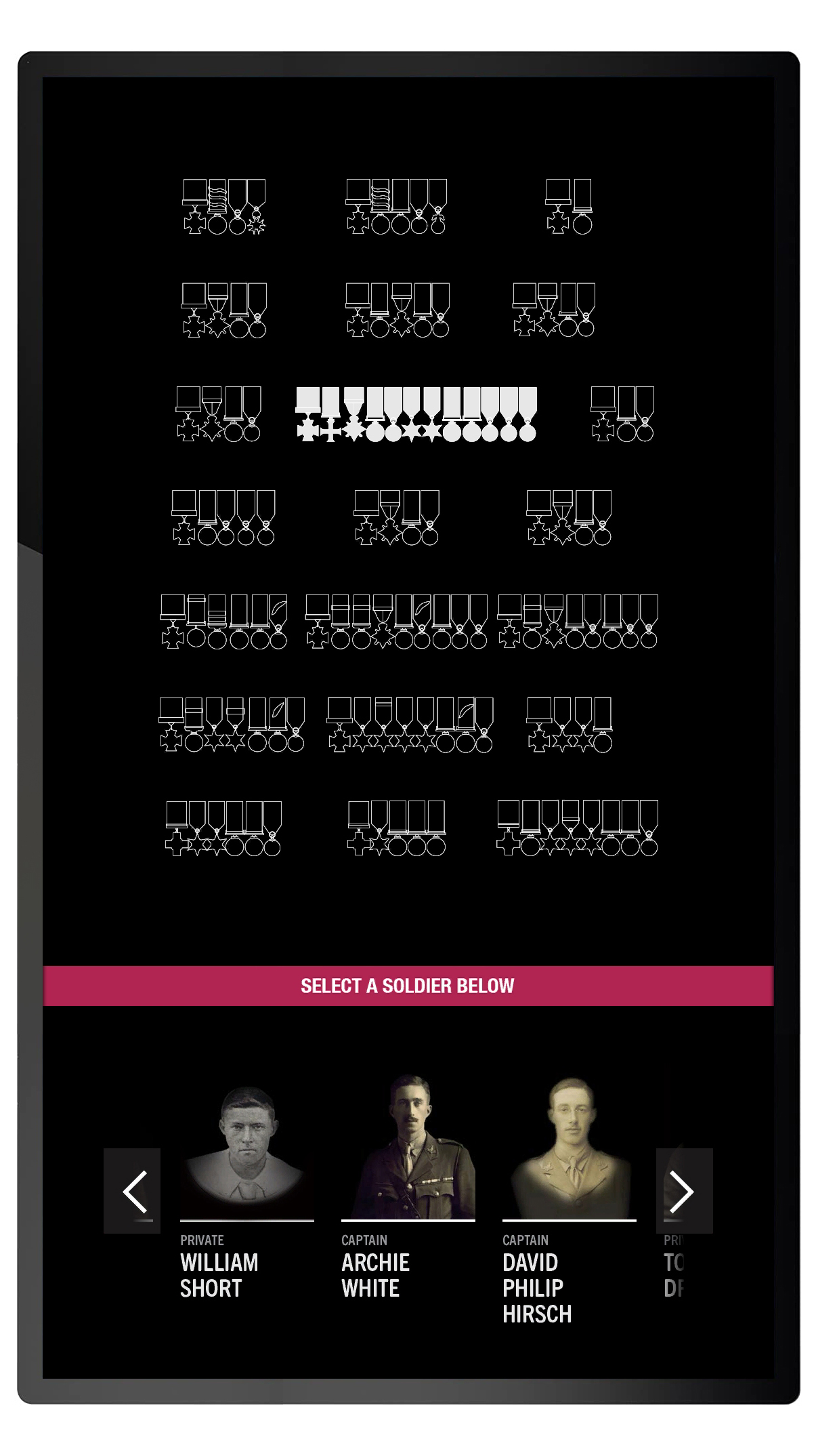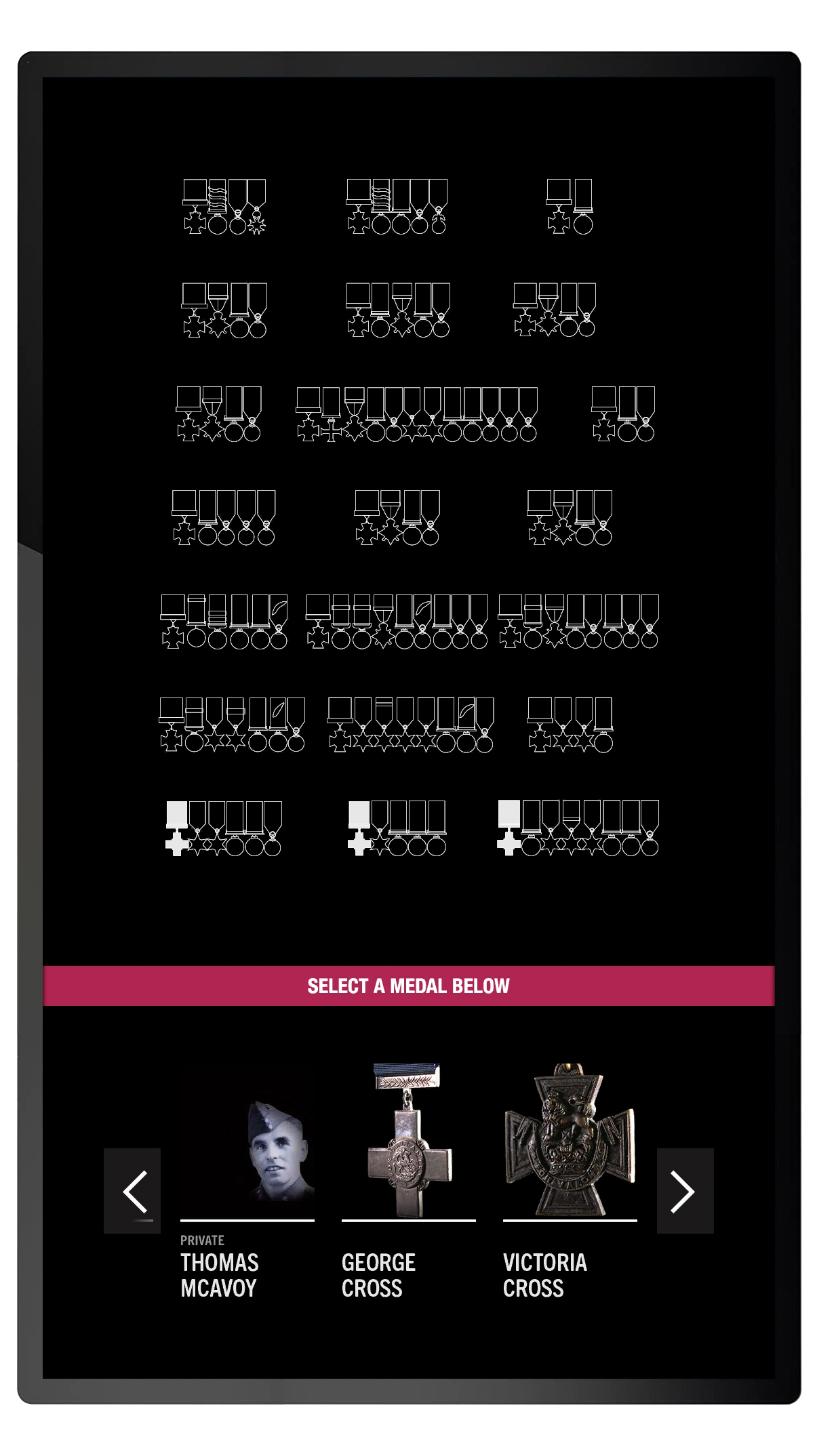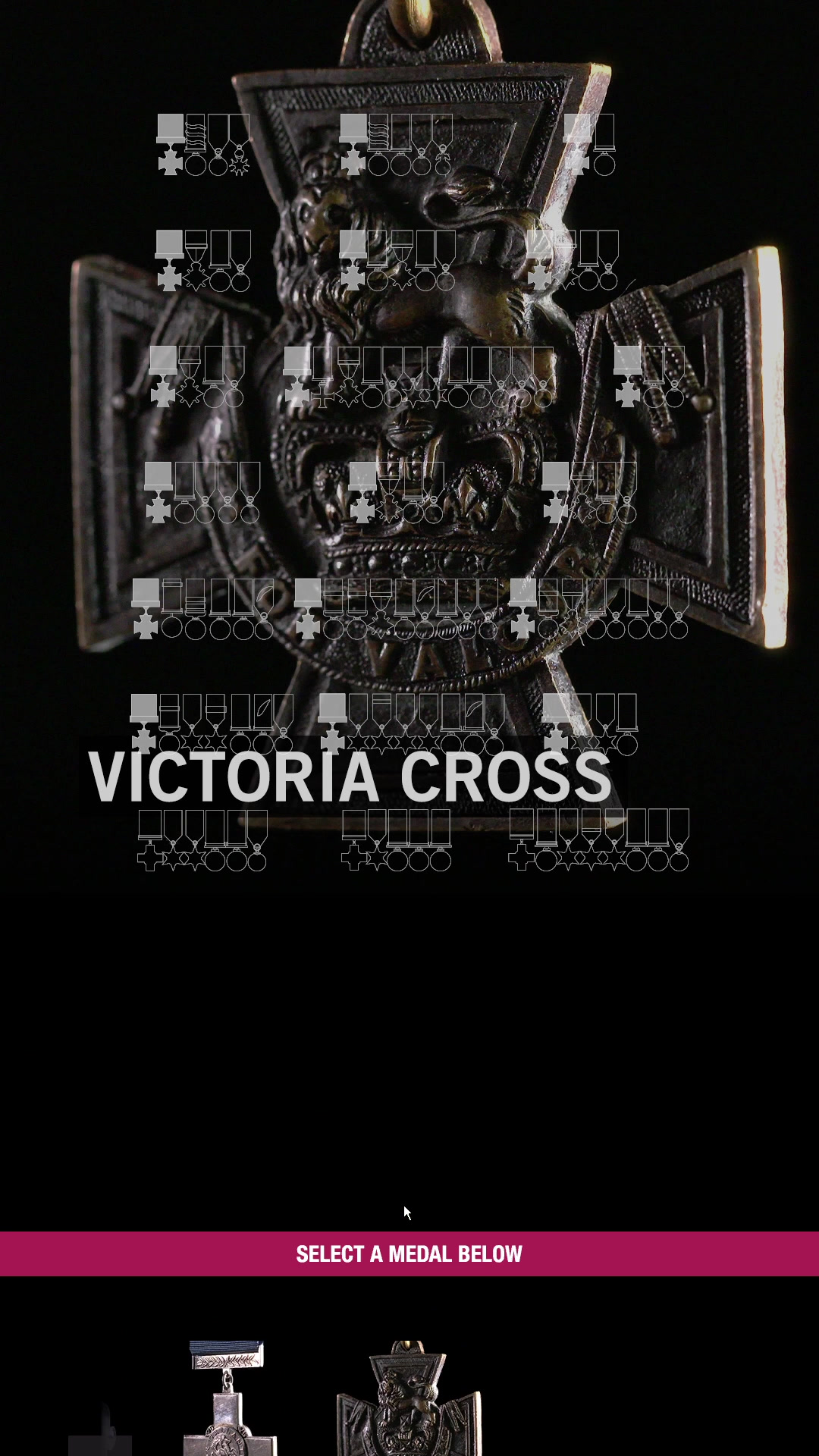 The soldiers and stories are navigated through an elegant menu that shows the medals for all 21 soldiers, as well as highlighting the individual George and Victoria Cross medals. The layout of the medals on the interface matches an adjacent display cabinet that contains the real medals.