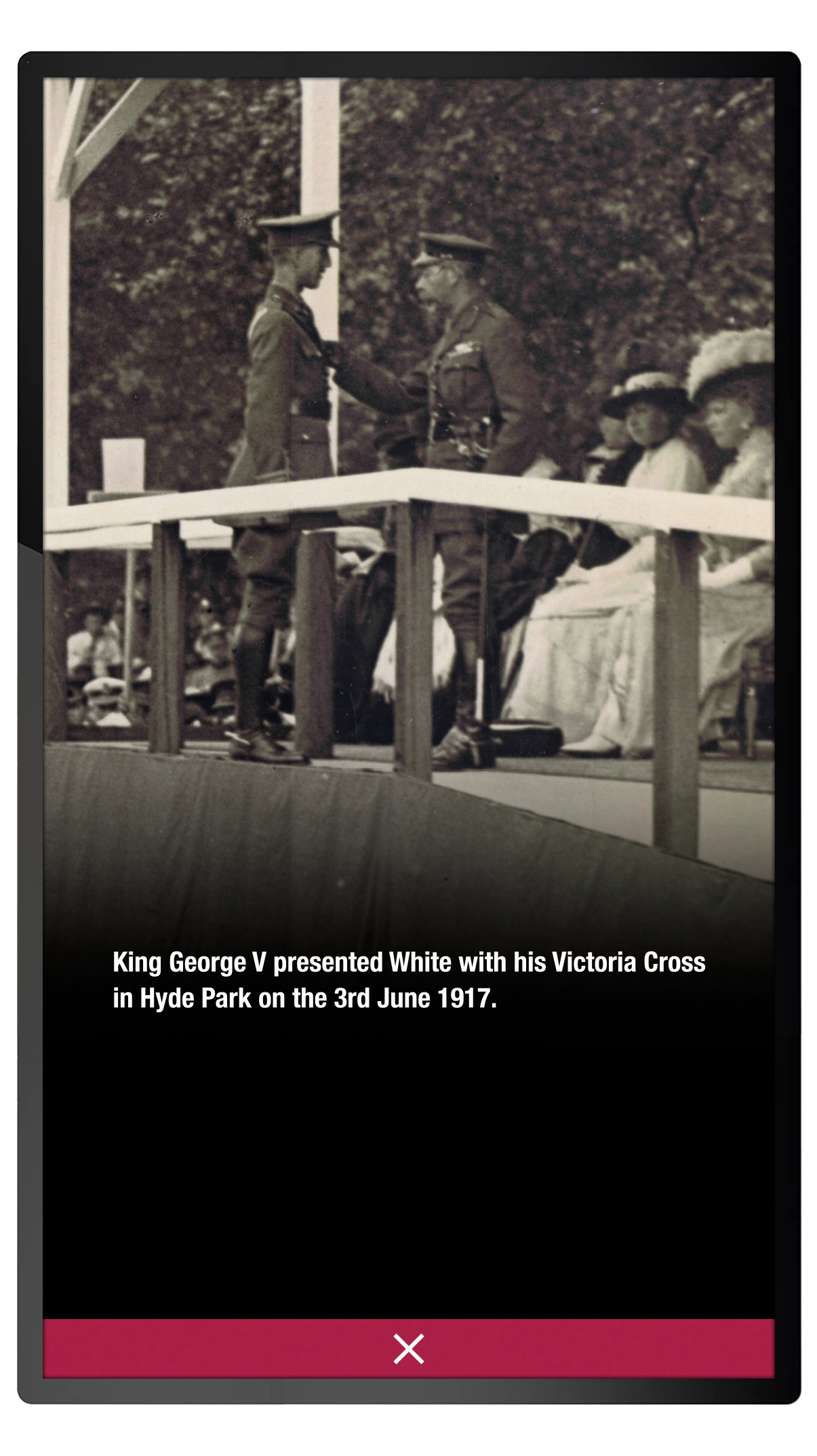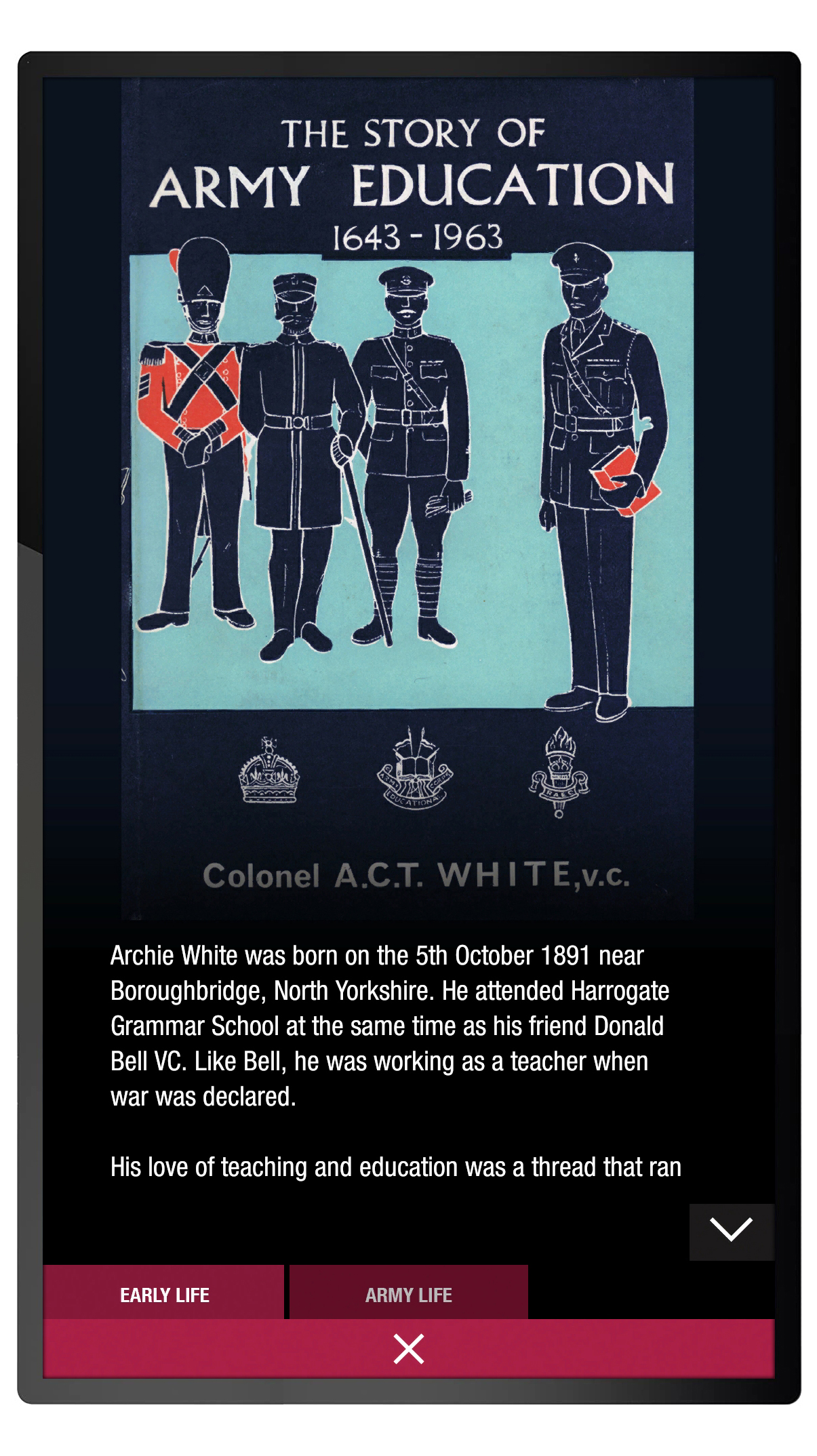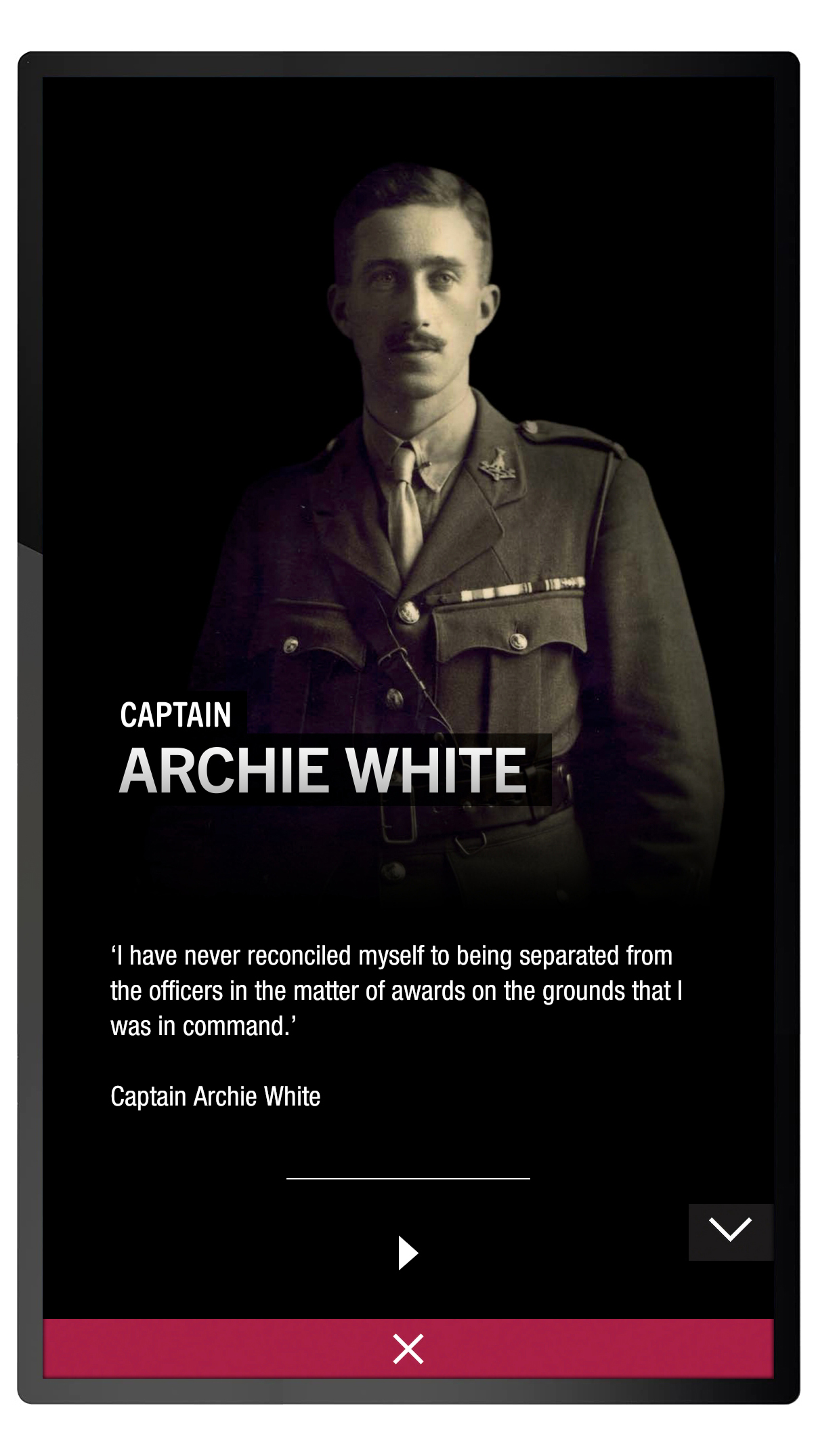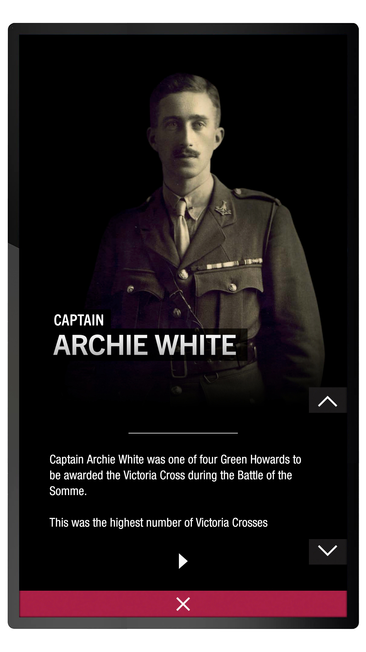 The soldiers and stories are navigated through an elegant menu that shows the medals for all 21 soldiers, as well as highlighting the individual George and Victoria Cross medals. The layout of the medals on the interface matches an adjacent display cabinet that contains the real medals.