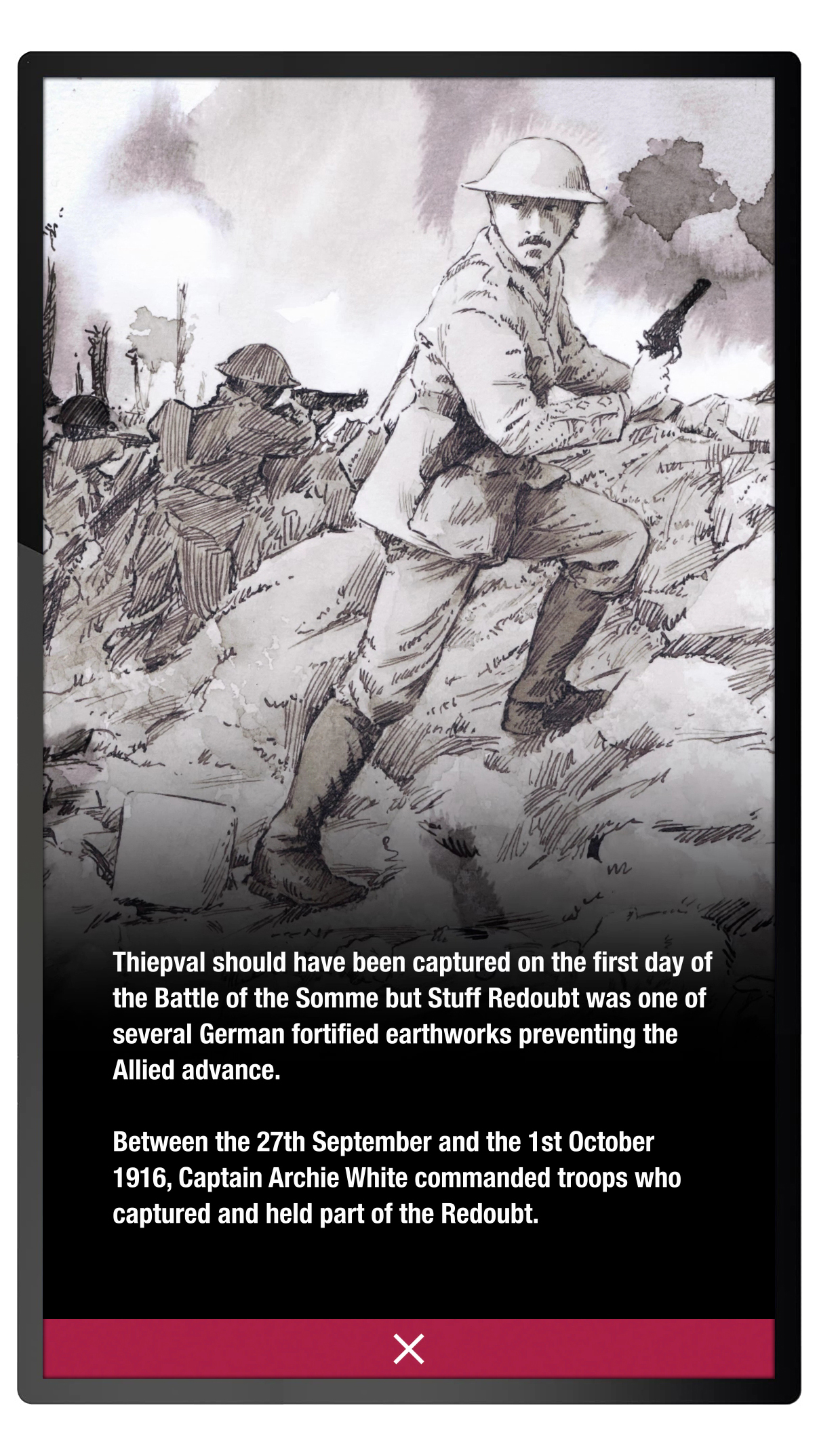 A key part of the exhibition is a large, portrait touch screen installation that tells the stories of 21 soldiers who have been awarded the George Cross or Victoria Cross. The stories range from the Crimean War to WW2, and are told through a combination of illustration, and written accounts of each soldiers early life before war, and their life during and after the war they fought in.