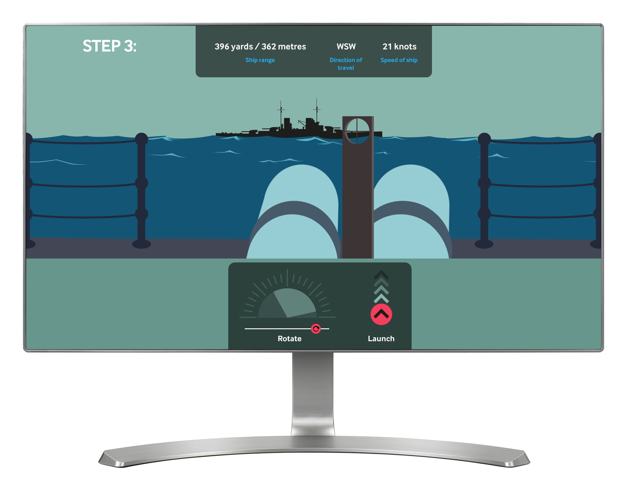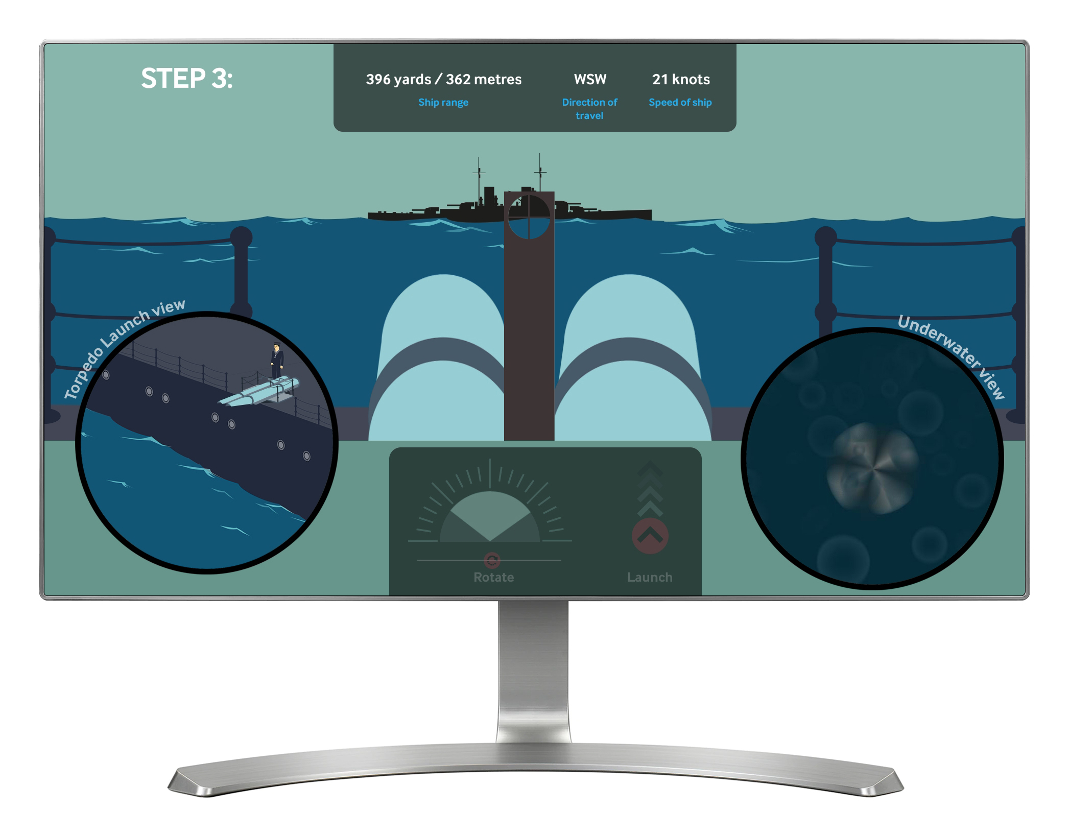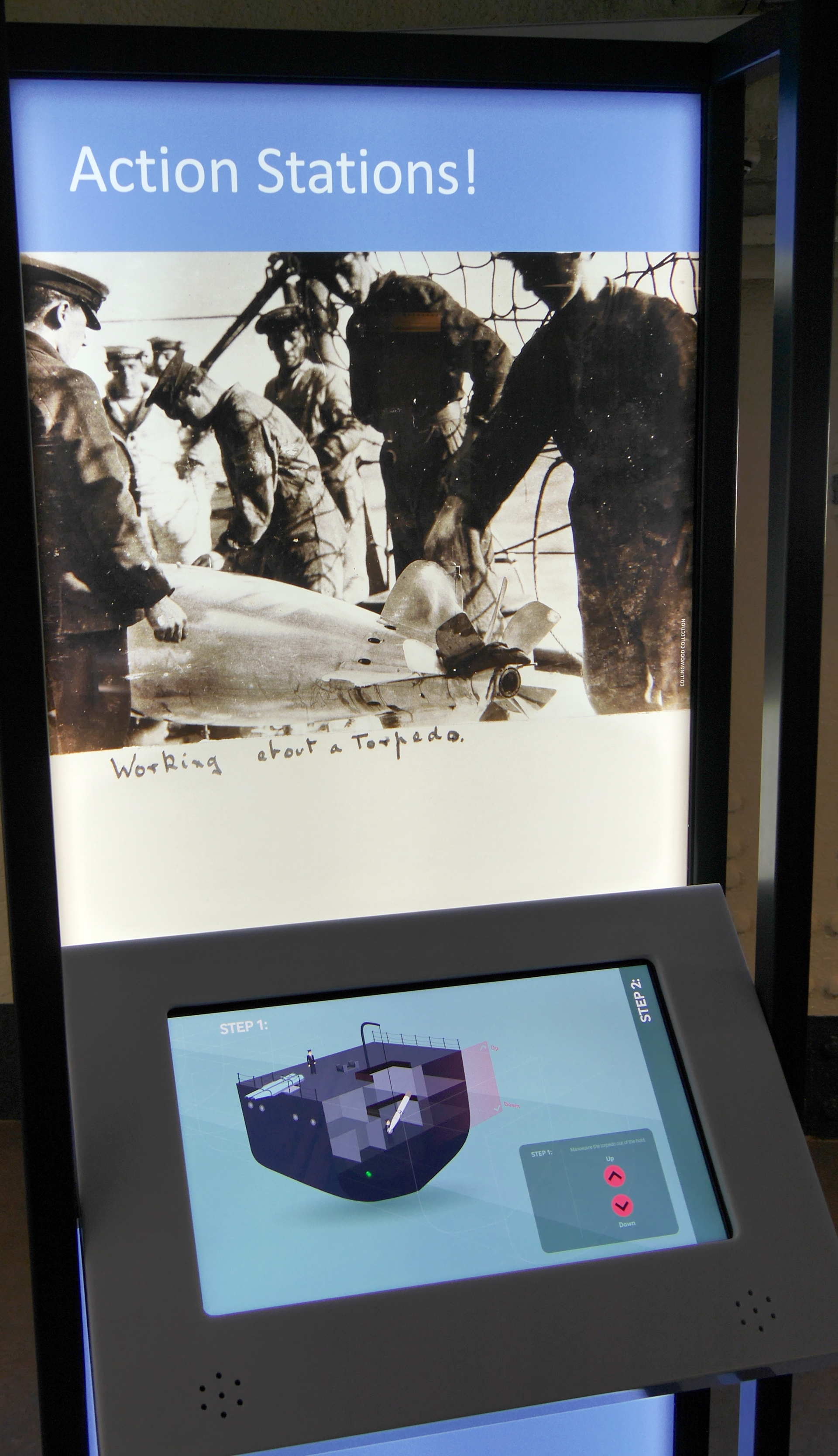 'Action Stations' is an illustrated and animated touch screen game in which visitors have to manoeuvre a torpedo from the ships store, through the ship and onto a launcher, and then take aim and fire it at an enemy ship.