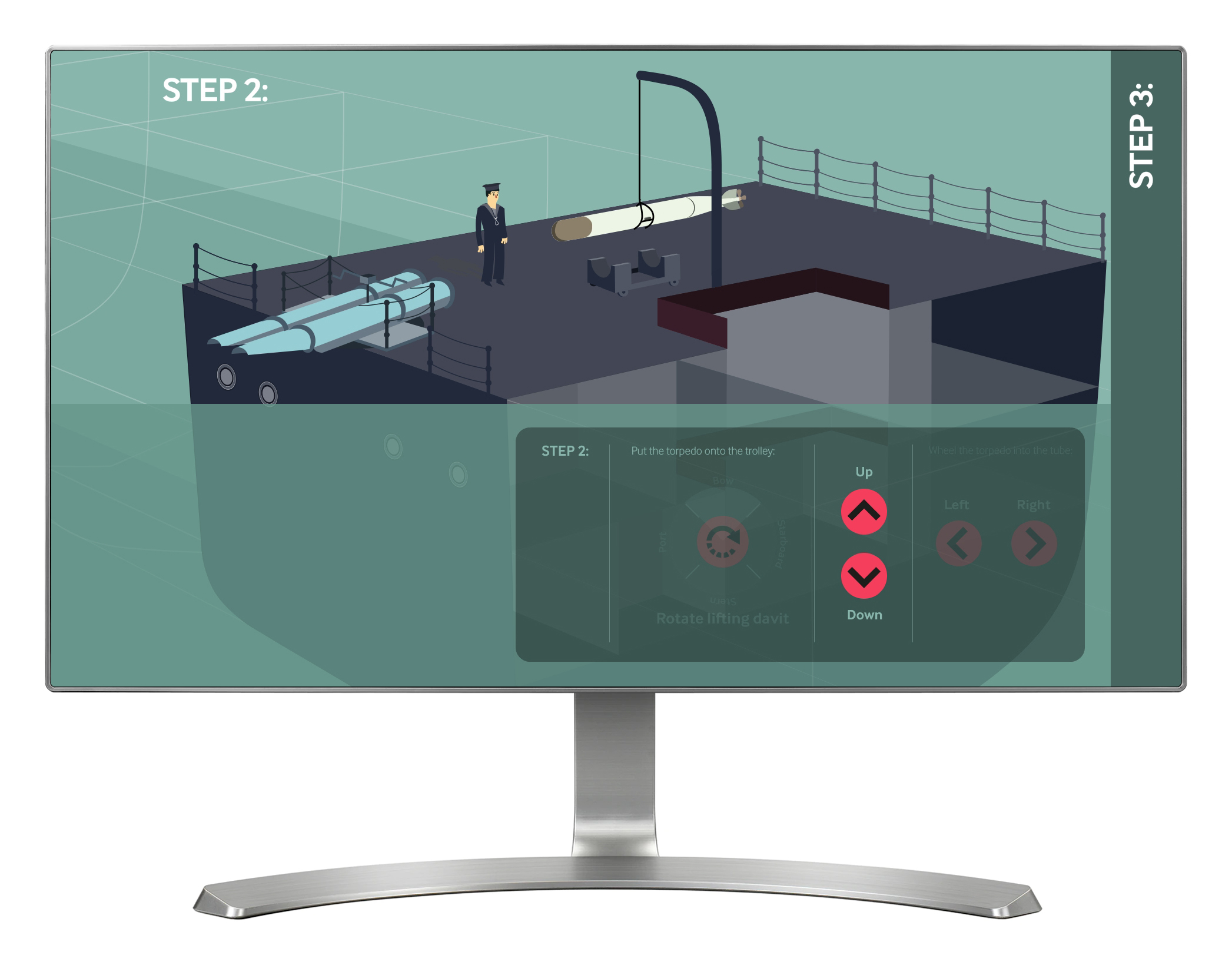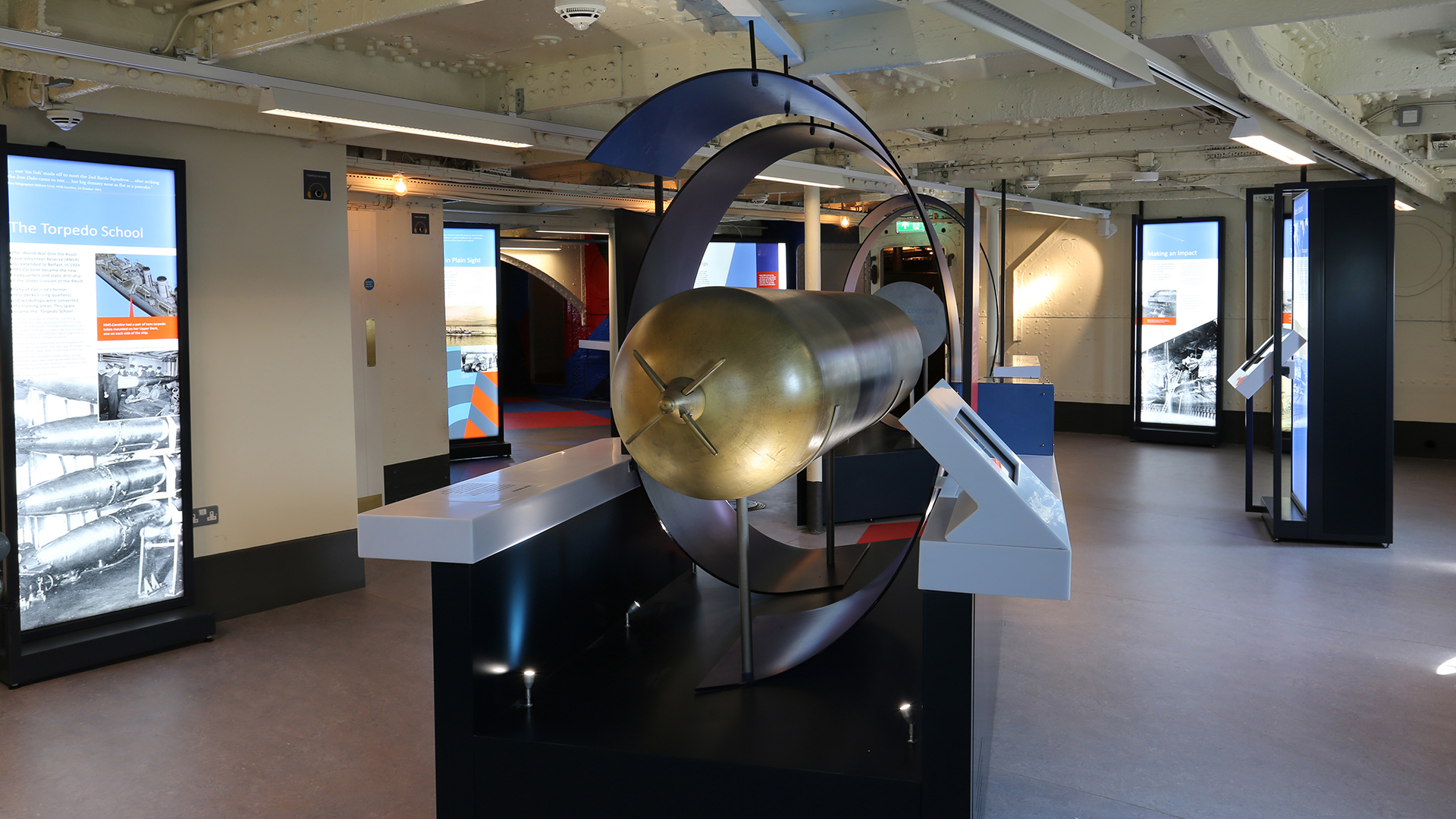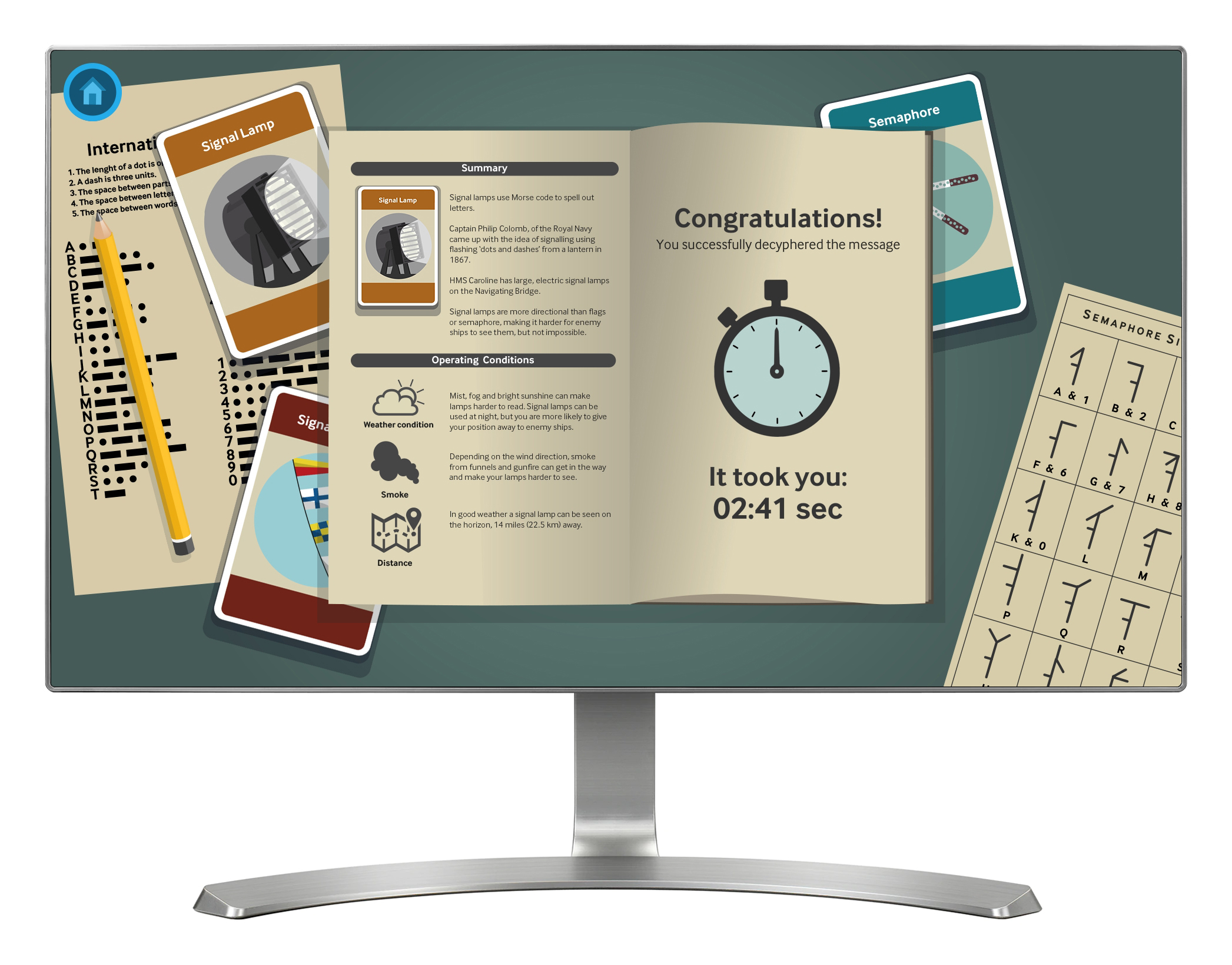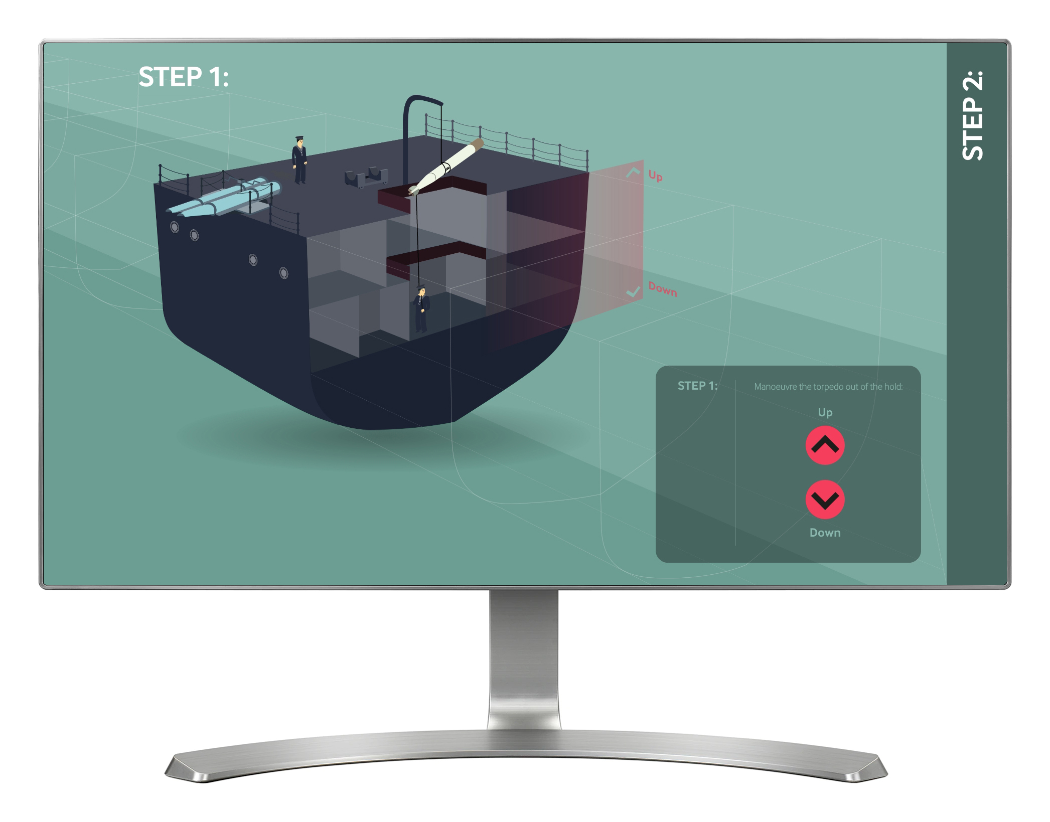 'Action Stations' is an illustrated and animated touch screen game in which visitors have to manoeuvre a torpedo from the ships store, through the ship and onto a launcher, and then take aim and fire it at an enemy ship.