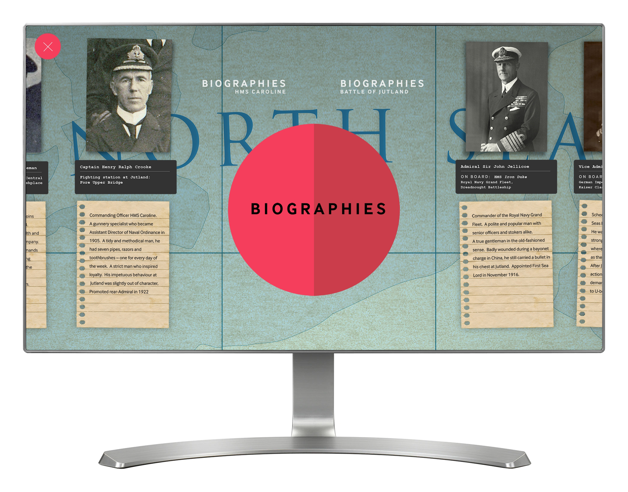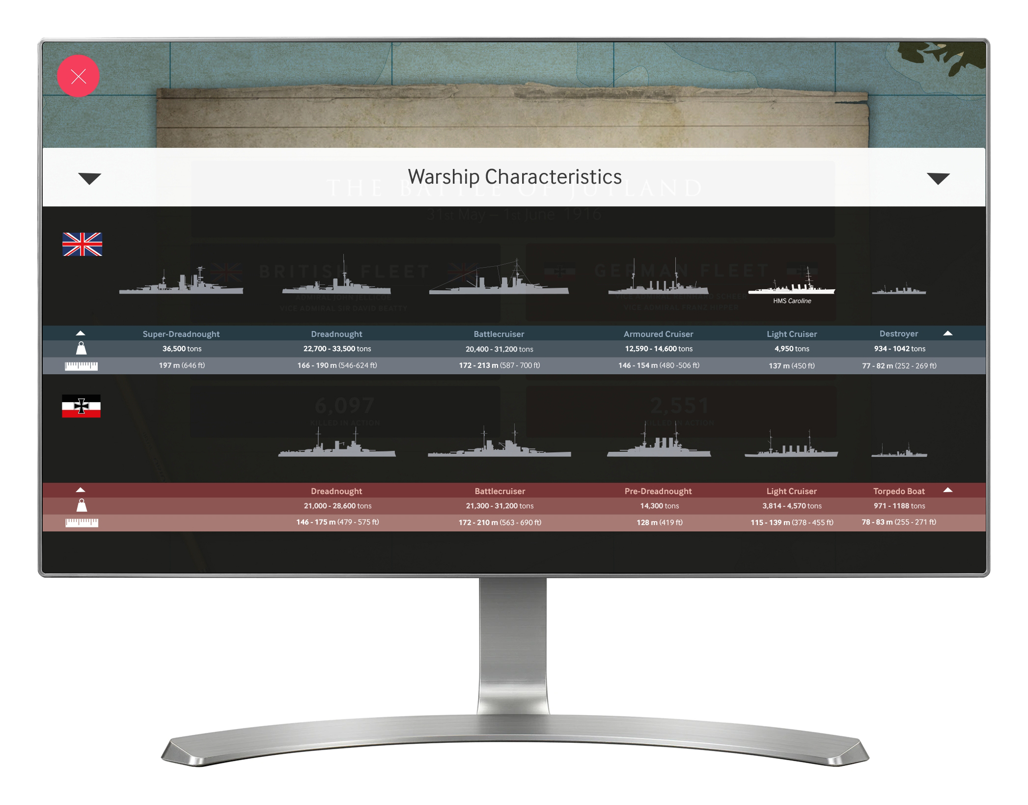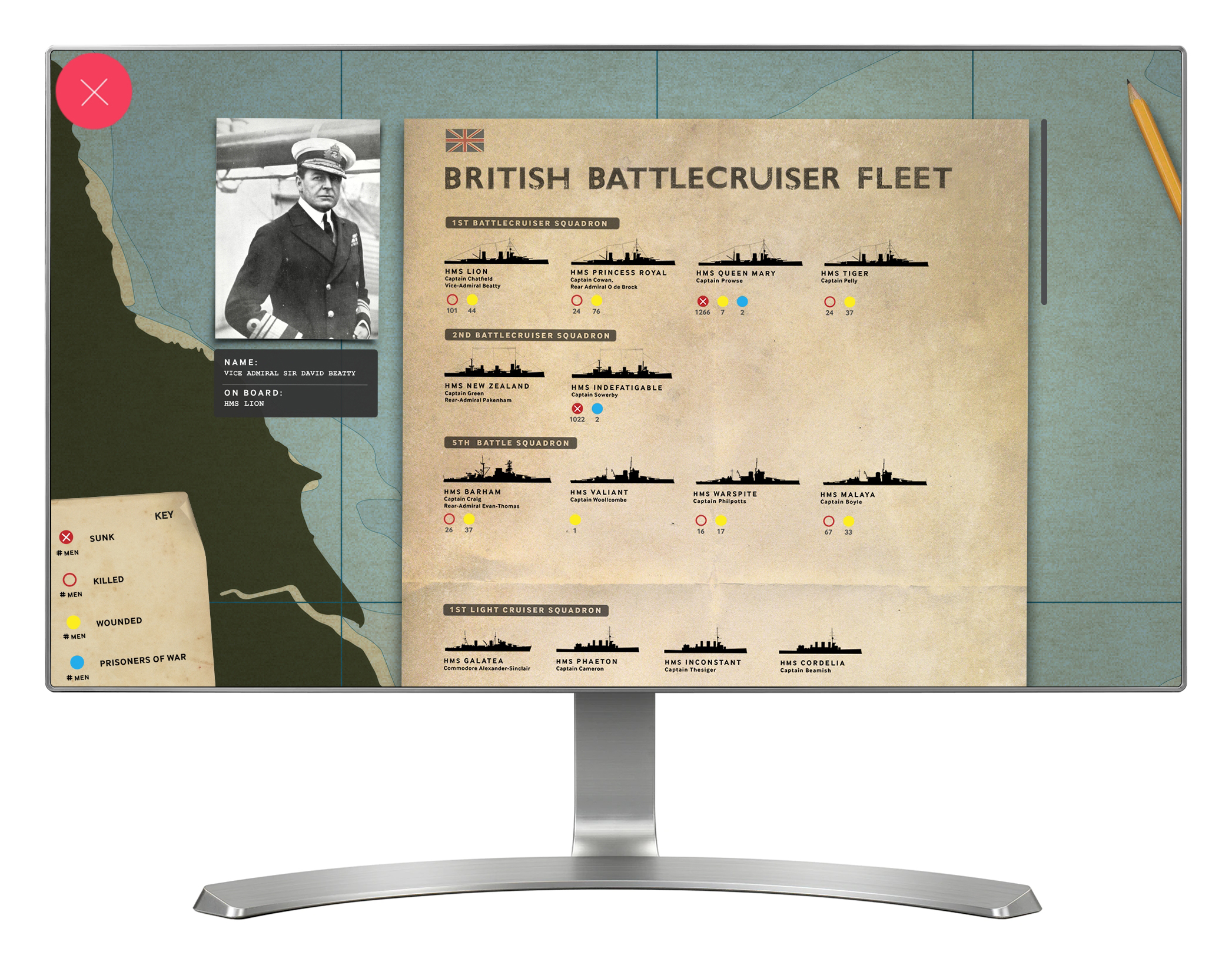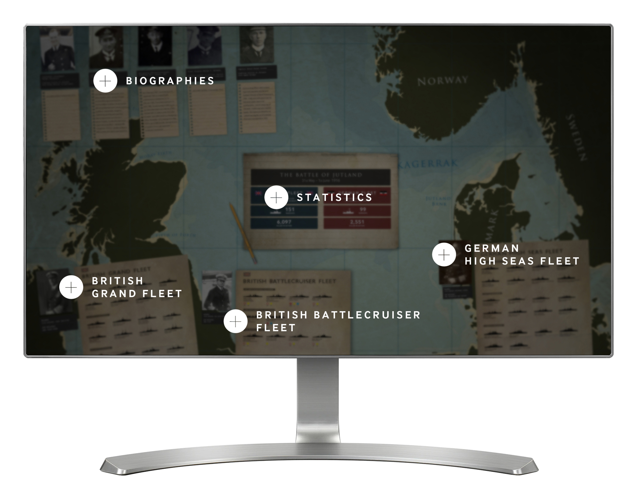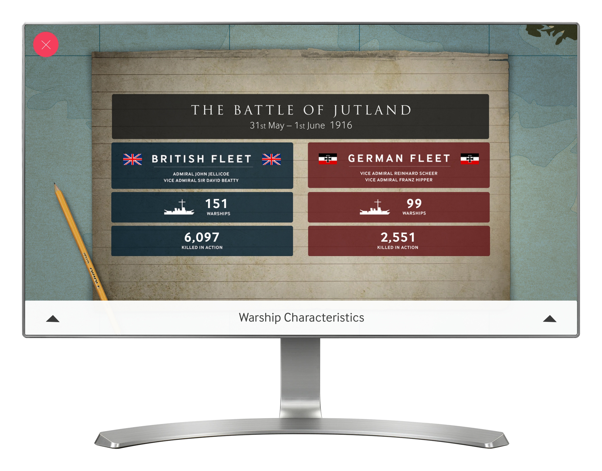 'The Battle of Jutland' is an interactive video player that takes visitors through all of the key moments in the battle. Left to play on it's own, the interactive will show the battle from start to finish, but visitors can interrupt at any time to navigate to any of the key moments.