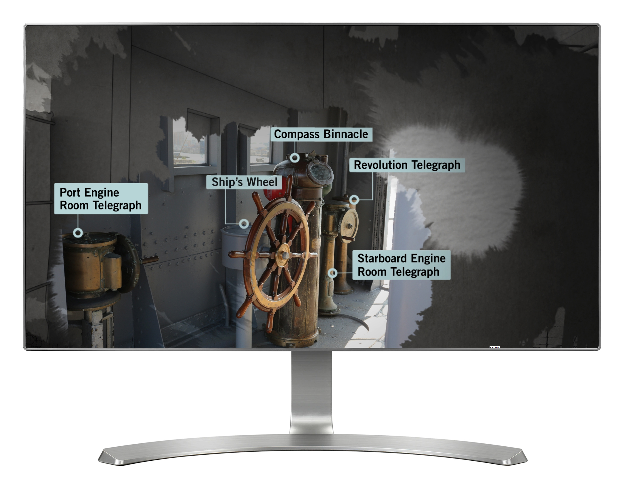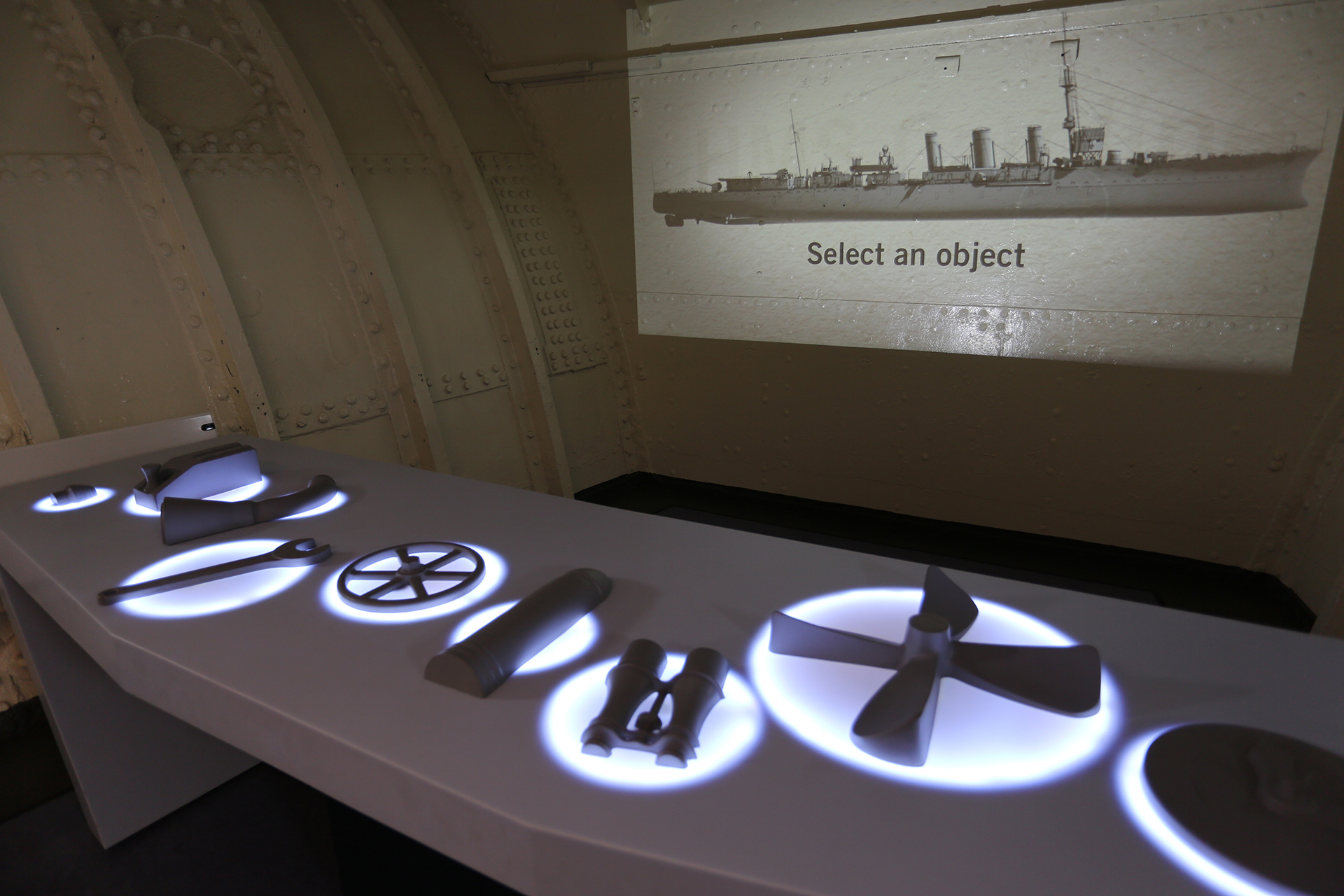 'How She Worked' lets visitors watch a narrated tour to nine key areas on the ship. By touching a physical object on a tabletop, visitors can trigger a video sequence to play, projected onto the wall in front of them. Areas of the ship include the guns, engine and boiler rooms, navigation and communication systems, torpedo workshop and steering gear.