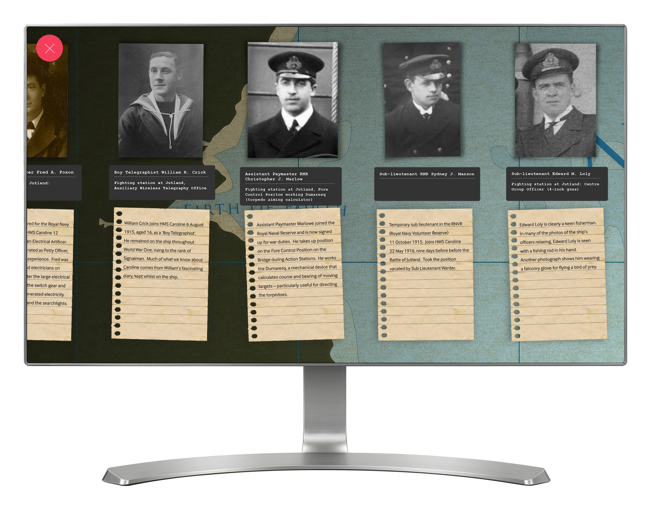 I developed a range of touch screen interactives for HMS Caroline, these are detailed below. One interactive, 'Virtual HMS Caroline', a four user multi-touch installation, has it's own portfolio page here.