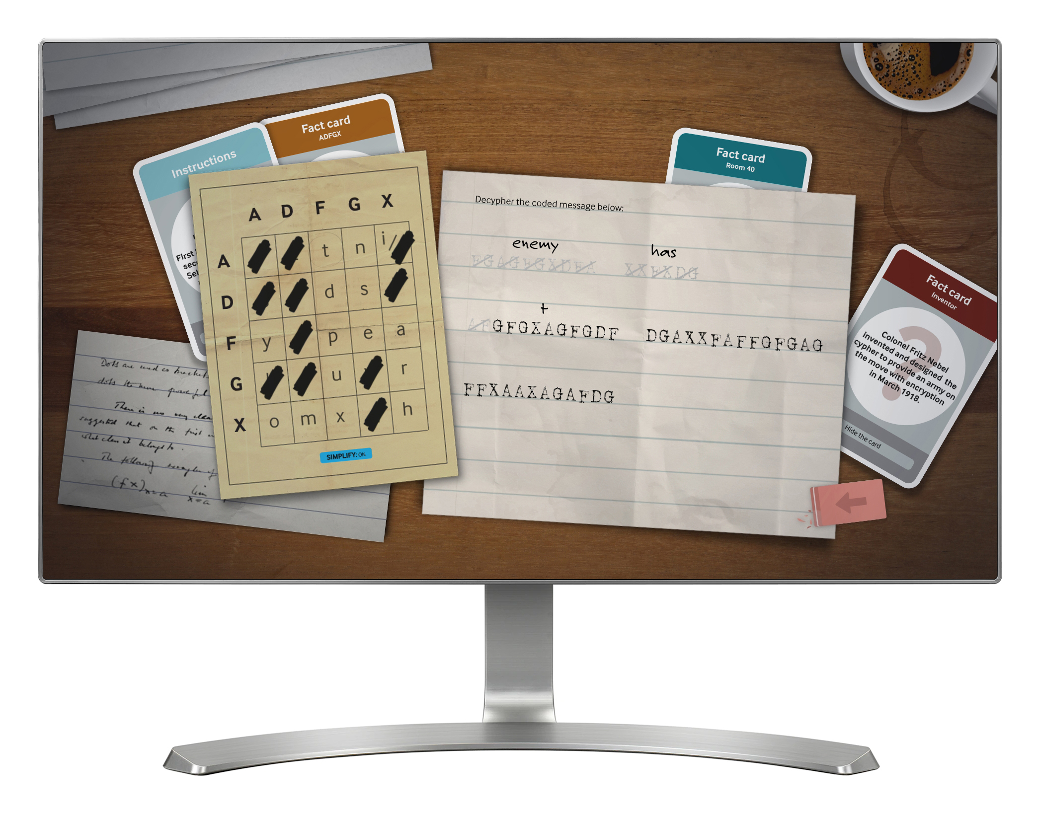 In 'Crack the Code', visitors learn about decoding messages through gameplay. A short message has to be decoded using a simple letter grid. Users are walked through the process of decoding the first few letters in the message. After this, there is an option to simplify the game if some assistance is needed. There is also a selection of playing cards scattered around the interface, each of these contains a fact, hint or tip.