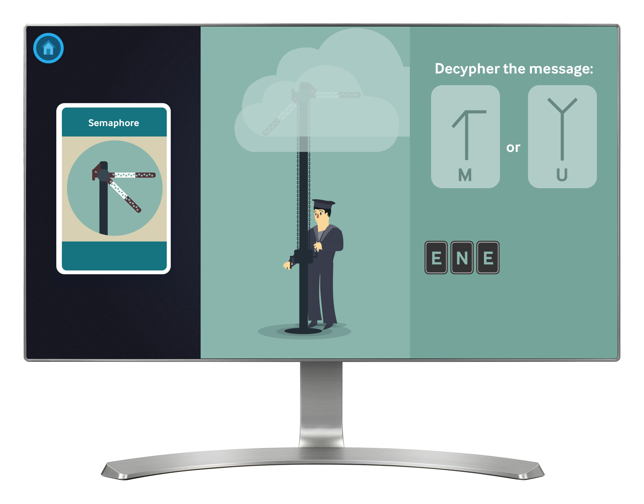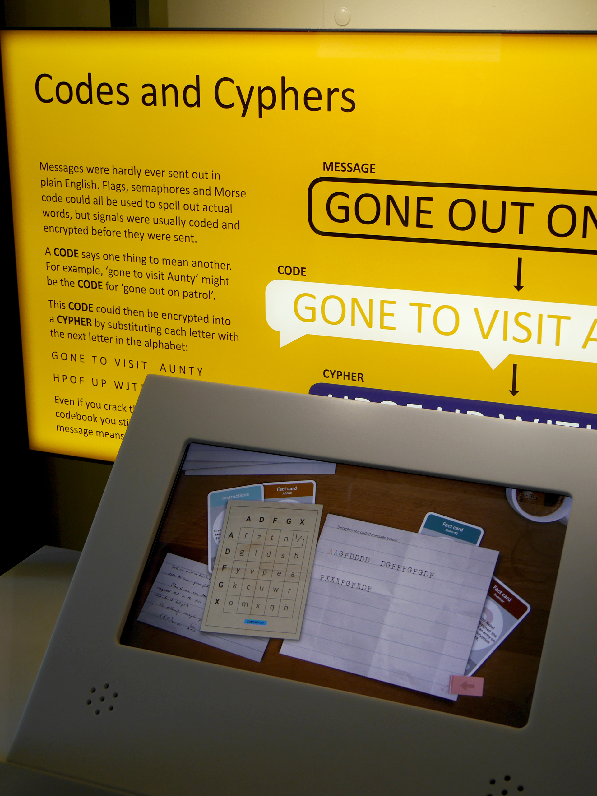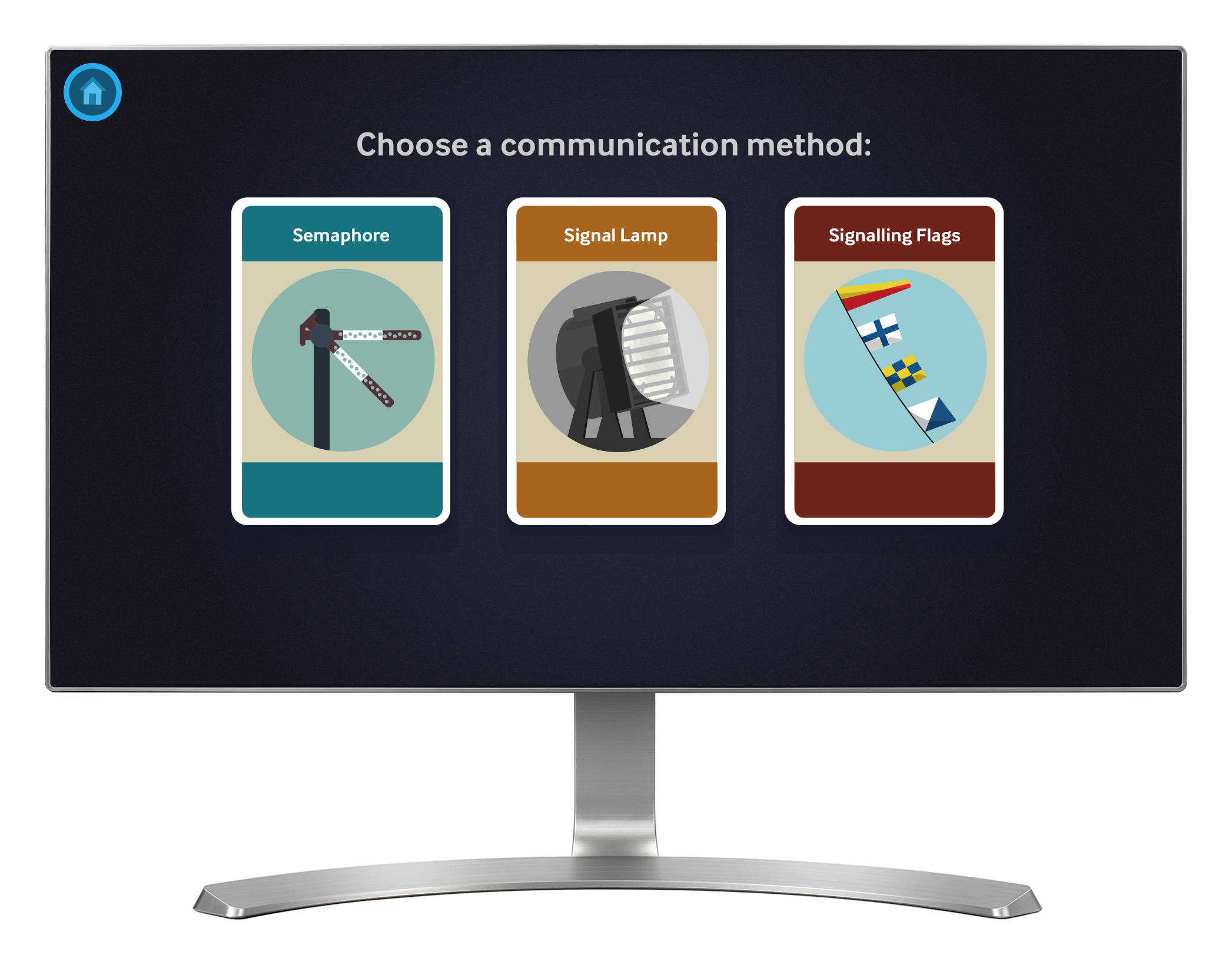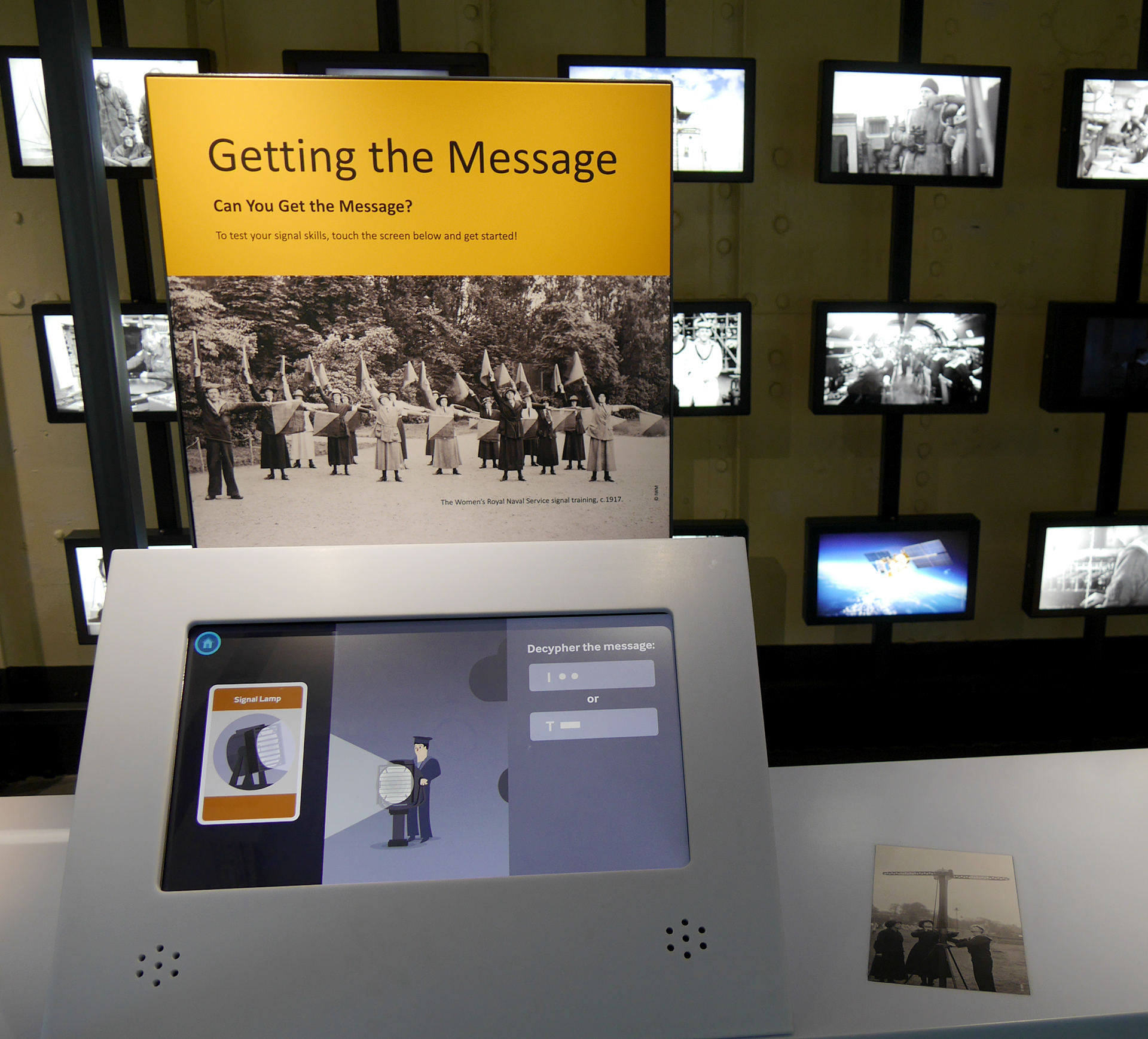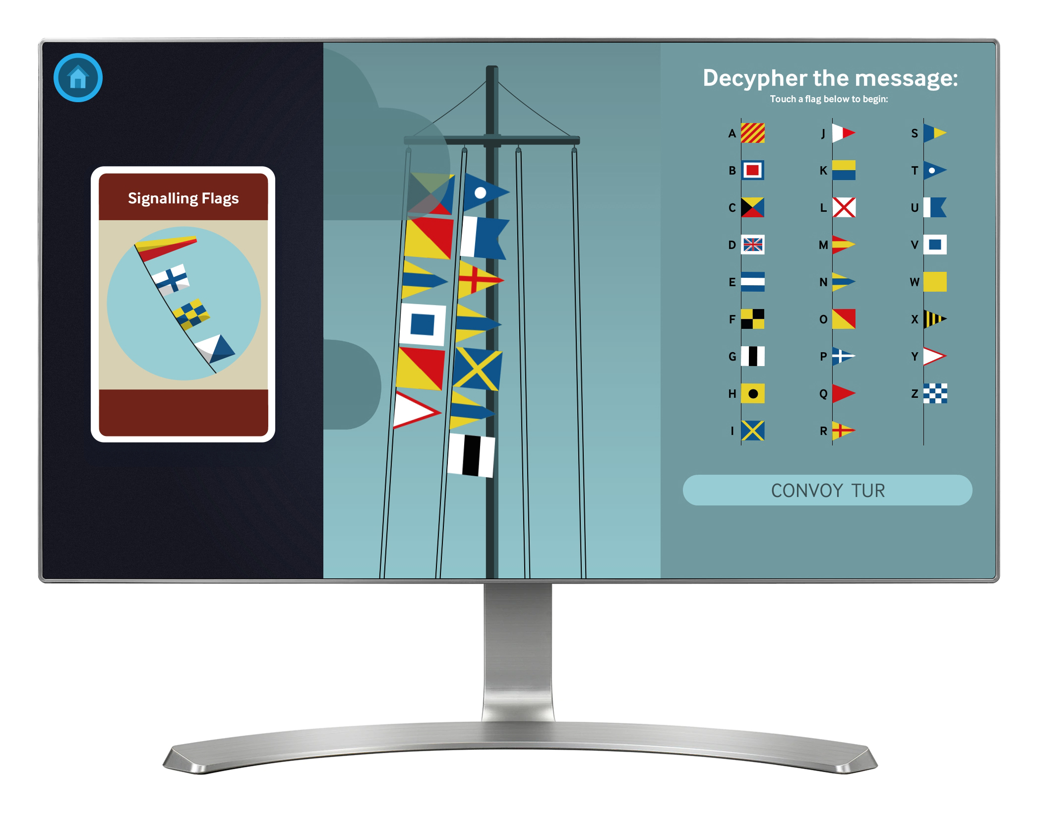 'Getting the Message' is another touch screen game, and is all about signals and communications. Visitors can choose from three types of communication: semaphore masts, signalling flags and morse code signal lamps. A message is spelt out one letter at a time, and visitors have to work out each letter in order to reveal the message. At the end of each game visitors see how well they have done, and are presented with more information about their chosen method of communication.