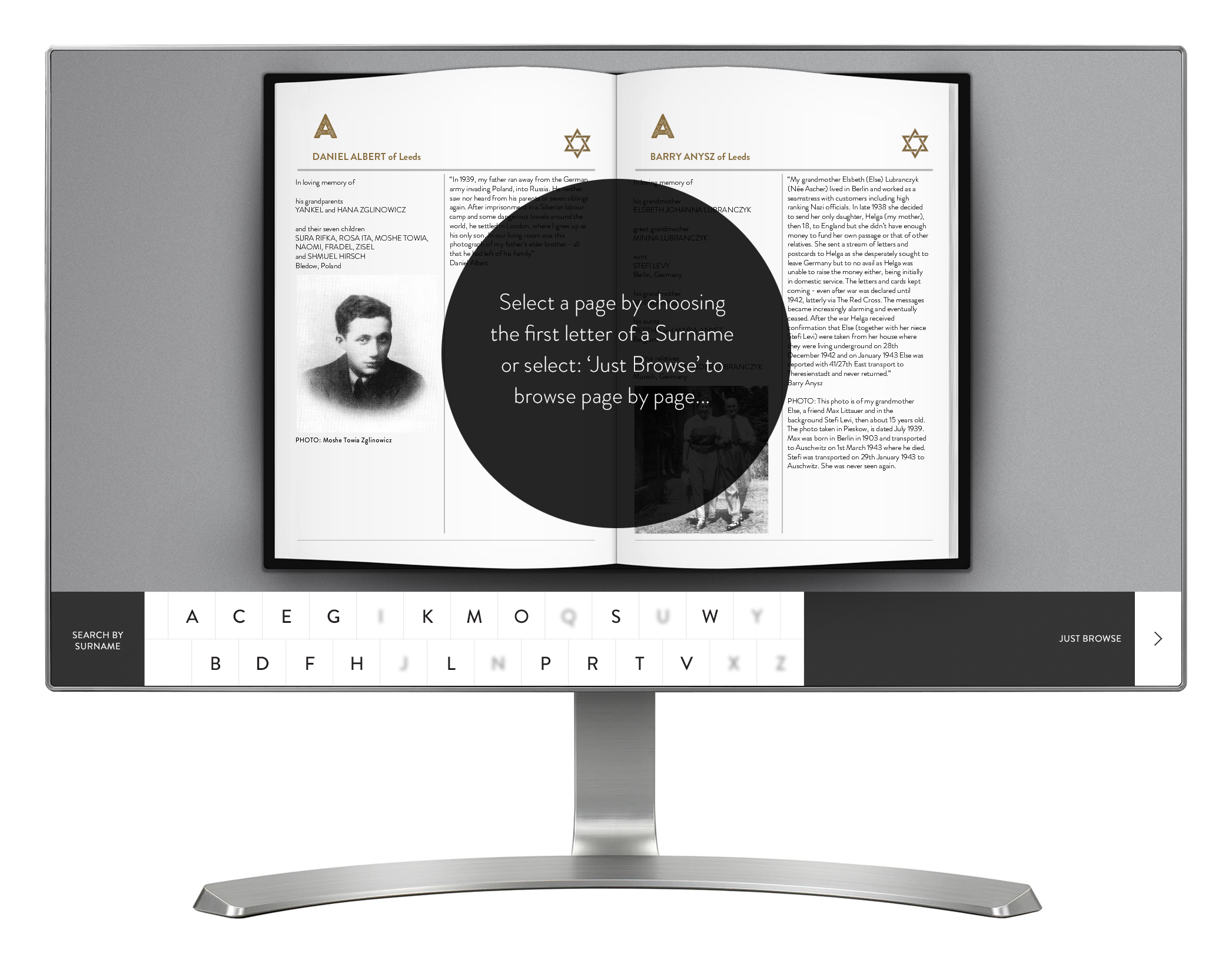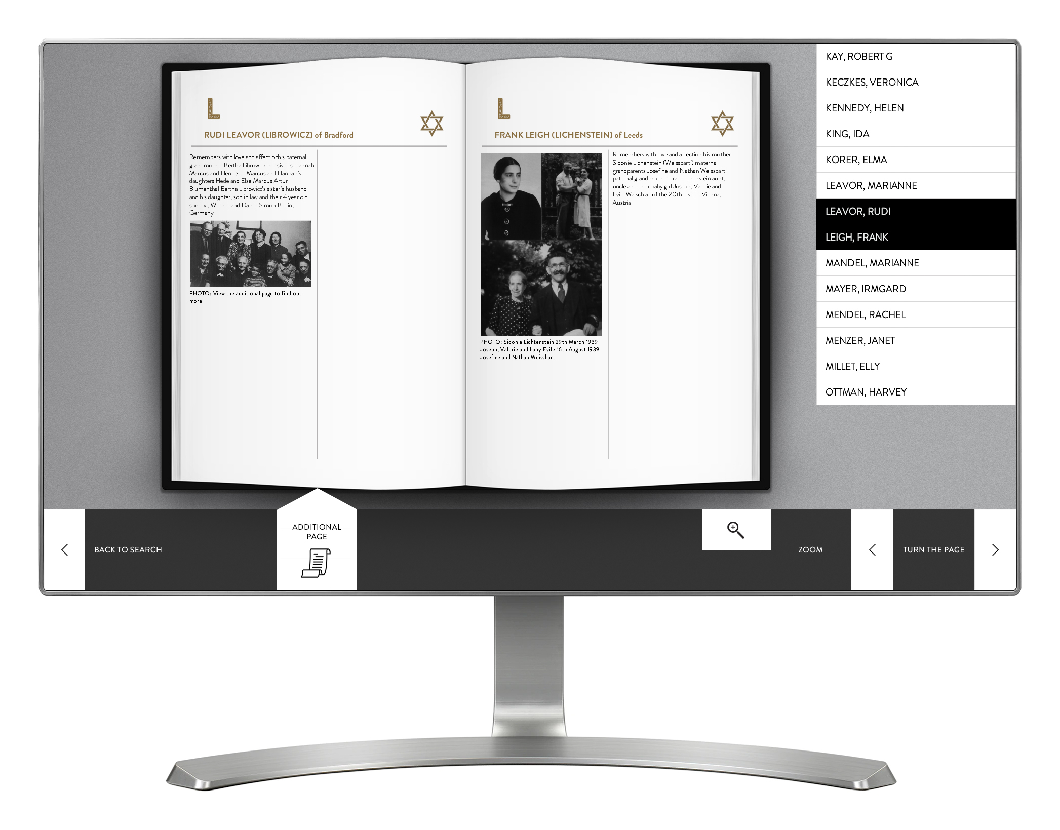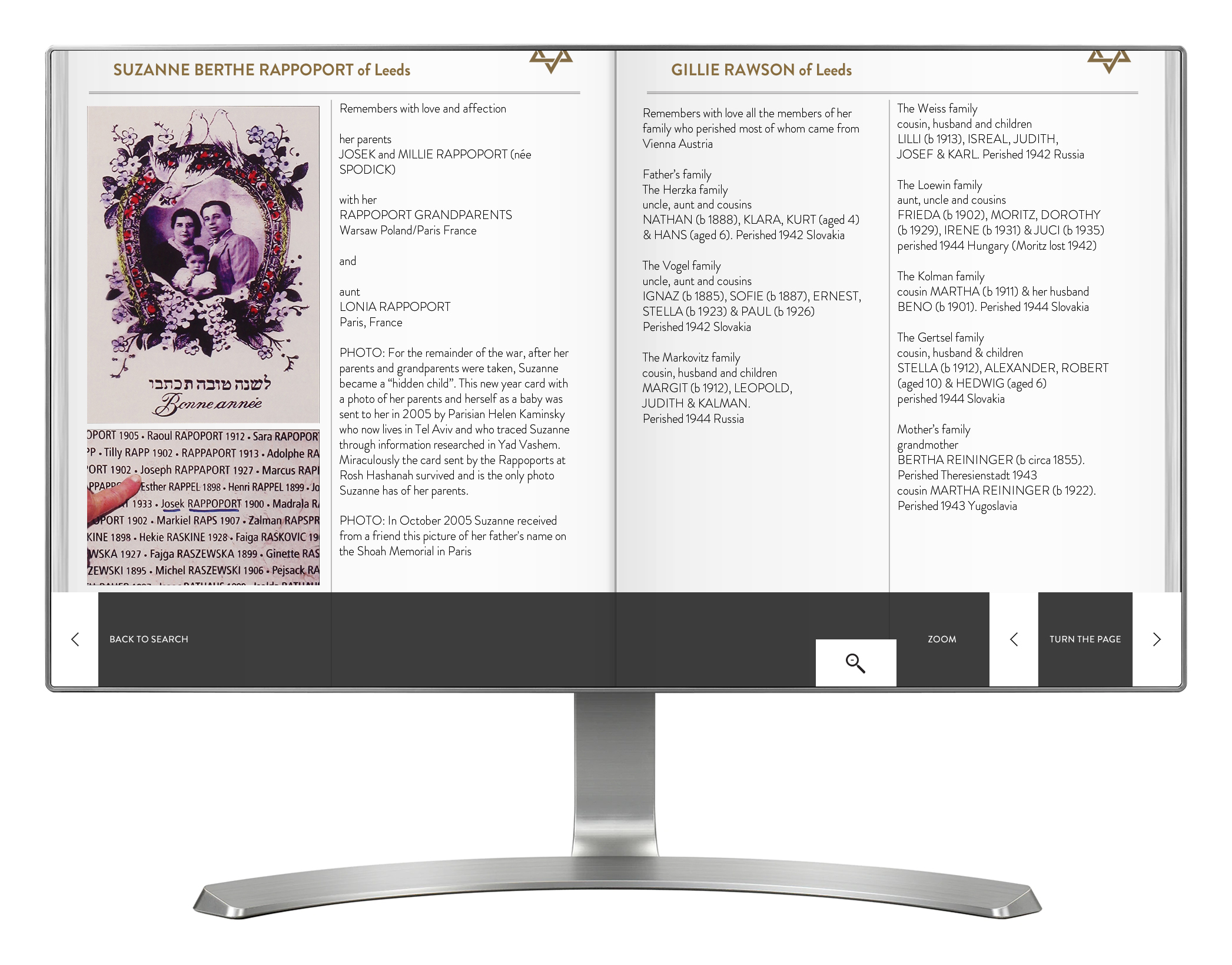 I developed several touch screen interactives for the exhibition, one of which was the 'Memorial Book'. A digital memorial for local families from the North of England, it contains names, photos, records and stories of people who perished during the Holocaust.