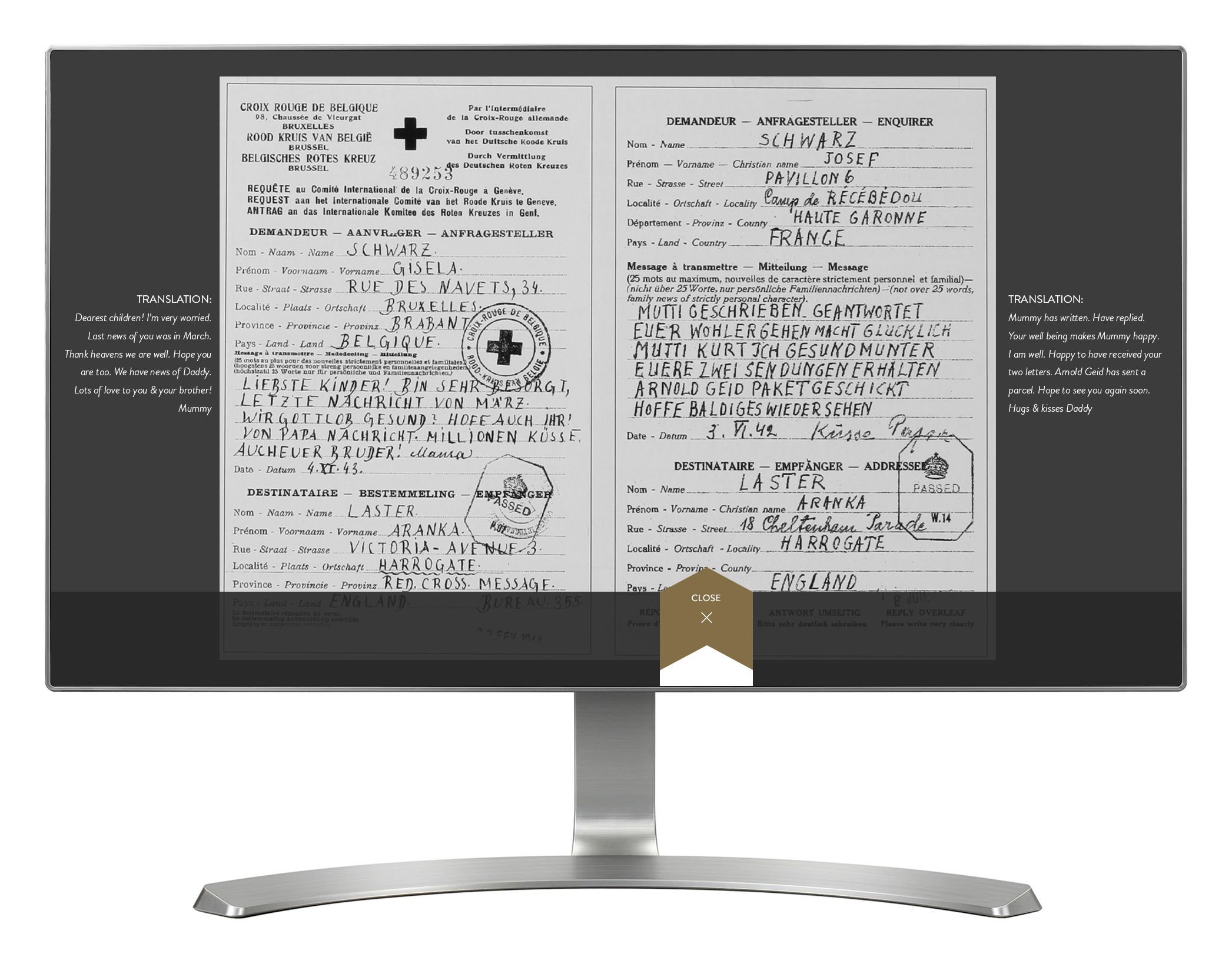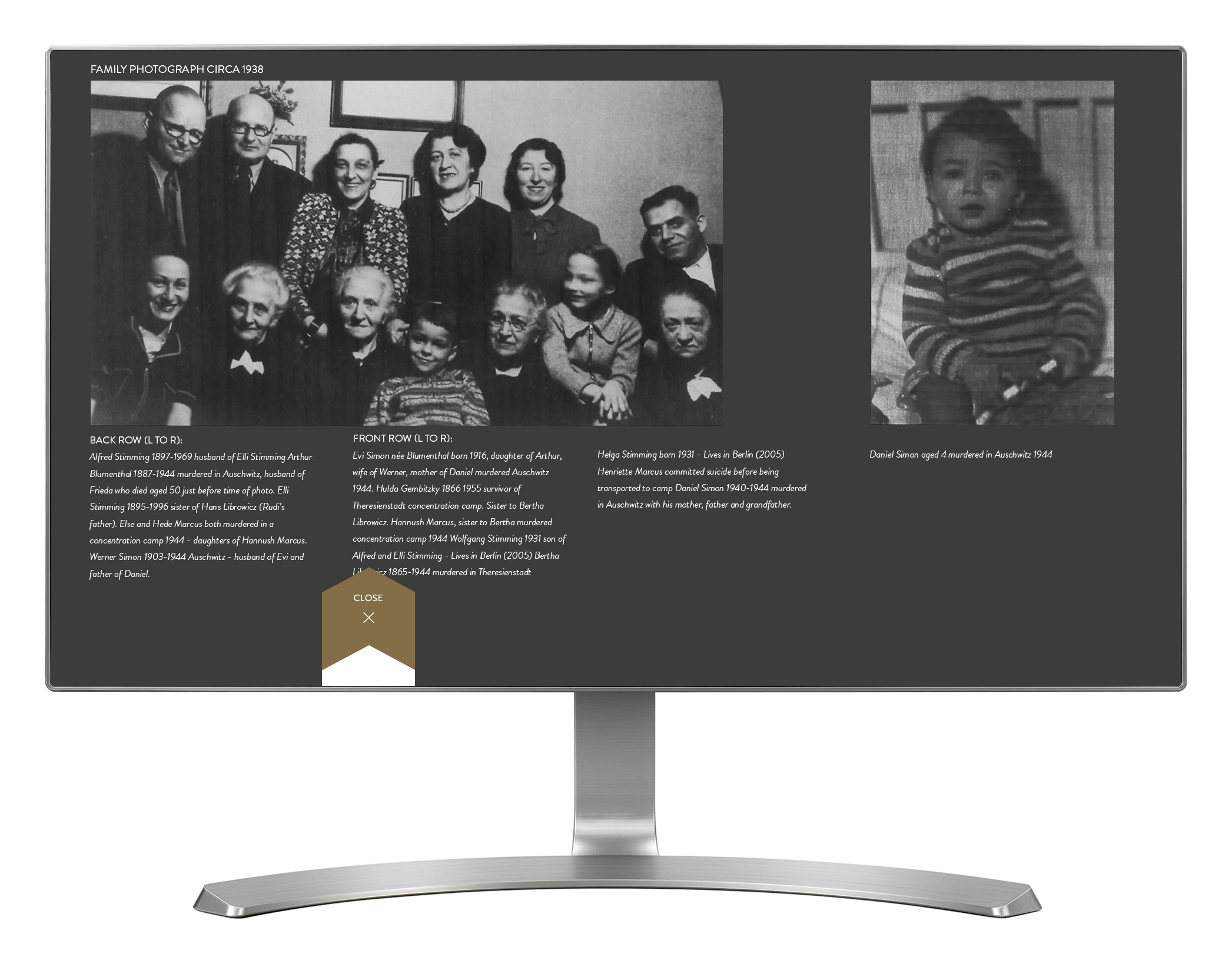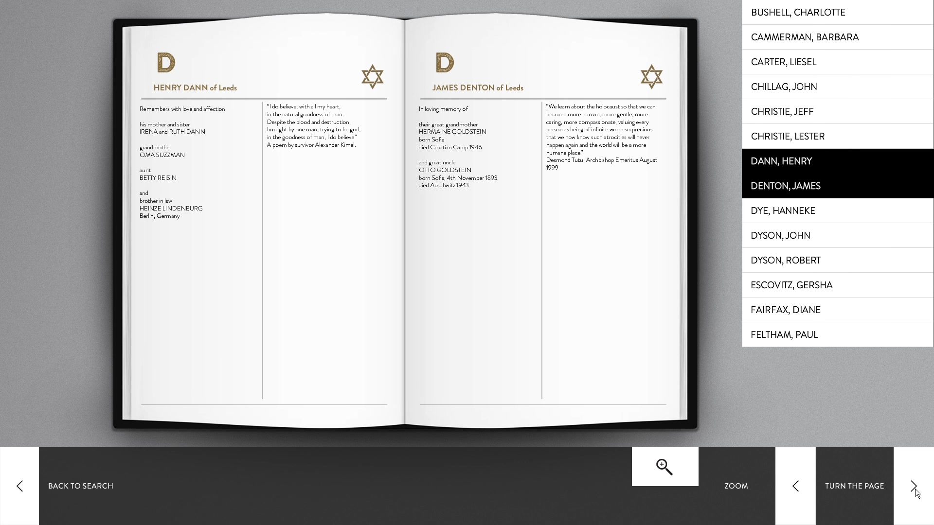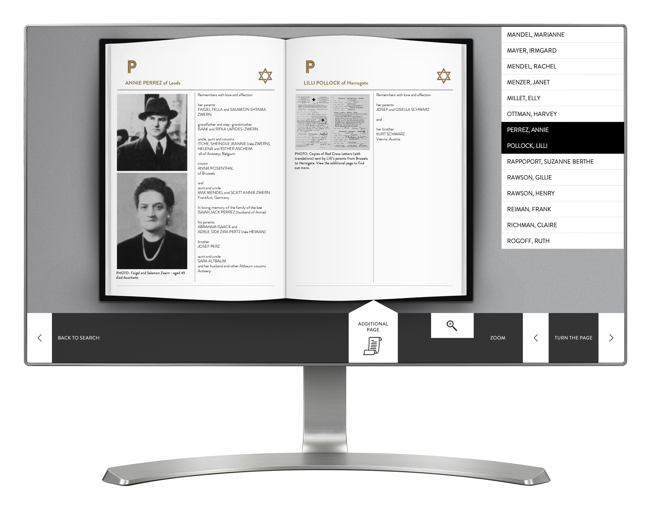 I developed several touch screen interactives for the exhibition, one of which was the 'Memorial Book'. A digital memorial for local families from the North of England, it contains names, photos, records and stories of people who perished during the Holocaust.
