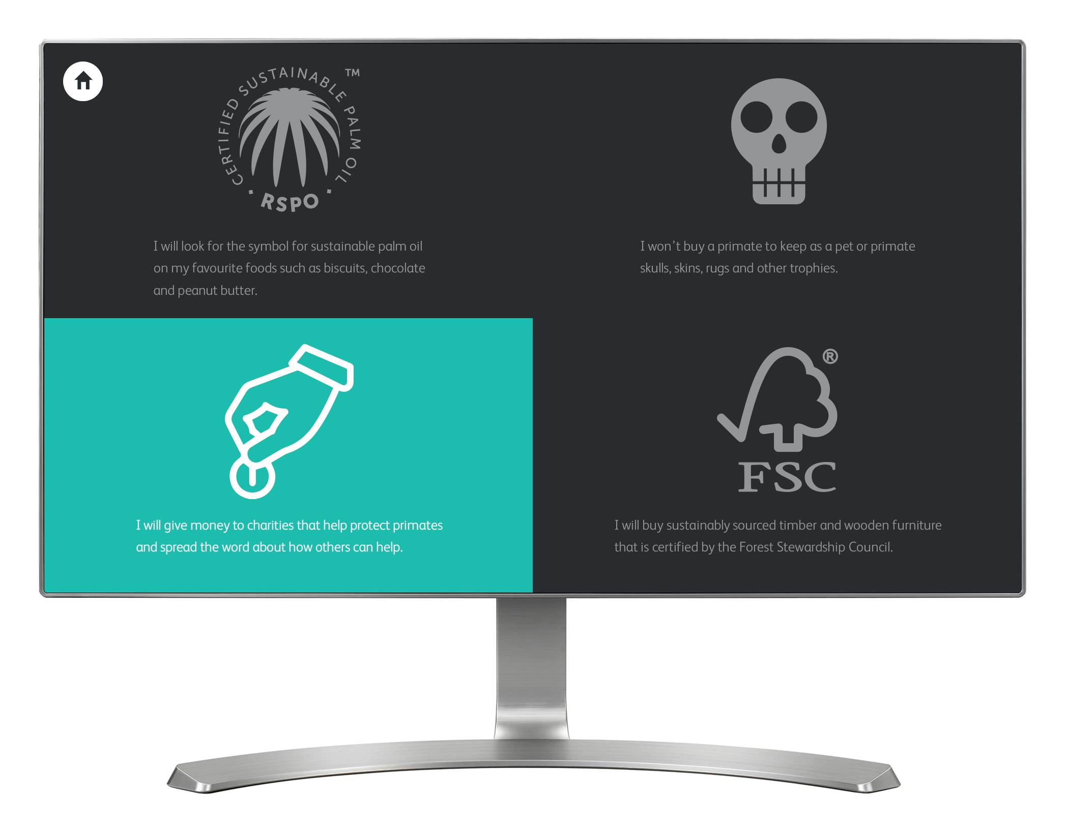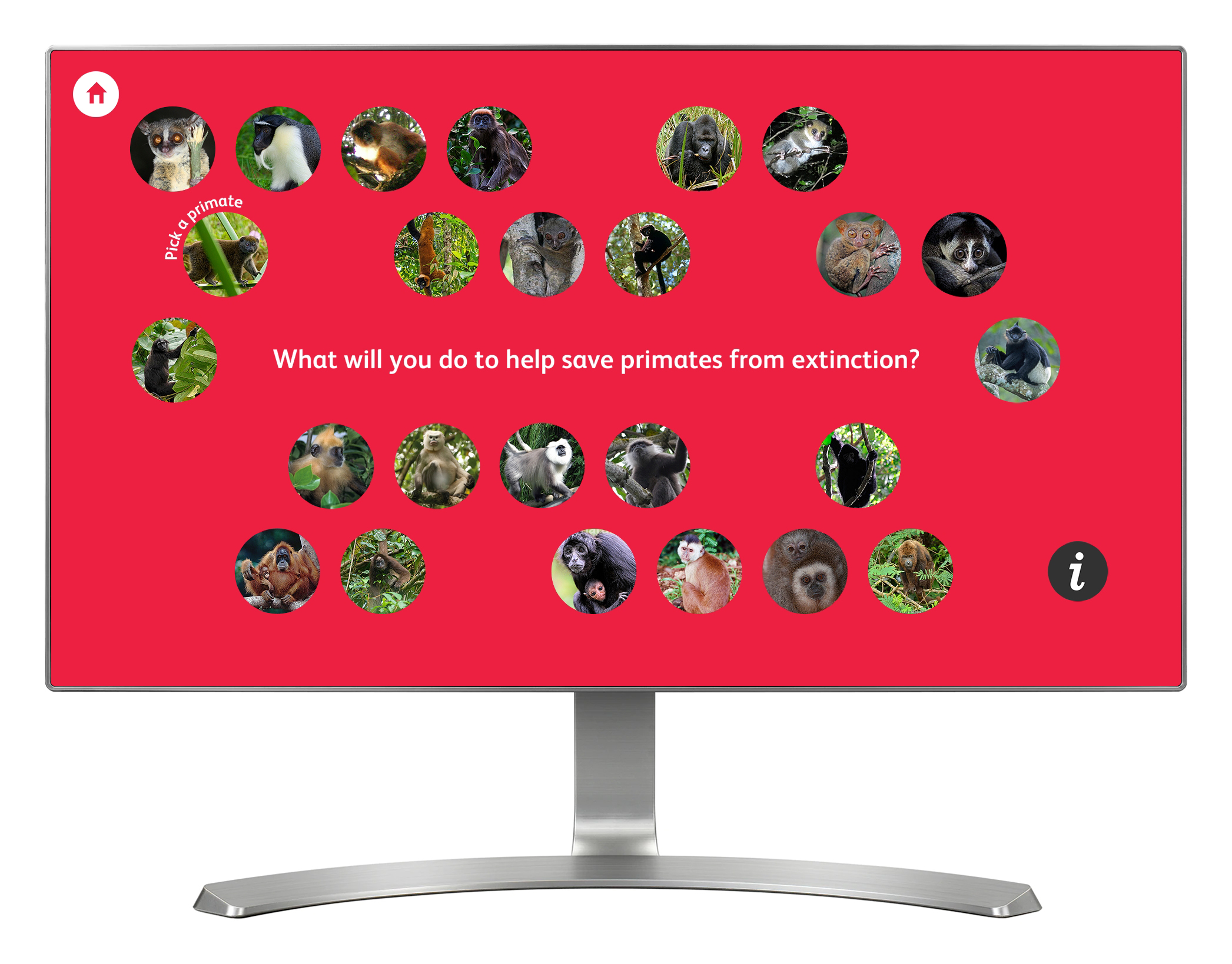'Primate Protectors' is a simple touch screen interface video player, providing access to videos about primate conservation.