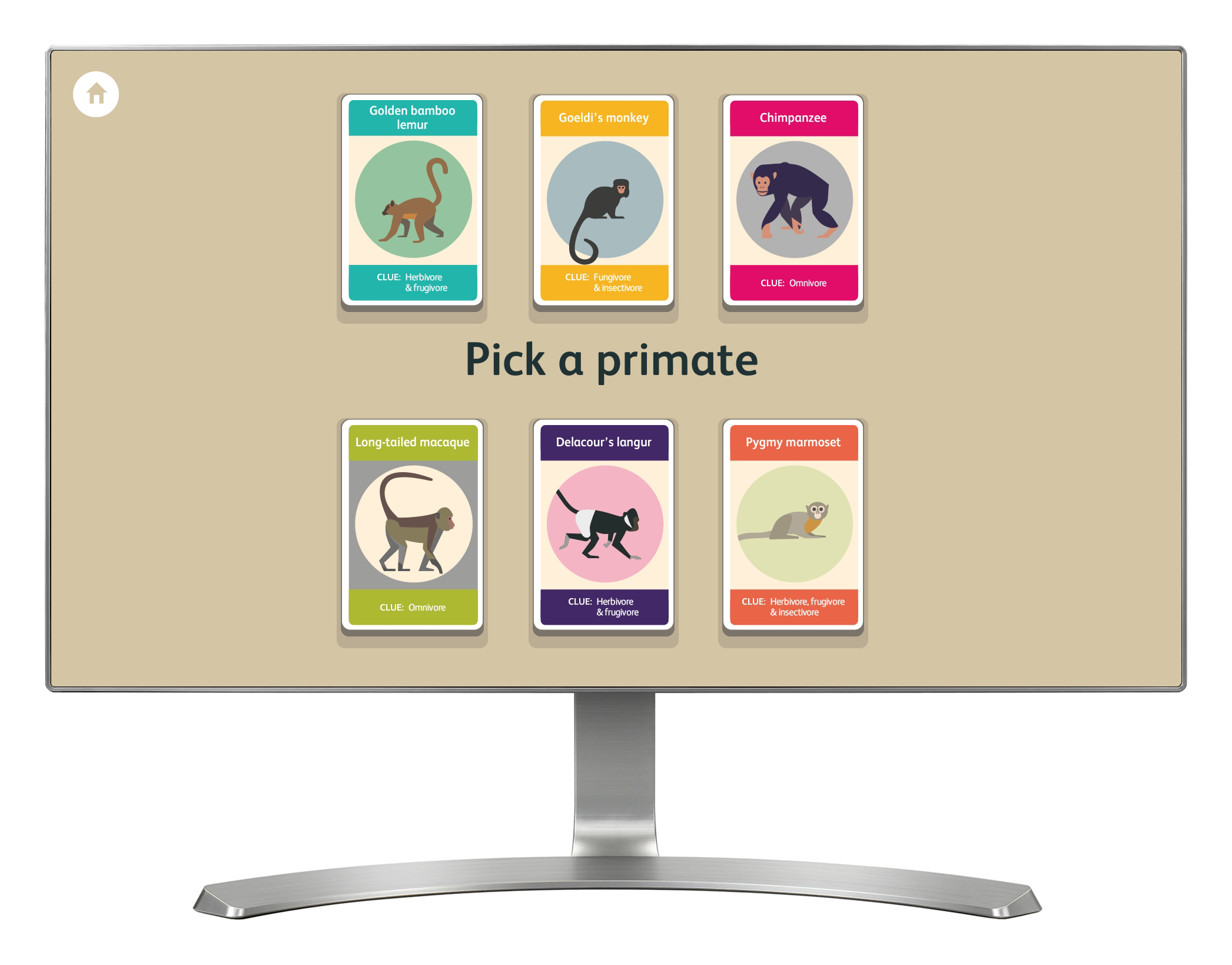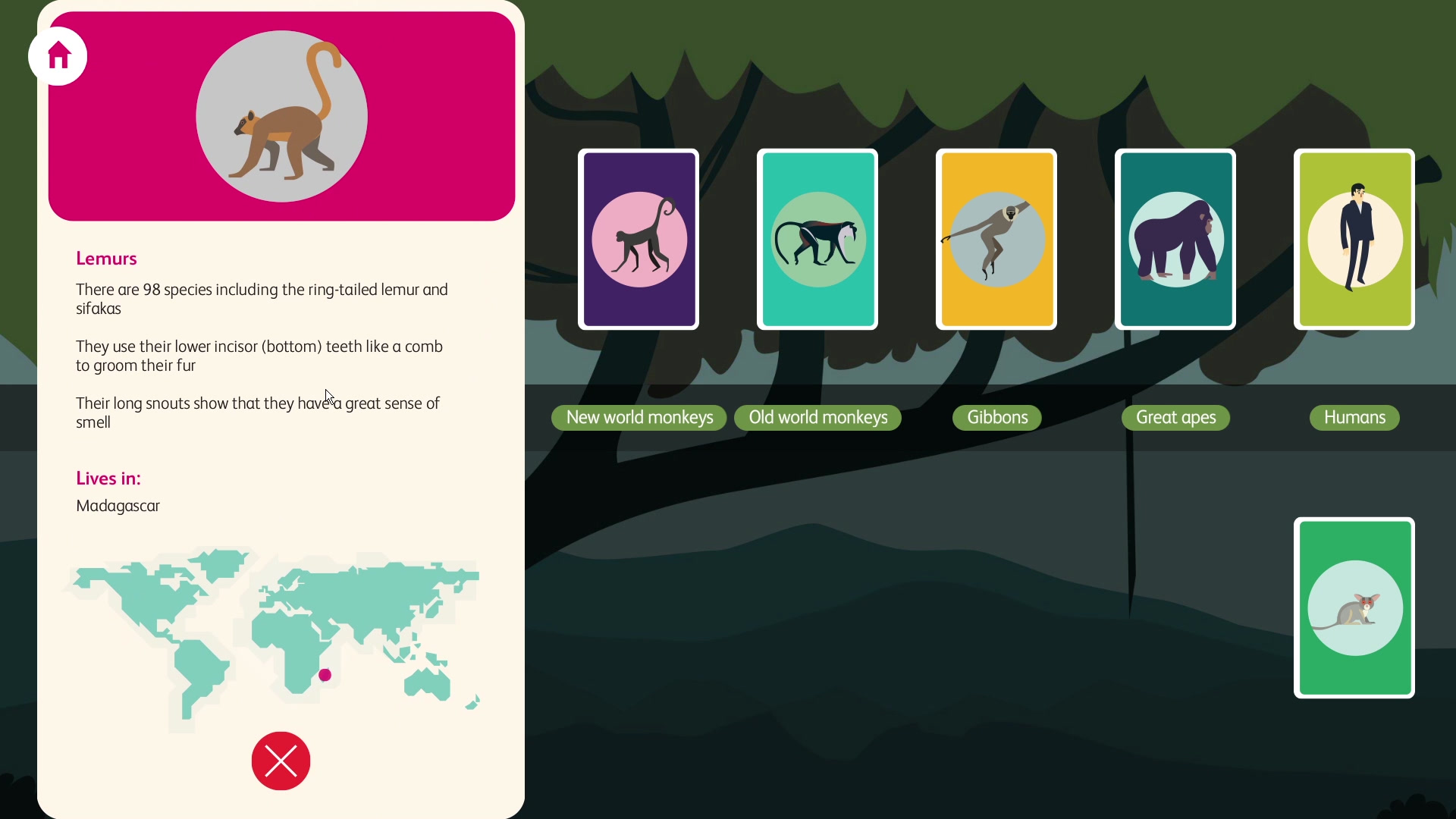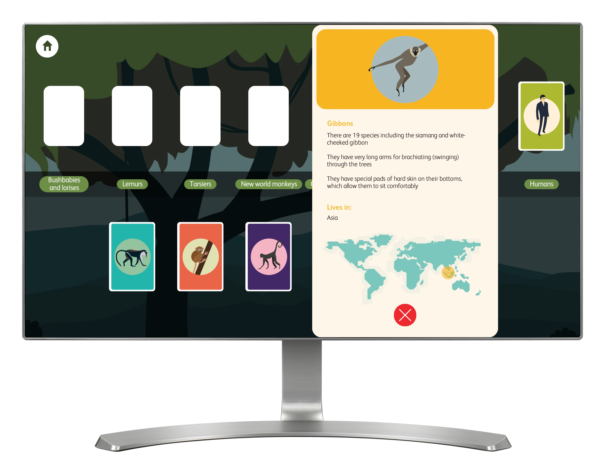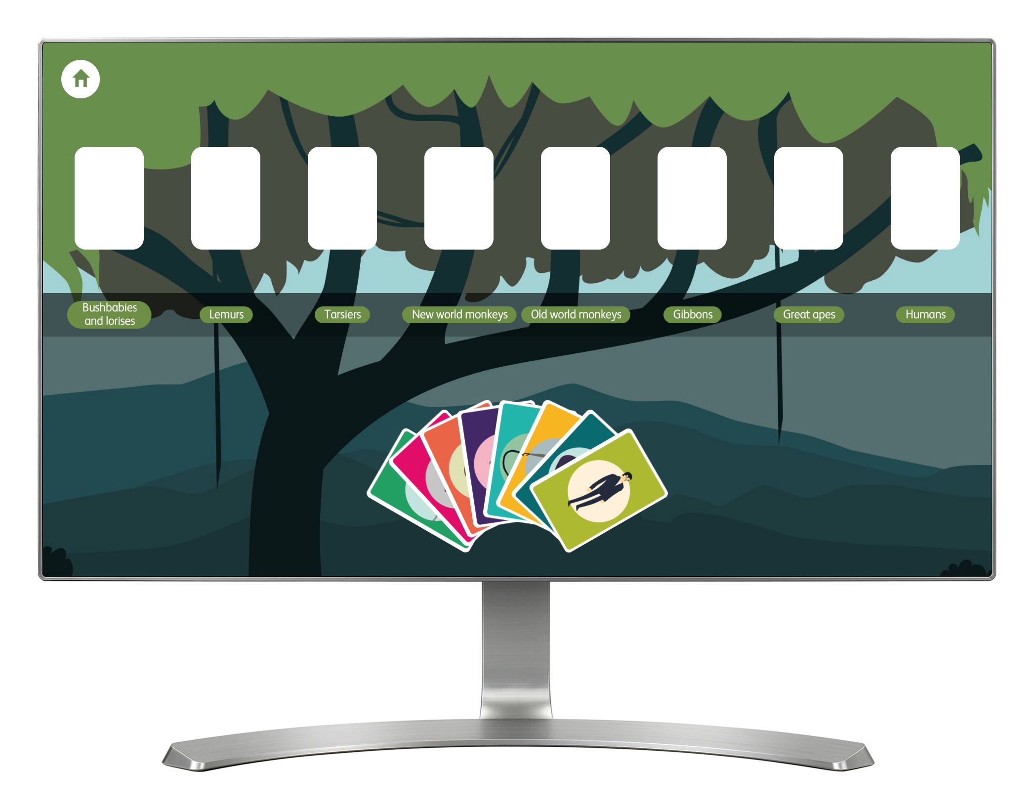 'Family Tree' is presented as a simple, illustrated card game. The aim of the game is to arrange eight 'primate group' cards onto a tree, ordered by which are genetically closest to humans. As each card is positioned correctly, it reveals details about that primate's anatomy.