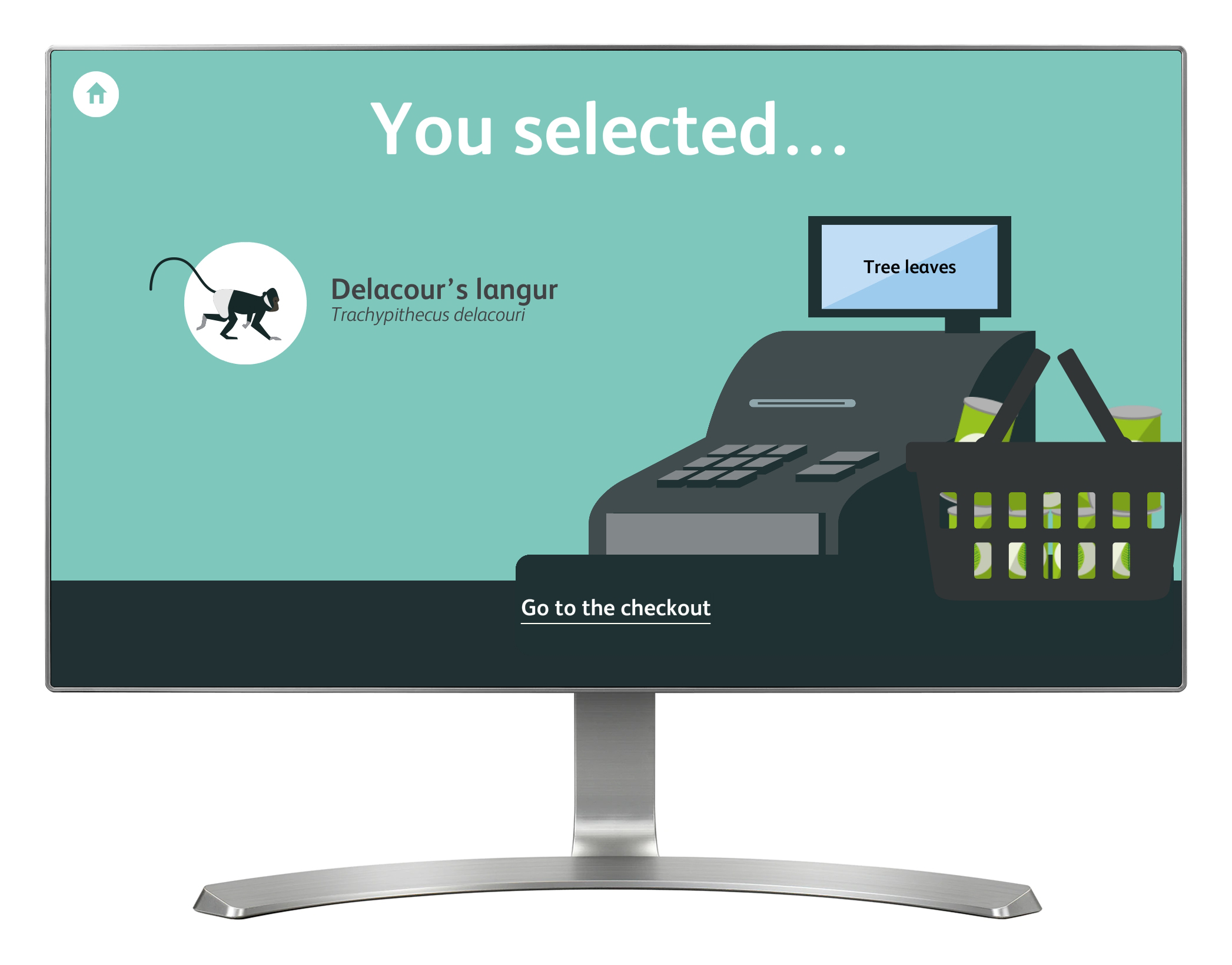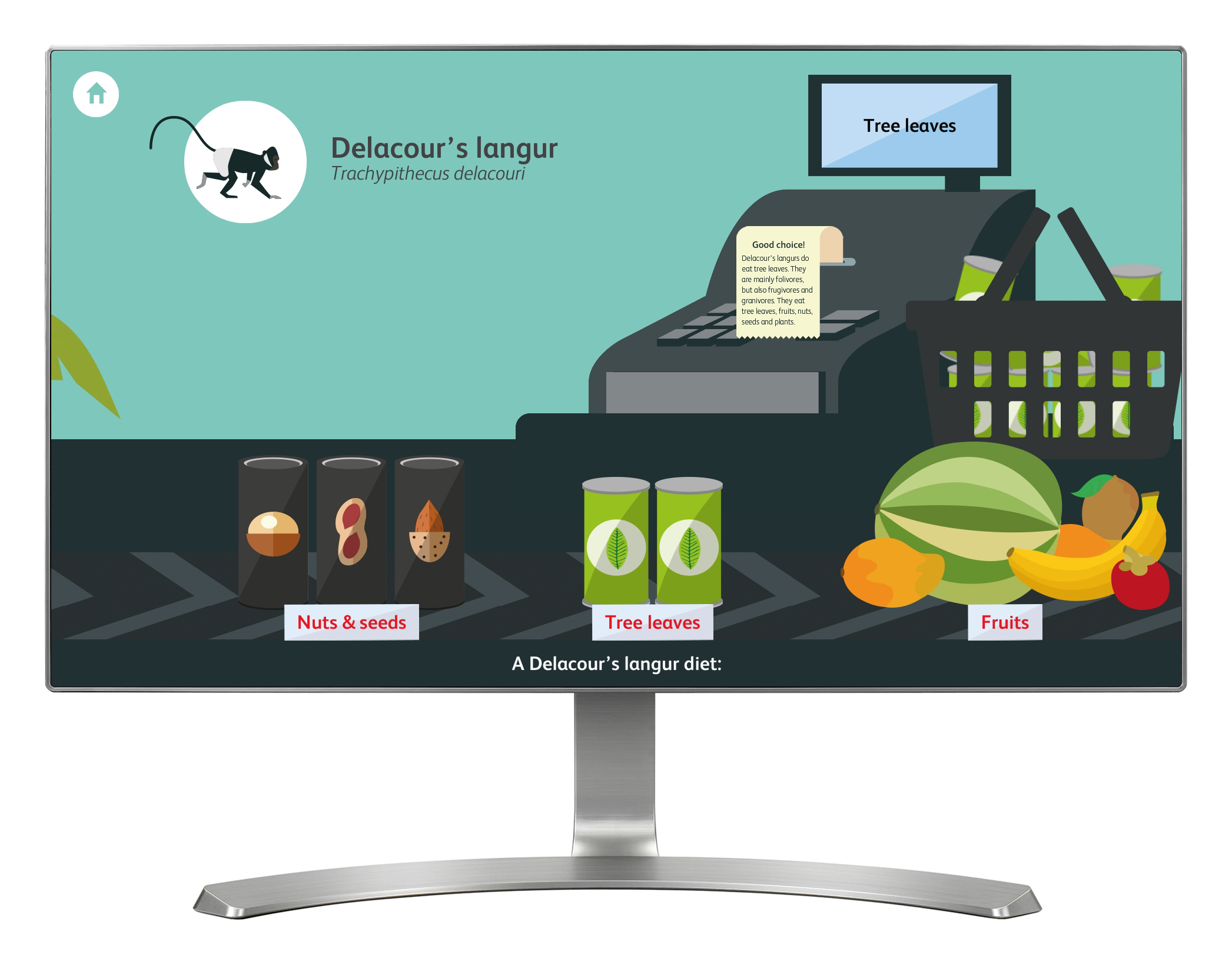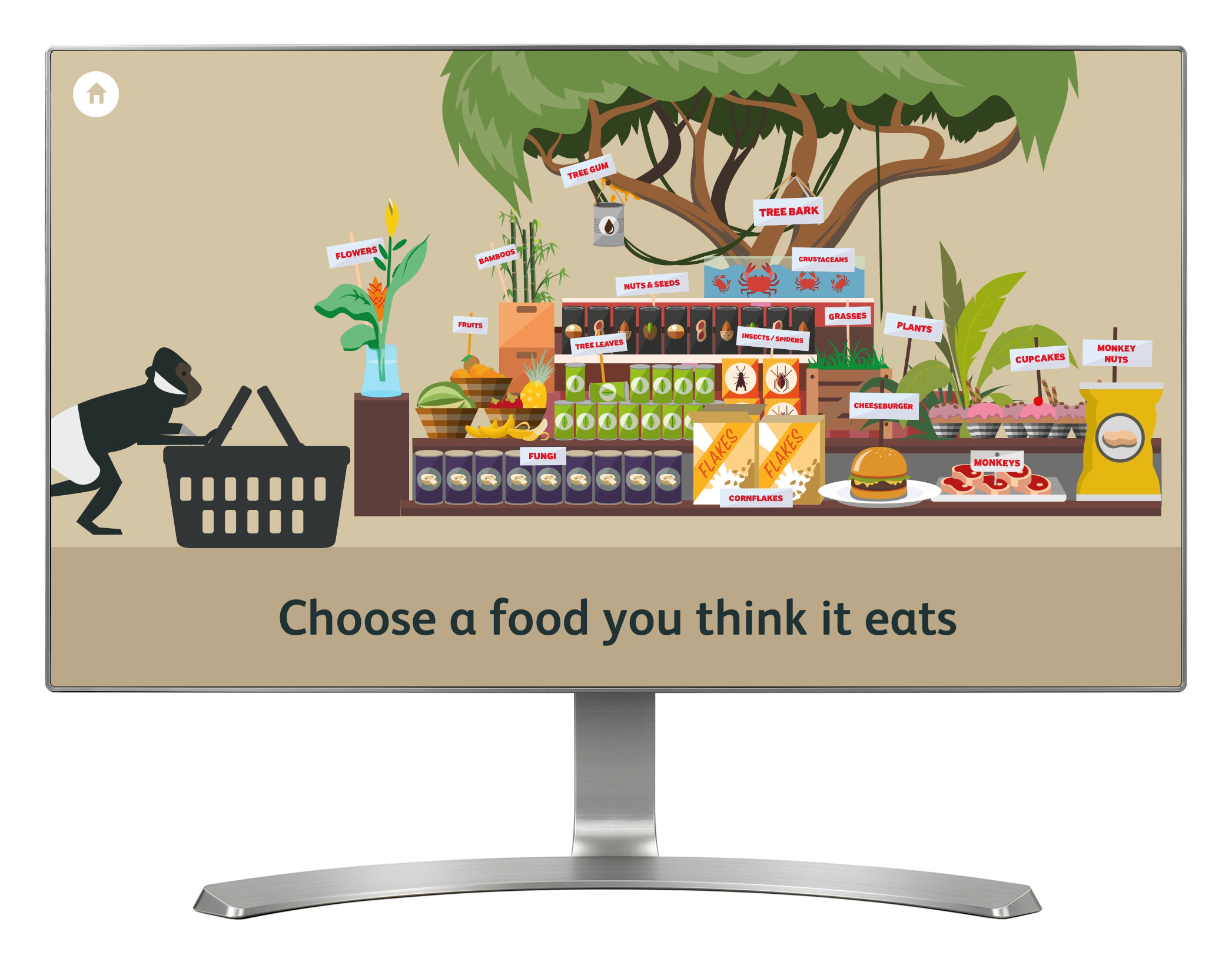 'Monkey Supermarket' is a game based around the foods that primates like to eat. Choose one of six primates and then select a food from the supermarket shelves that you think it might eat. Go to the checkout to find out if you chose the correct product for your primate. See all the foods this primate likes to eat move across the conveyor belt. For the Chimpanzee species there is an extra step in the game (making it a little bit harder). You also have to choose a tool that you think the Chimp would use (such as a rock or stick) to assist them in eating their food.