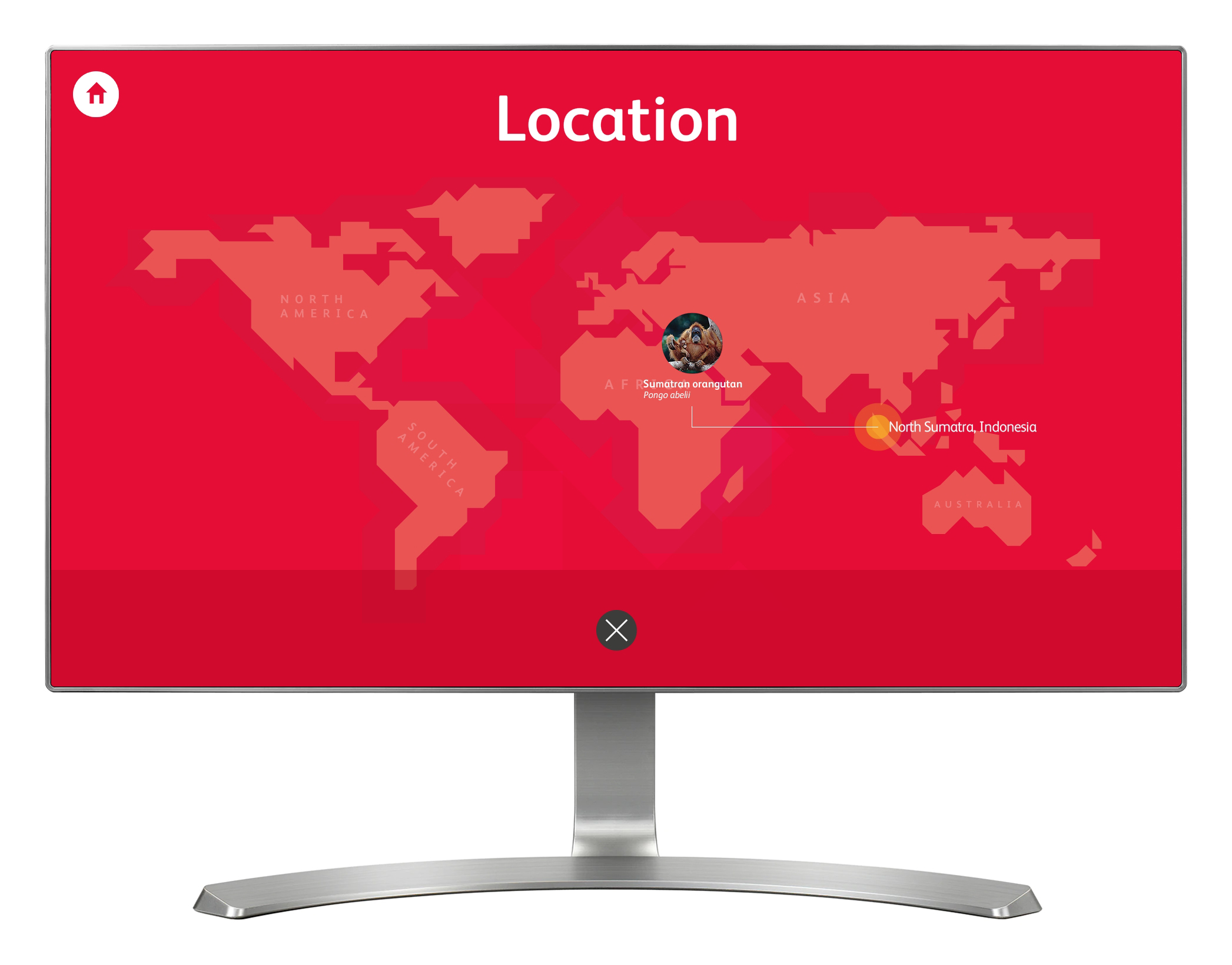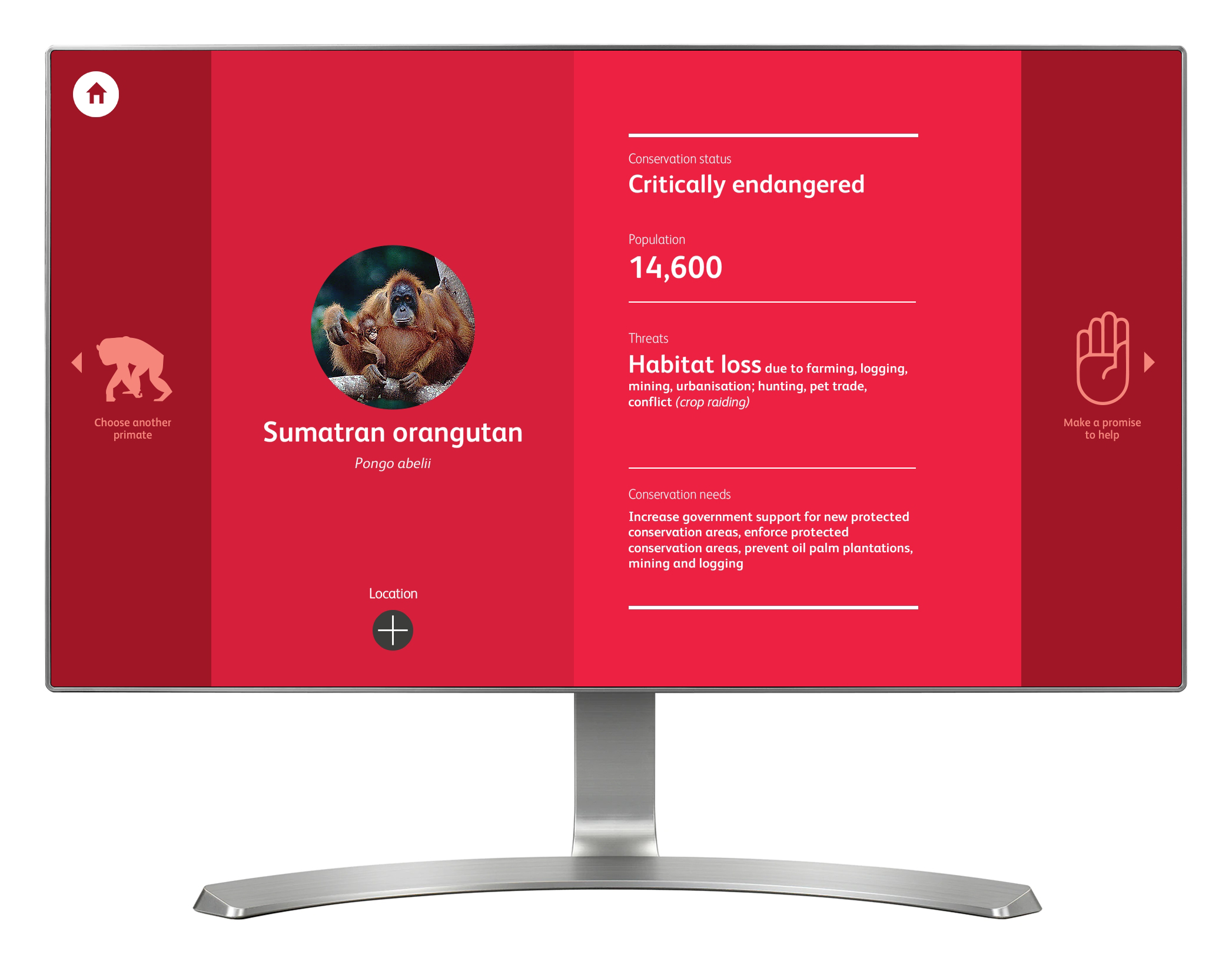 'Endangered' explores 25 of the most endangered primate species, providing key information such as total population, conservation status and the main threats they face. A popup world map shows the location of each species. The interactive includes four pledges and encourages visitors to choose one of them, each designed to be a simple action to help primates. The interactive stores how many times each pledge is taken, and displays a simple graph showing the popularity of each.