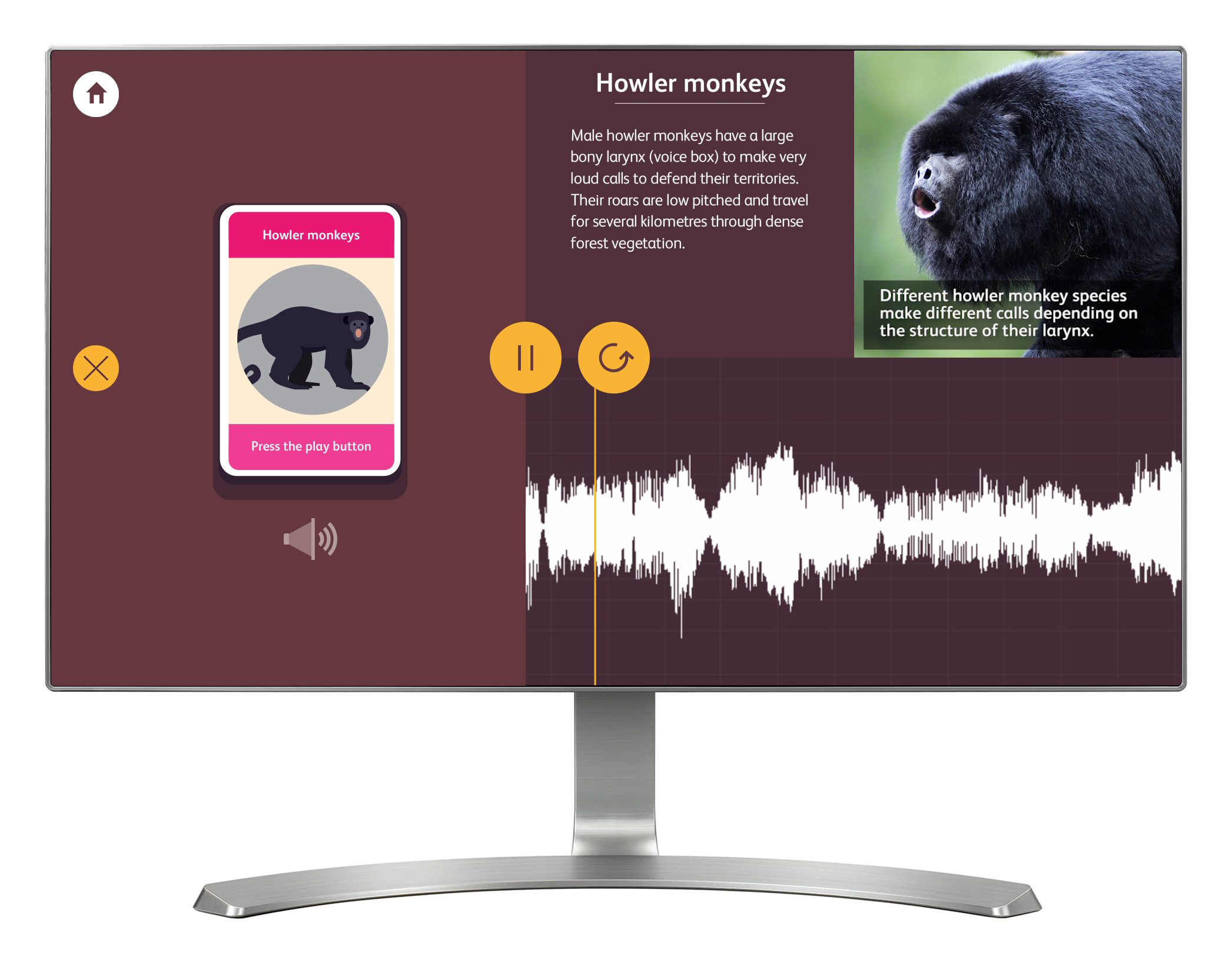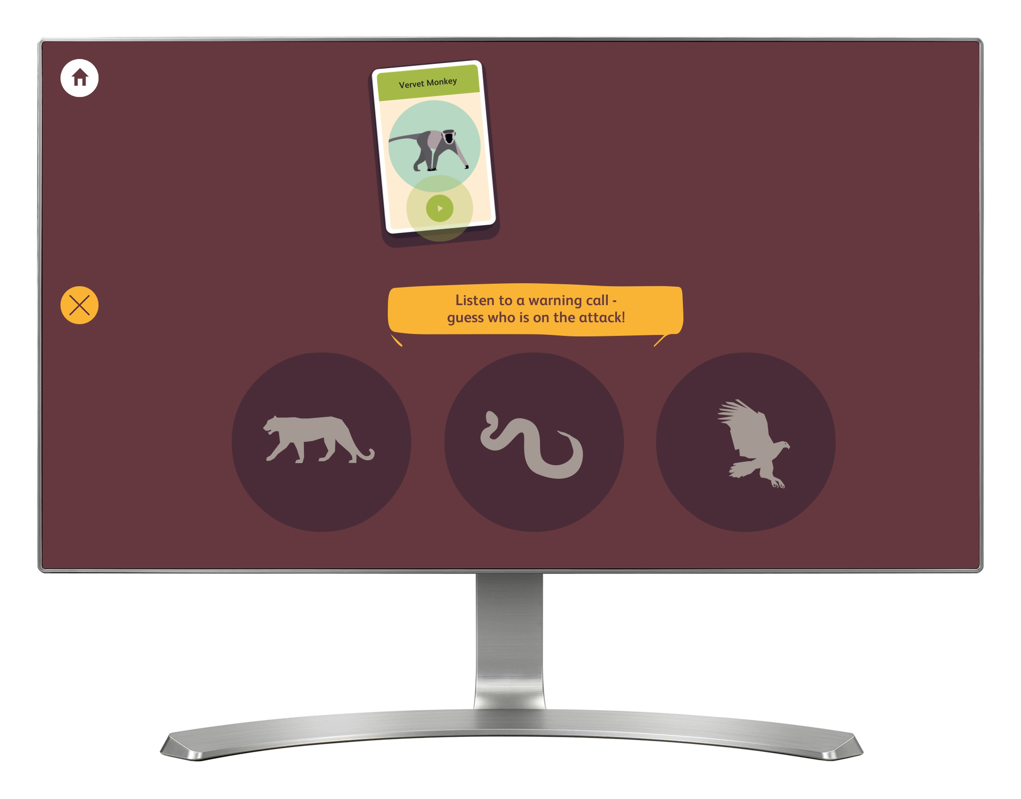 'Jungle Talk' is all about the sounds and noises made by primates, and is divided into two parts. The first part explores the sounds made by a number of different primates. The second is a mini game where visitors listen to different warning calls made by a Vervet Monkey, and have to guess which type of predator it has spotted.