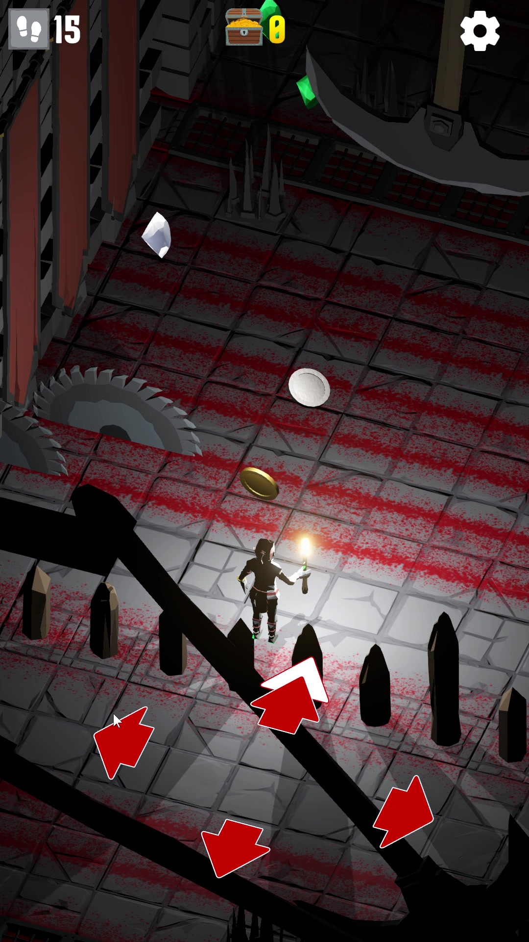 When I had a game loop working, I decided to change the visuals from prototype to a dungeon theme. Using a great selection of low poly assets from Synty Studio, I added the player knight, floor and walls, and created some dungeon themed environment prefabs: swinging axes, moving circular saws and vertical spikes. There are also some small environments without any hazards; these are inserted into the path periodically to give the player some brief respite from navigating the hazards. The player carries a burning torch in their hand, which not only illuminates the way ahead, but also creates some lovely real-time shadows, giving an eerie dungeon look and feel, especially when the axes and saw blades move by, throwing menacing shadows around the dungeon.