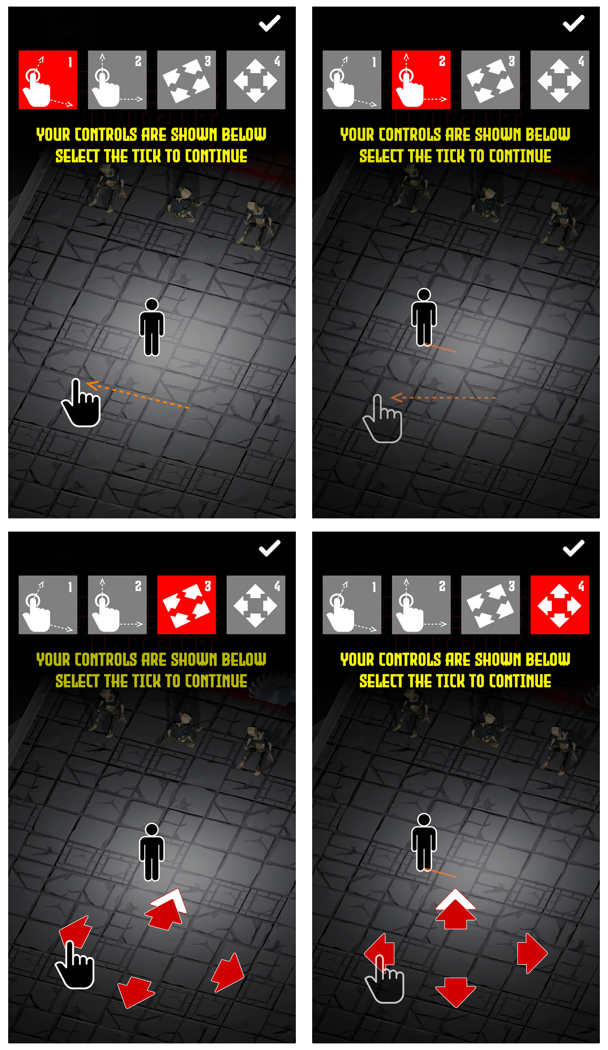 When the game launches for the first time (or after the reset button is selected), the player is shown a quick and simple introduction to the movement controls. There are a selection of different input controls for the player to choose from, using taps and swipes on the screen, or more traditional UI arrow buttons.