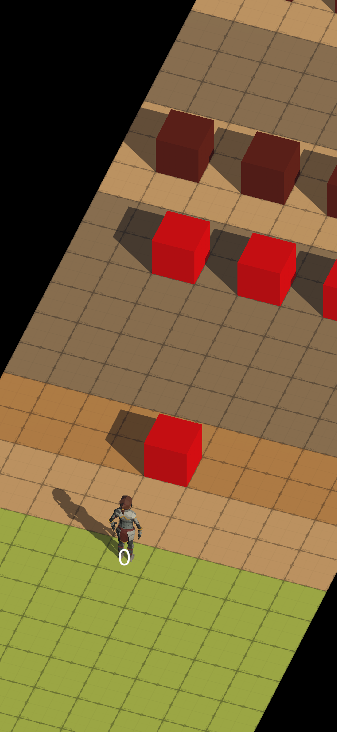 With a simple prototype working, I added some obstacles (brown boxes) that the player needs to walk around or jump over. I also added some hazards (red boxes), that kill the player instantly if they walk into, or jump onto them.