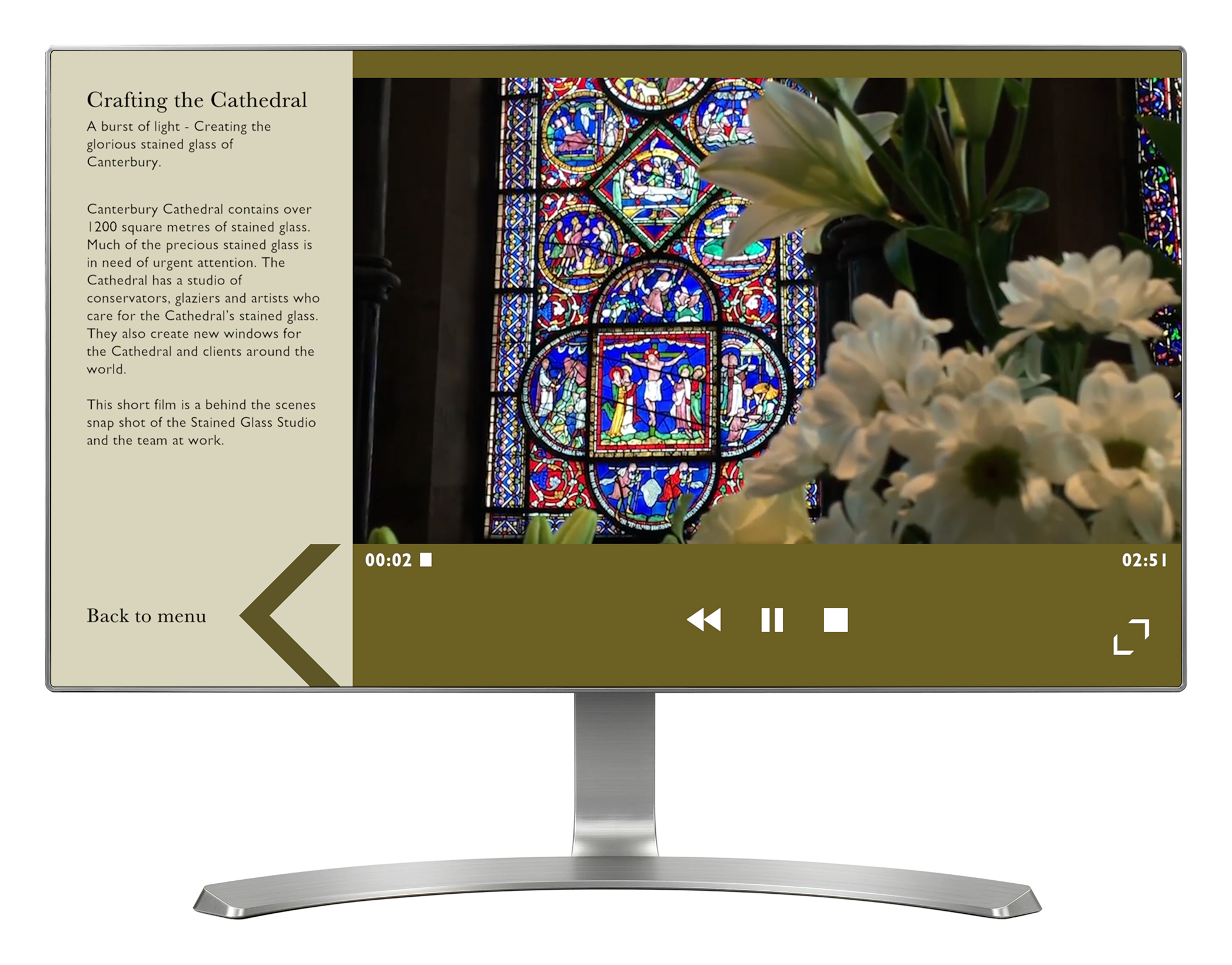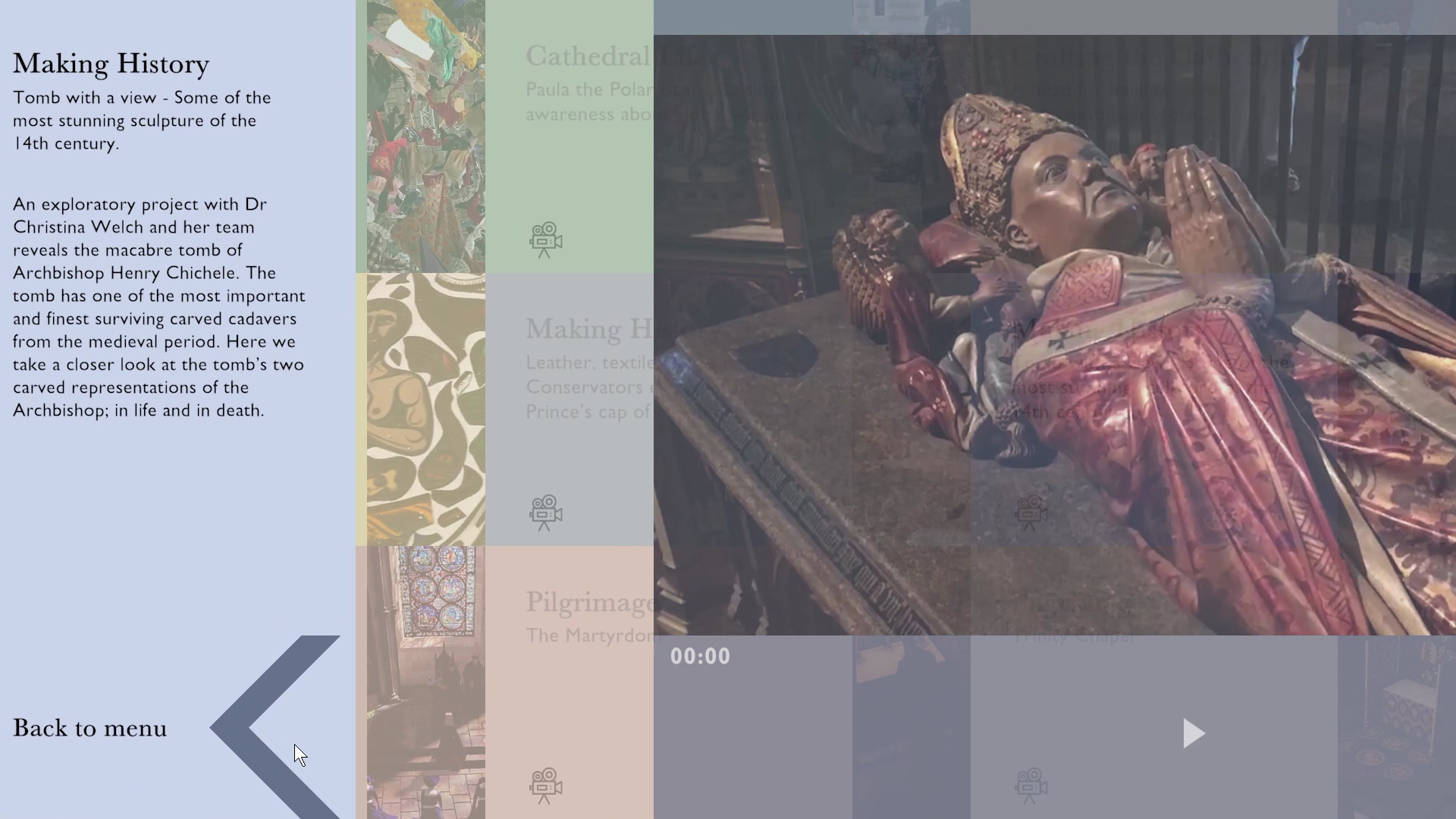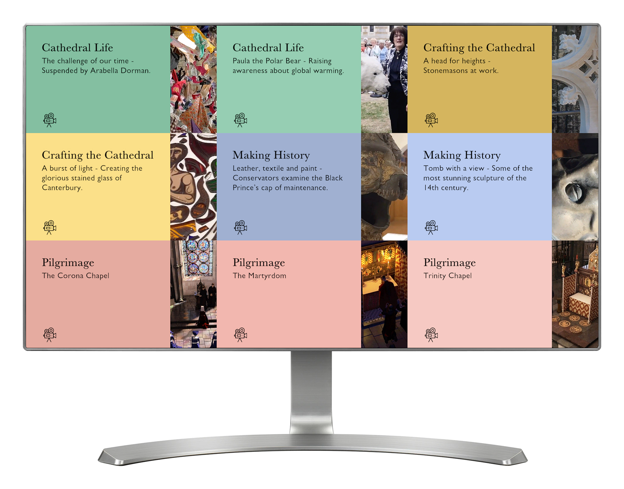 'Cathedral Themes' explores four different topics: topical issues such as refugees and the environment, the crafts involved in maintaining the Cathedral, sculpture, and pilgrimage. Using a touch screen, visitors can explore a series of cards. When a card is selected, it opens up to reveal a short video and text information about a particular topic.