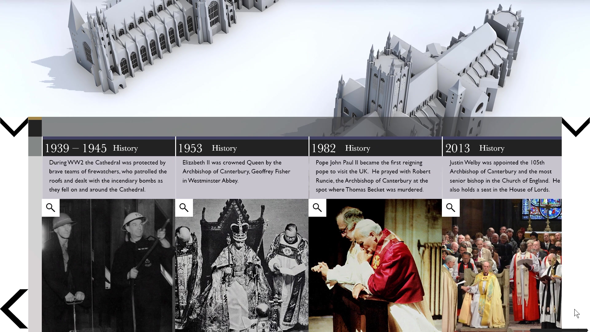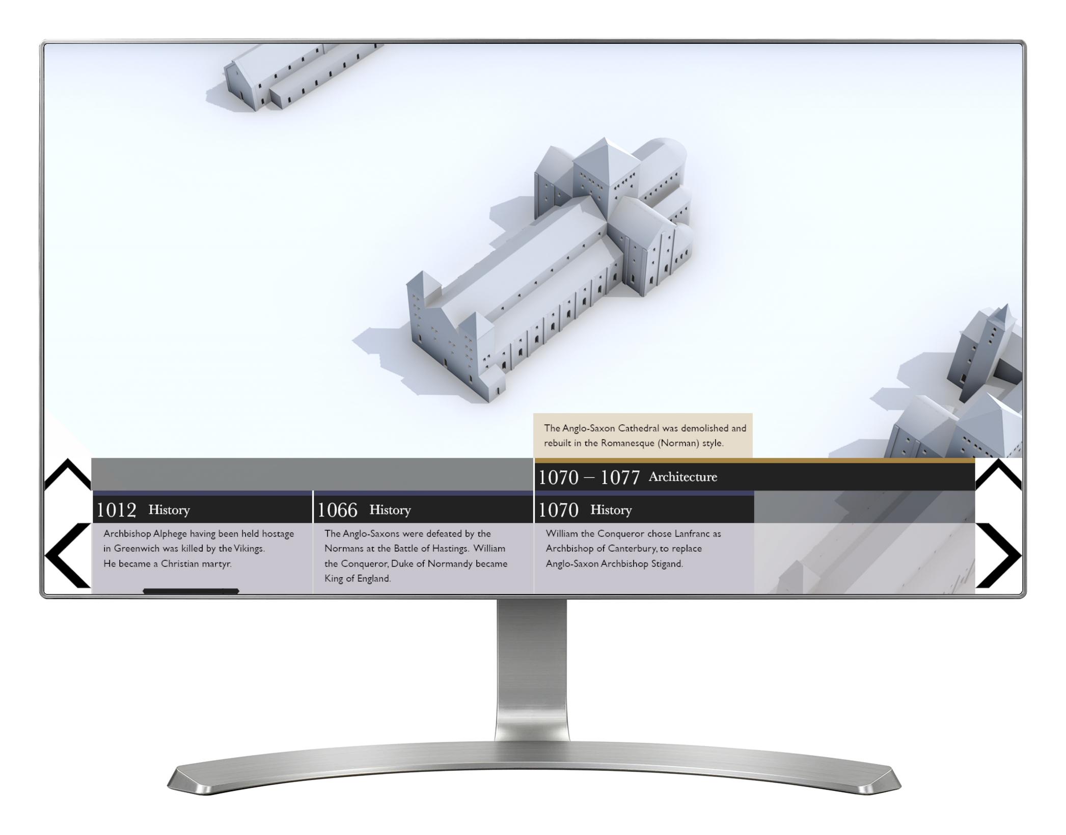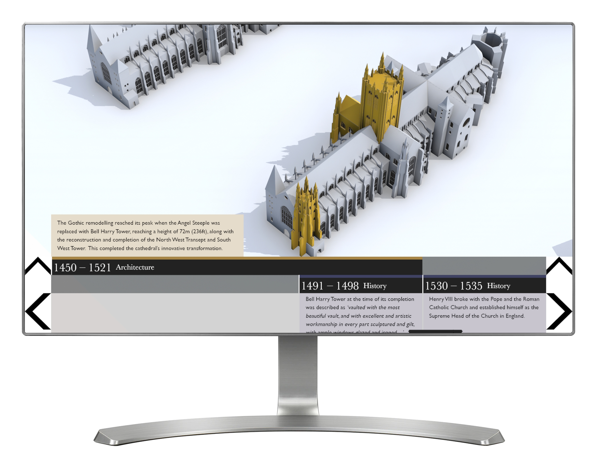 'History & Architecture' provides a snapshot look at the key changes to the architecture of the Cathedral, and the events that shaped those changes. Using a touch screen, visitors can explore nine different 3D models of the Cathedral, all arranged chronologically. The key architectural changes are highlighted and explained. The onscreen view can be toggled between architecture and history, with the history view giving access to a timeline of key events and images that have shaped the Cathedral.