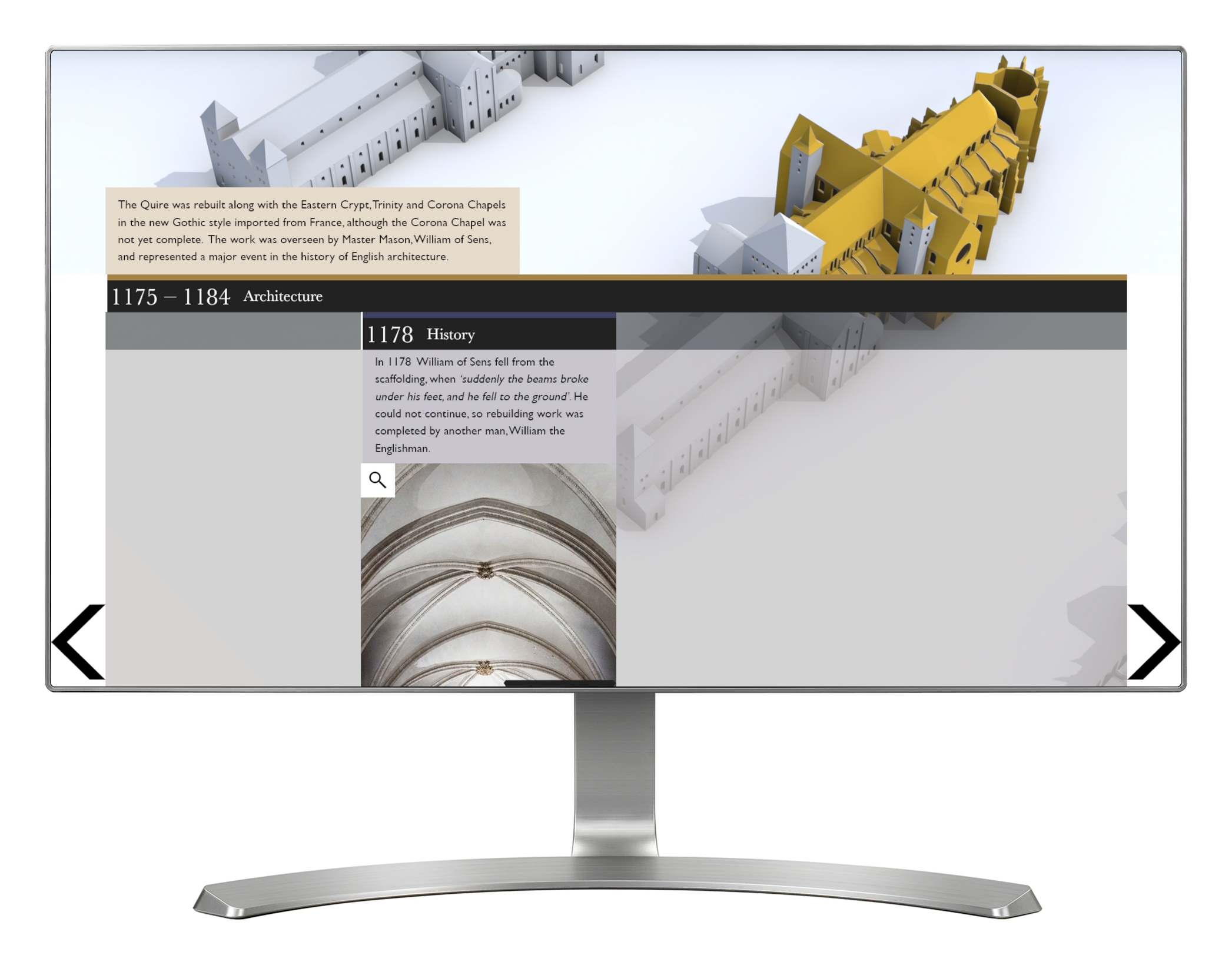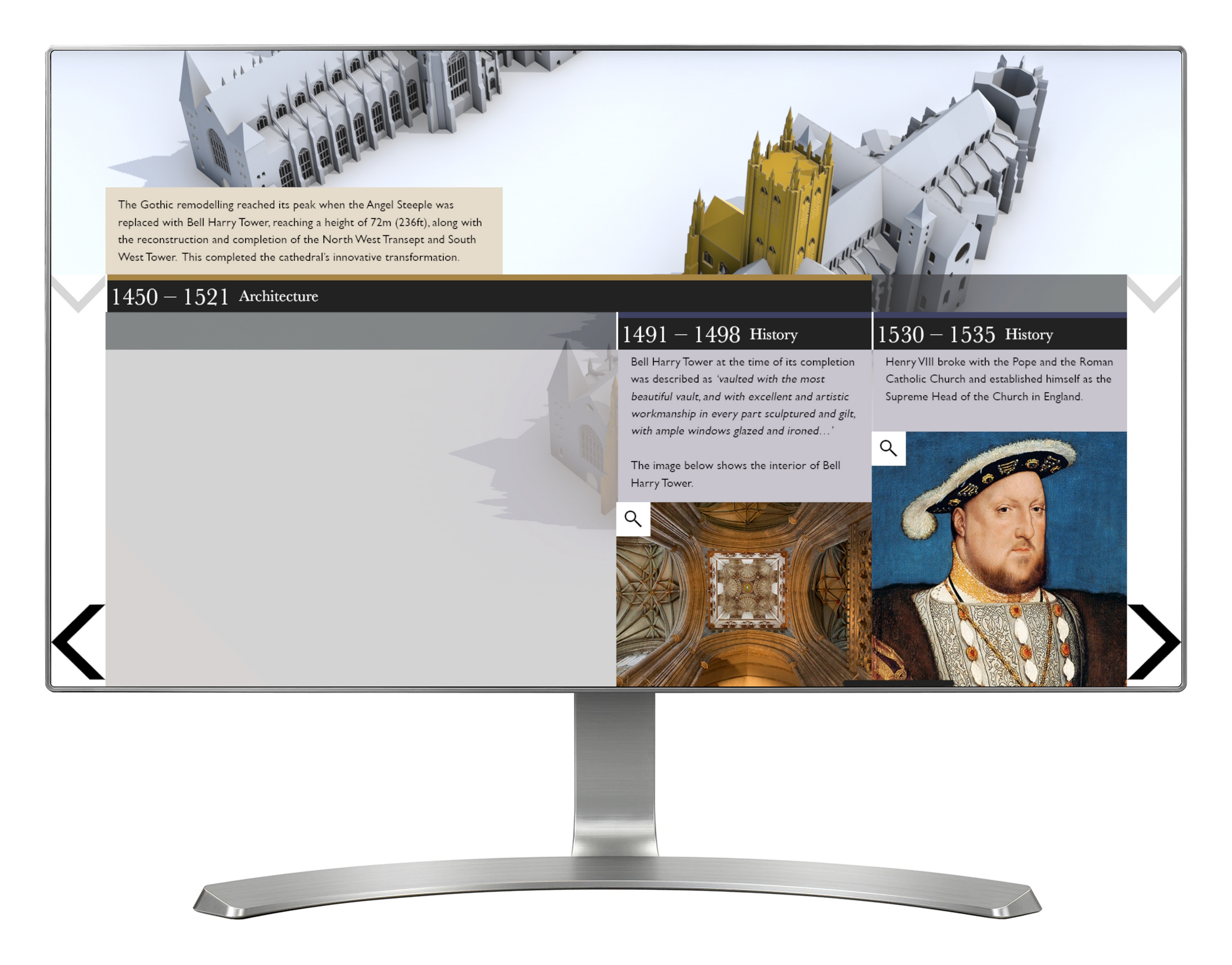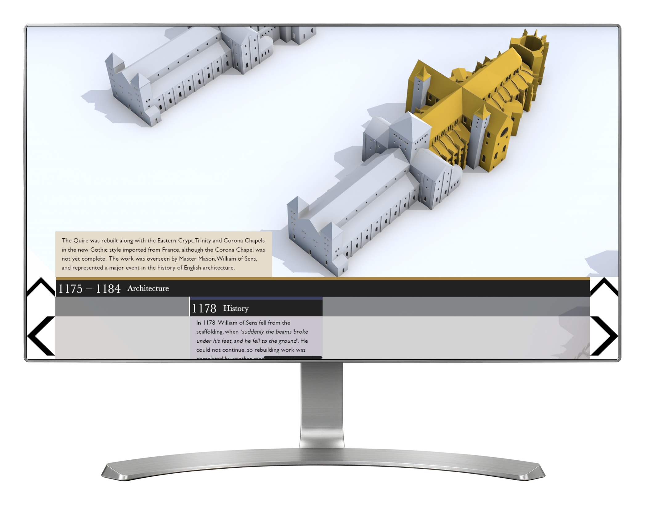 'History & Architecture' provides a snapshot look at the key changes to the architecture of the Cathedral, and the events that shaped those changes. Using a touch screen, visitors can explore nine different 3D models of the Cathedral, all arranged chronologically. The key architectural changes are highlighted and explained. The onscreen view can be toggled between architecture and history, with the history view giving access to a timeline of key events and images that have shaped the Cathedral.