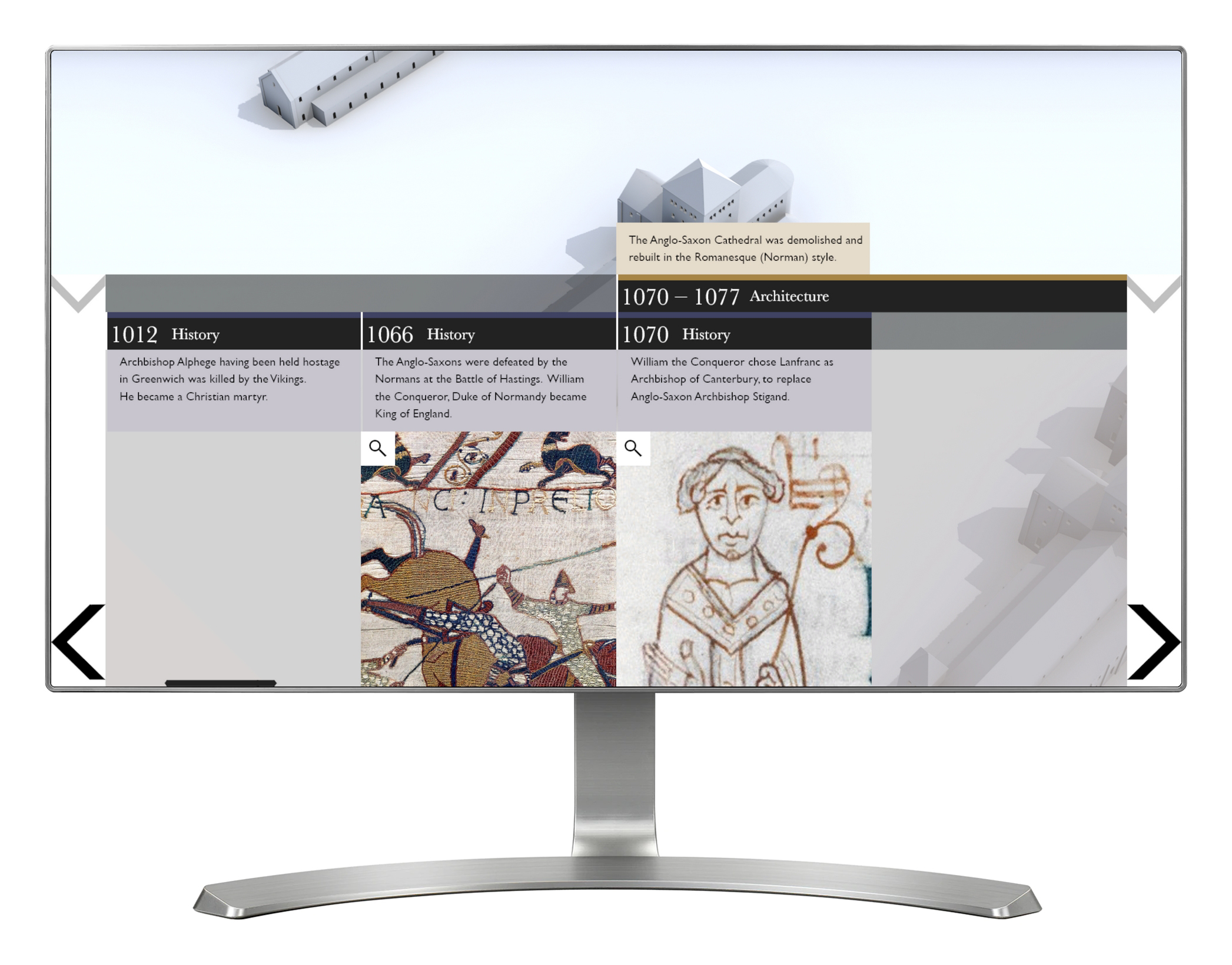 The Canterbury Journey is a large scale project at Canterbury Cathedral, designed to achieve a radical transformation in the accessibility and sustainability of the Cathedral. Part of this includes a new Visitor Centre, and I developed two touch screen interactives for this.