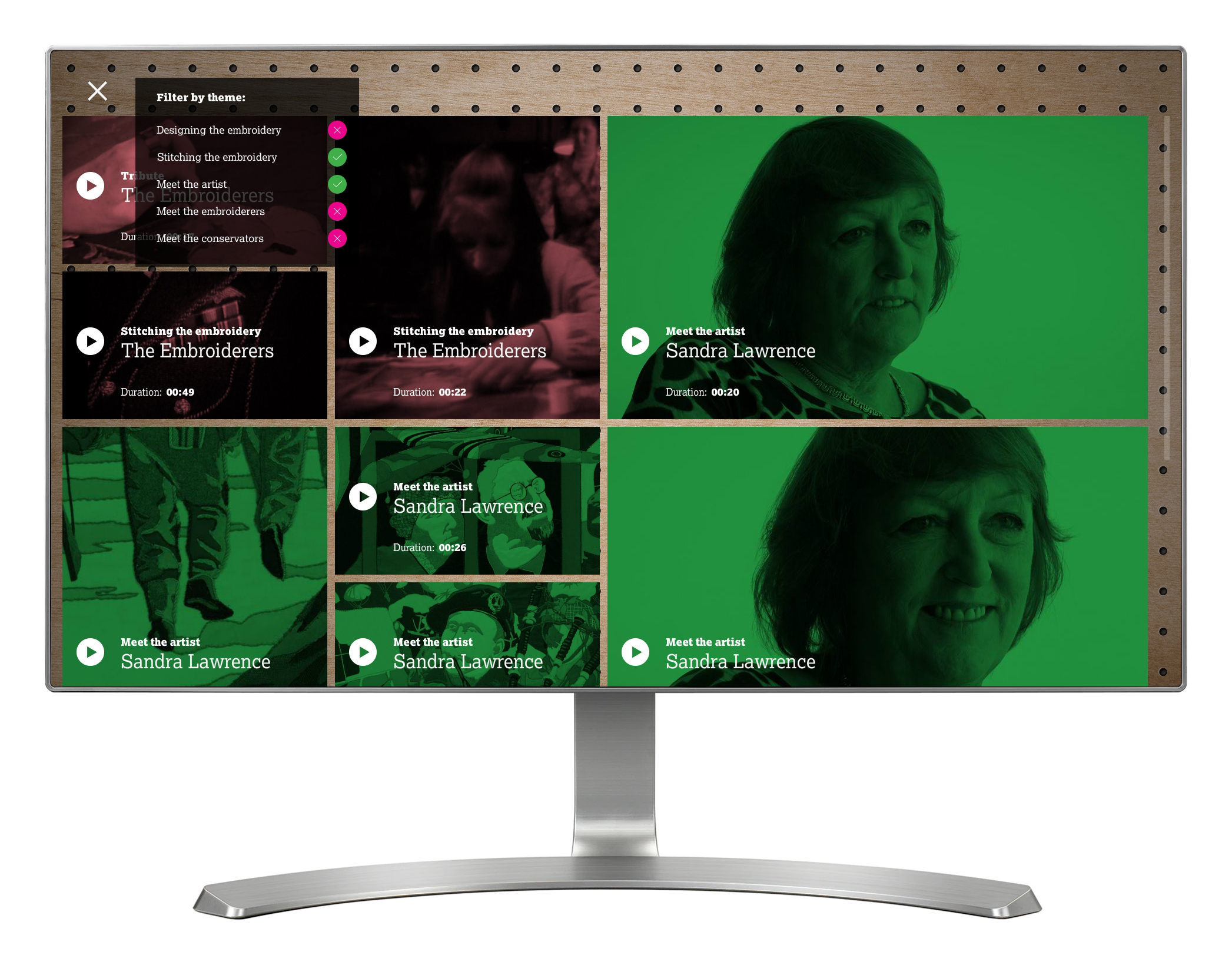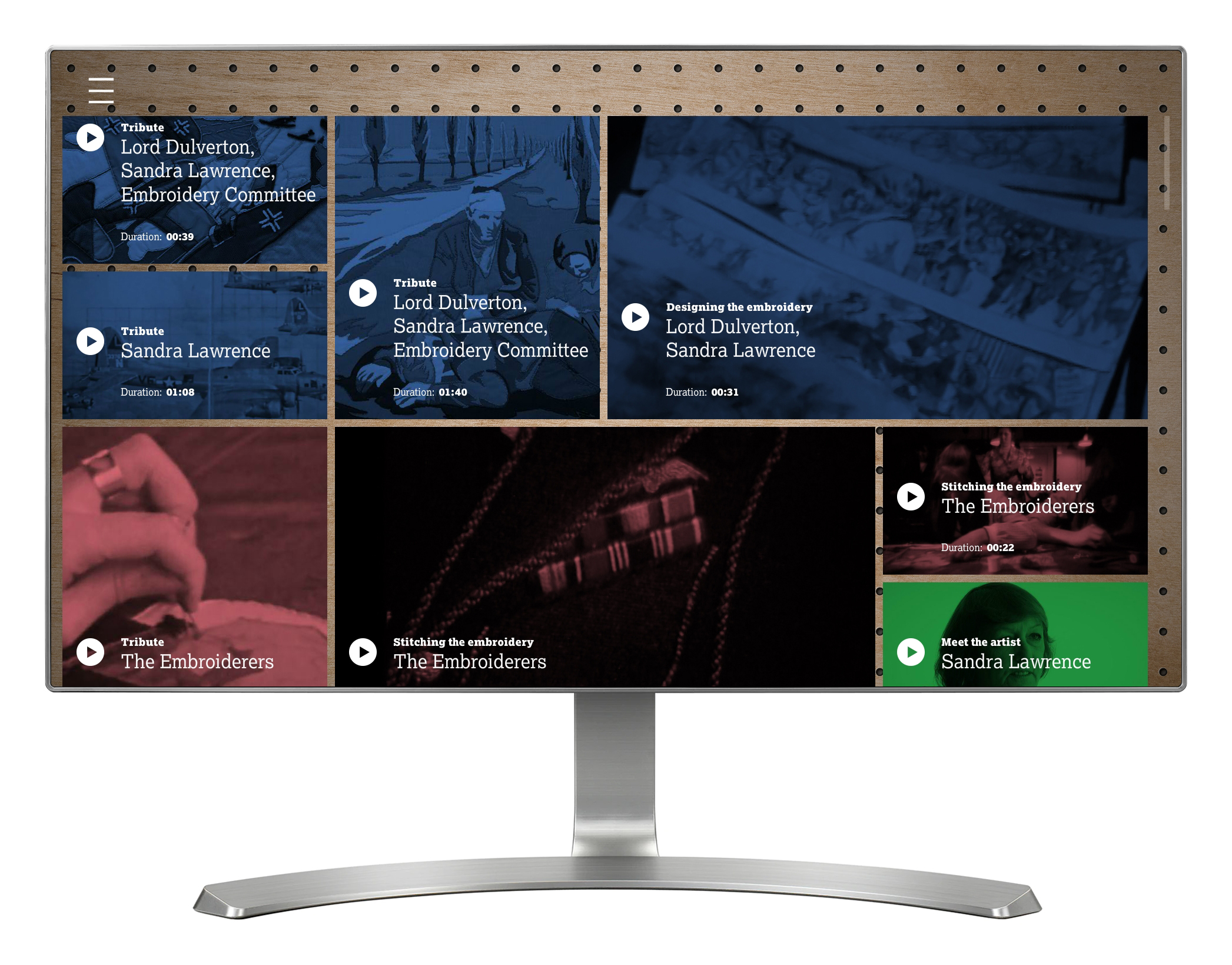 'Overlord Embroidery' lets visitors explore archive videos and modern day video interviews with the key people involved in the creation of the Overlord Embroidery. This is an 83m long hand-stitched artwork that tells the story of D-Day and the Battle of Normandy, and took over five years to make, being completed in 1974. The video content is presented in a pinterest-style animated menu, and is arranged into five themes that can be filtered by visitors.