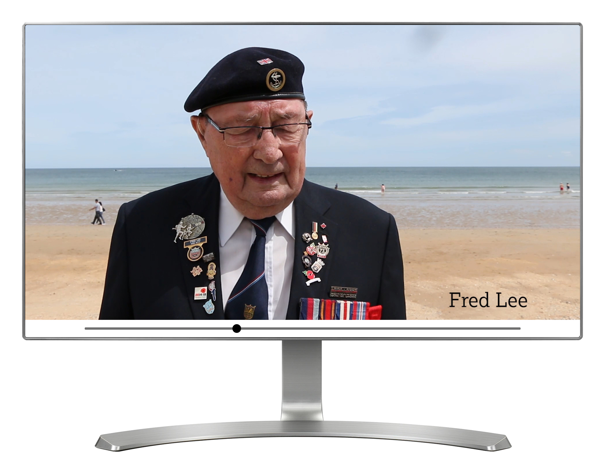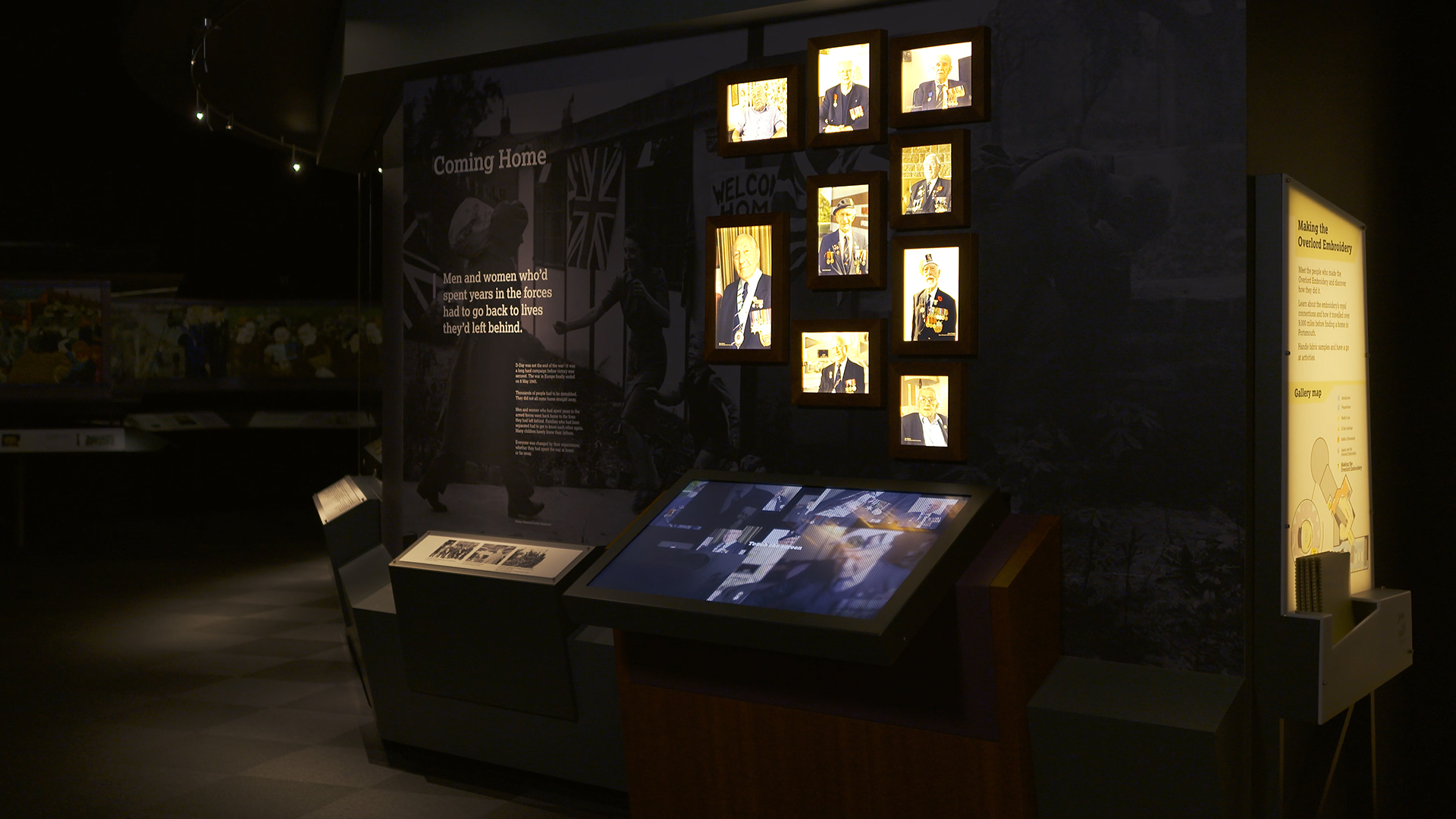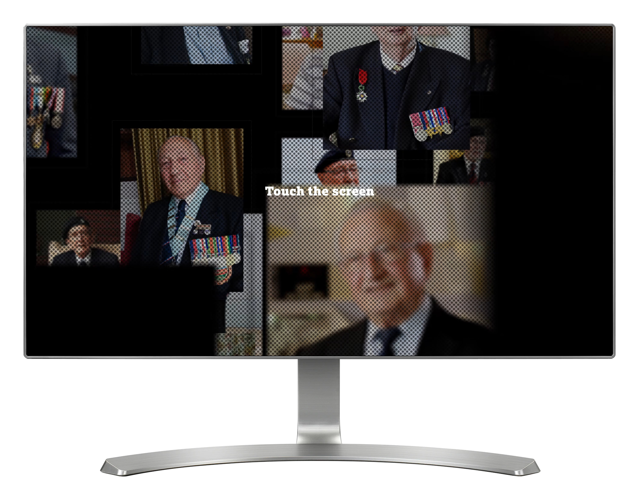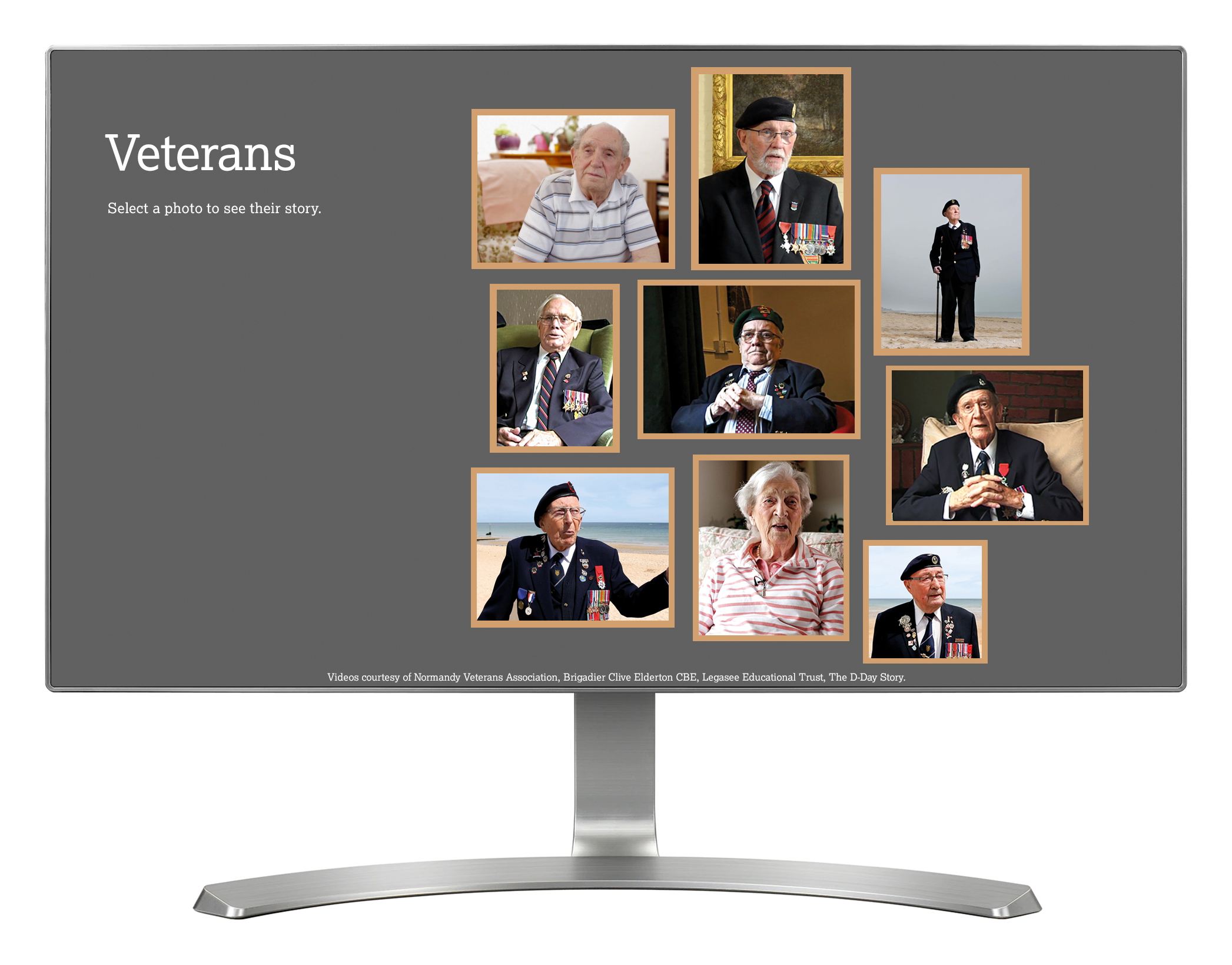 'Legacy Stories' is installed on three separate touch screens, each with it's own theme and content. The interactive contains short video interviews with D-Day veterans, talking about subjects such as coming home and the effects of losing friends. Each installation contains nine videos, and these are presented as a menu of framed photos. When a photo is selected the video interview plays on-screen. In front of each installation is a wall with an identical layout of real framed photos. When a video interview plays on-screen, the related photo on the wall is illuminated via a back light. This is controlled from the interactive using DMX lighting control.