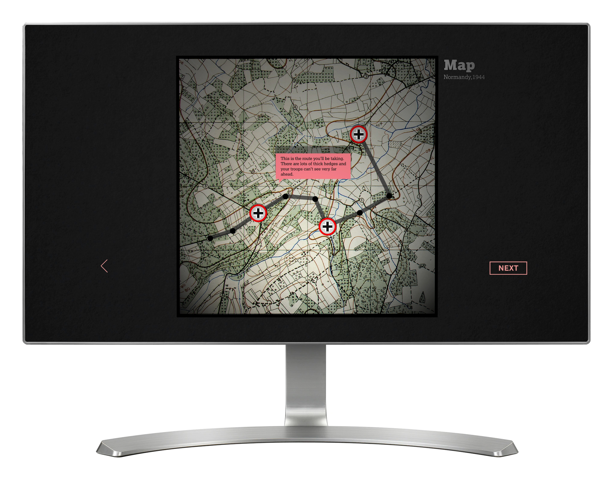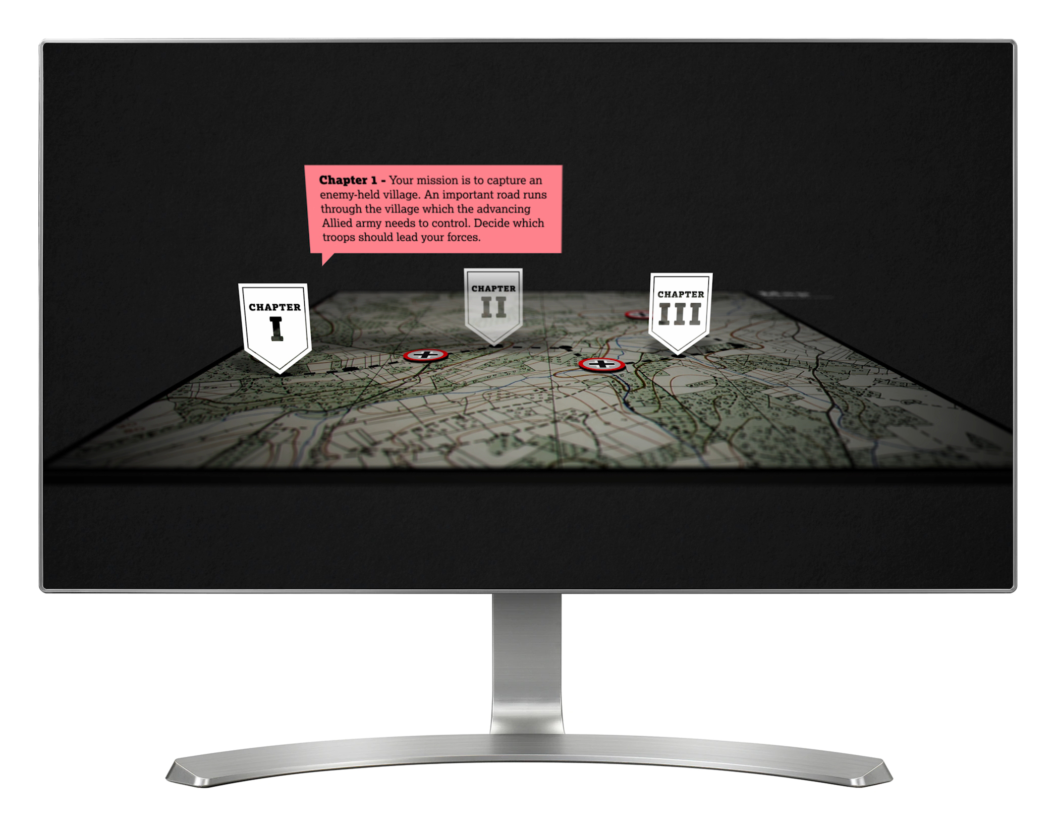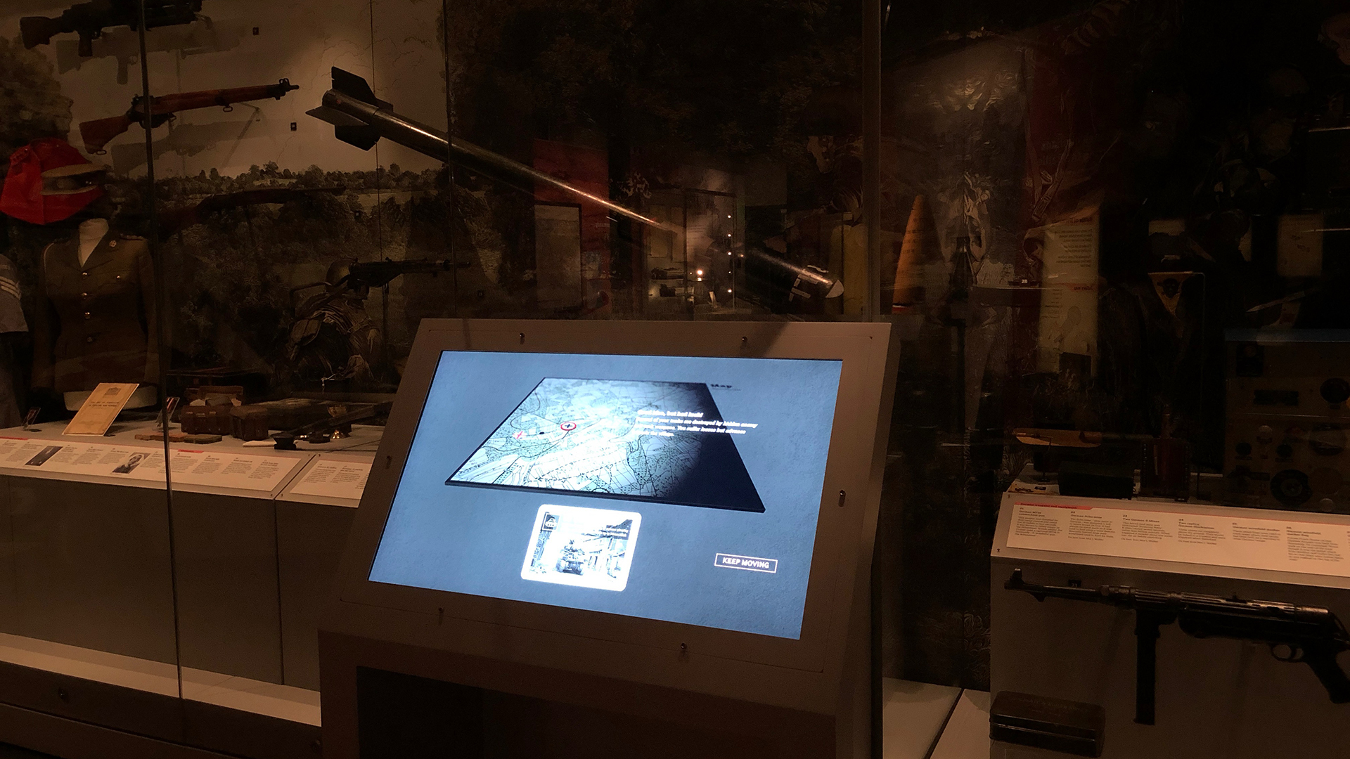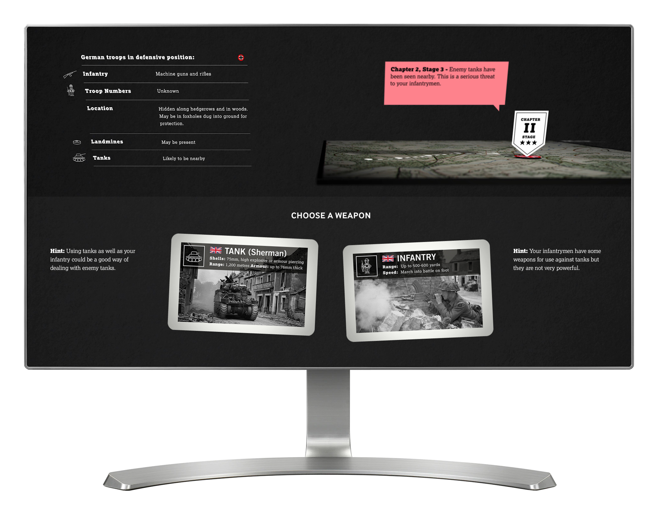 In 'The Experience of Battle' visitors lead a group of soldiers through Normandy. Played through a series of chapters and stages, a variety of different obstacles and enemy vehicles and troops are encountered along the way. Visitors choose how to deal with each threat, and see if they can make it all the way to the end.