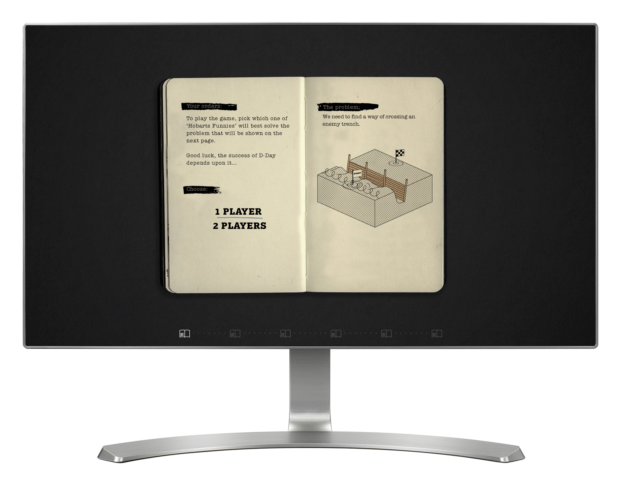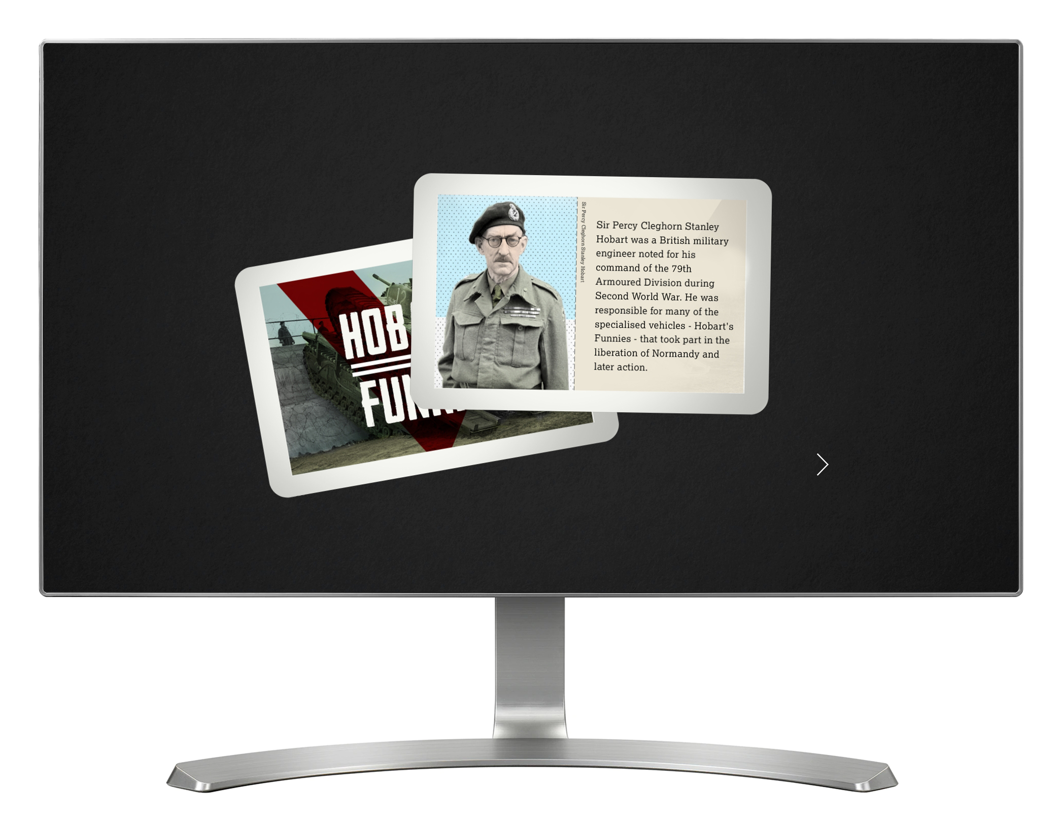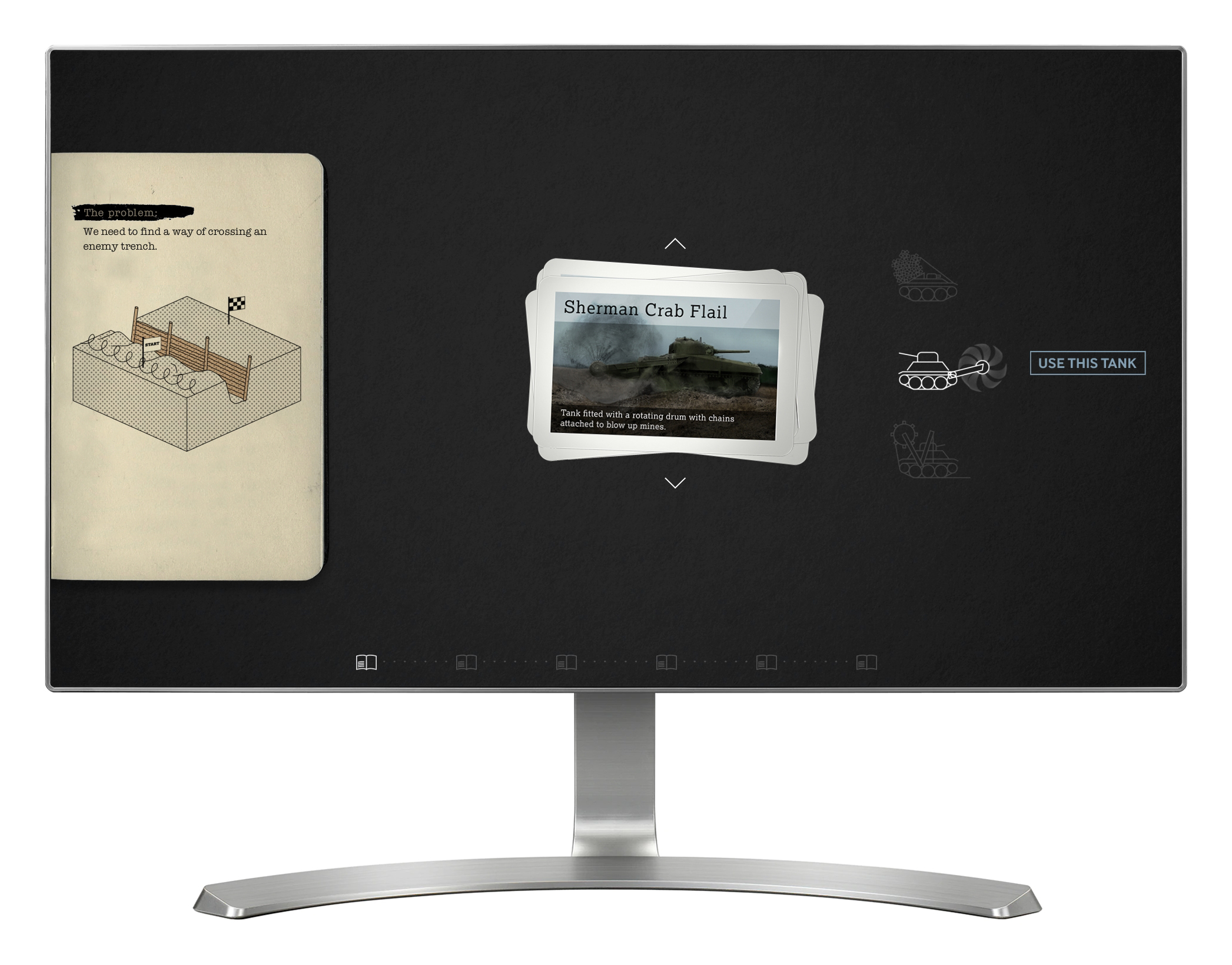 'Hobarts Funnies' brings to life the unusual tanks developed by Sir Percy Cleghorn Stanley Hobart. Visitors are presented with a series of problems or scenarios that need to be overcome (such as getting vehicles across a river), and they have to choose which tank, or 'Hobarts Funny' would be best suited to the task. Visitors can play through the scenarios on their own, or against a second player.