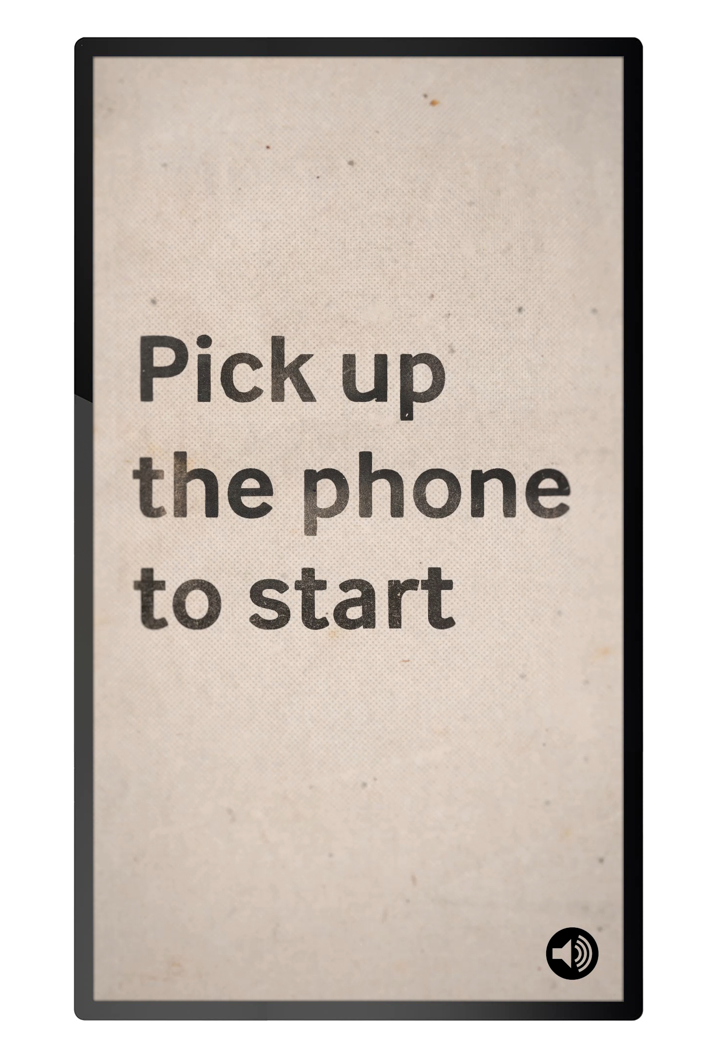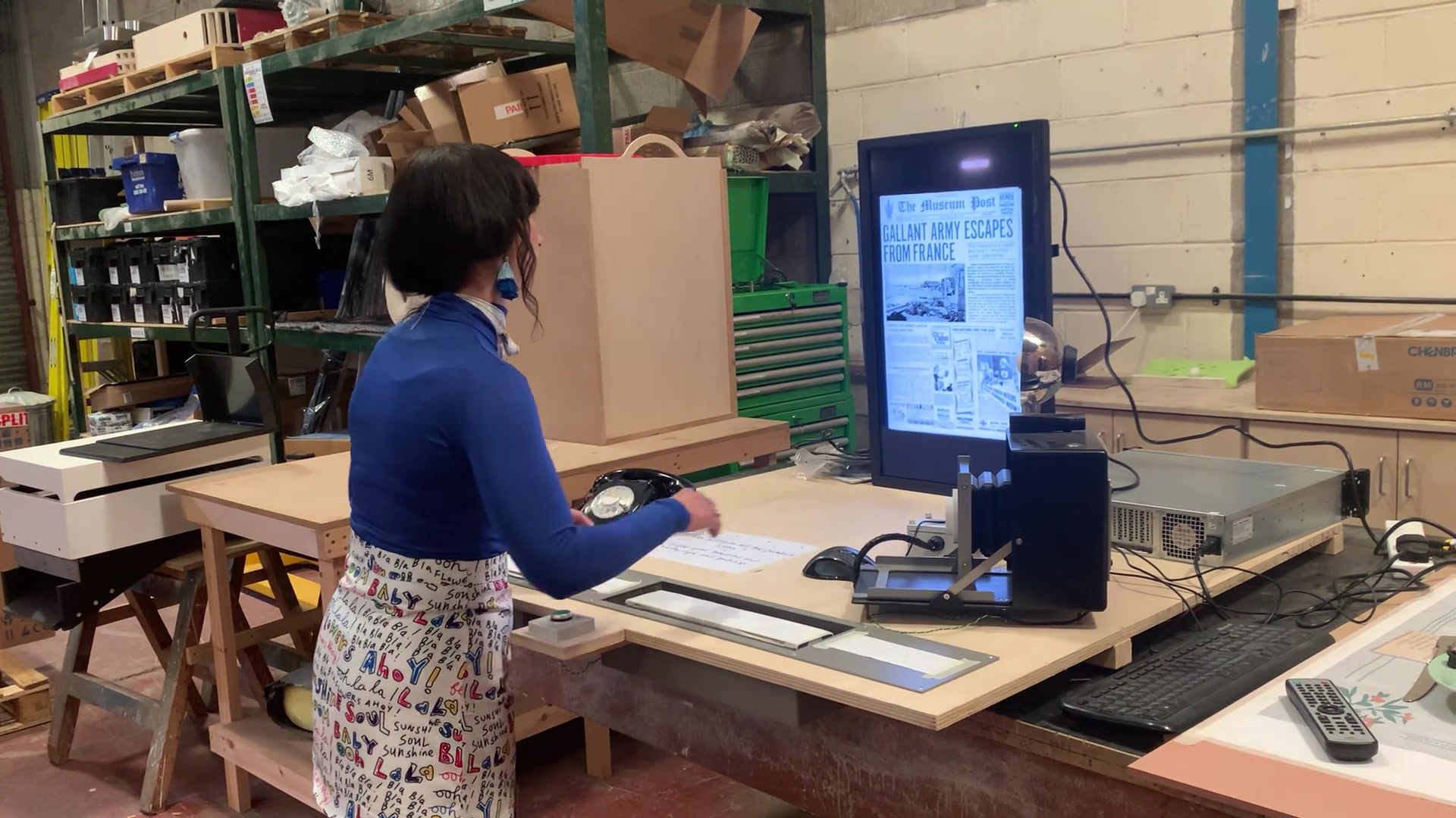 The interactive is displayed on a 32", 1080 x 1920 portrait screen, and is controlled by a range of objects including a telephone, two push buttons and two rotating rollers with words on them.