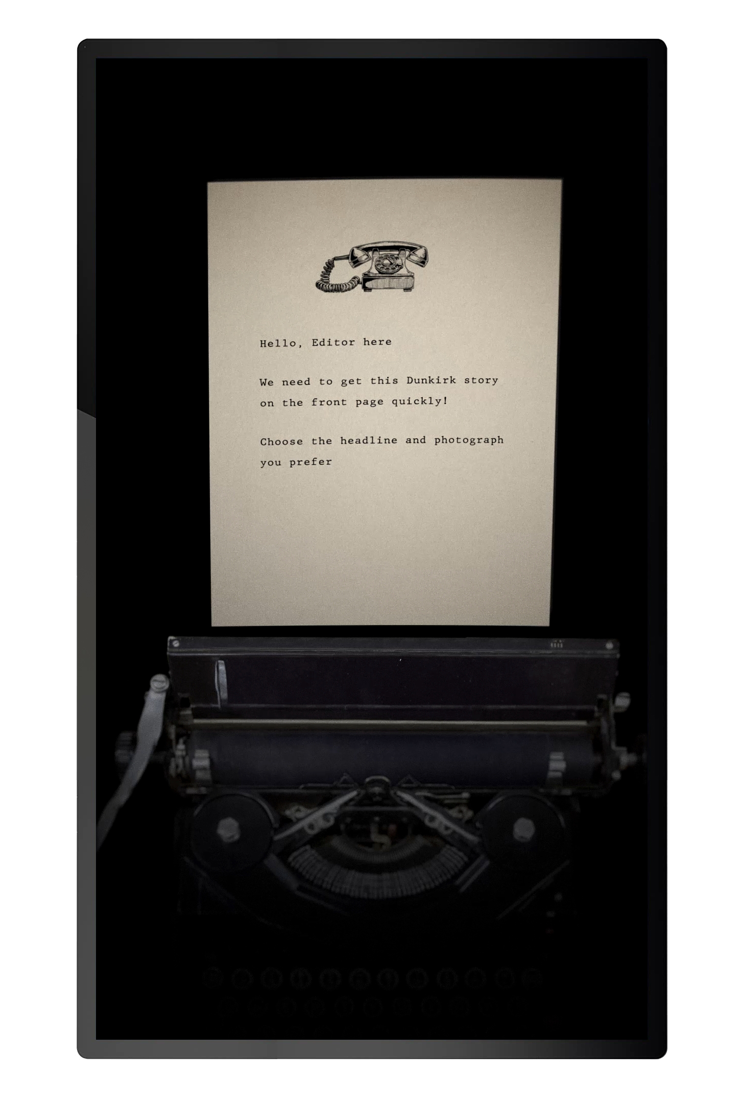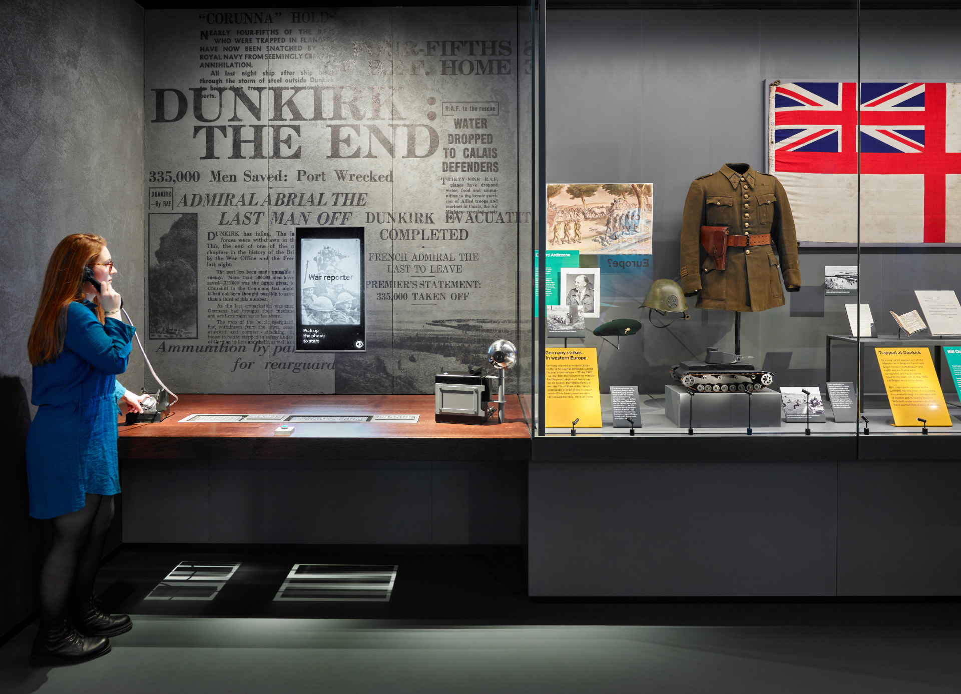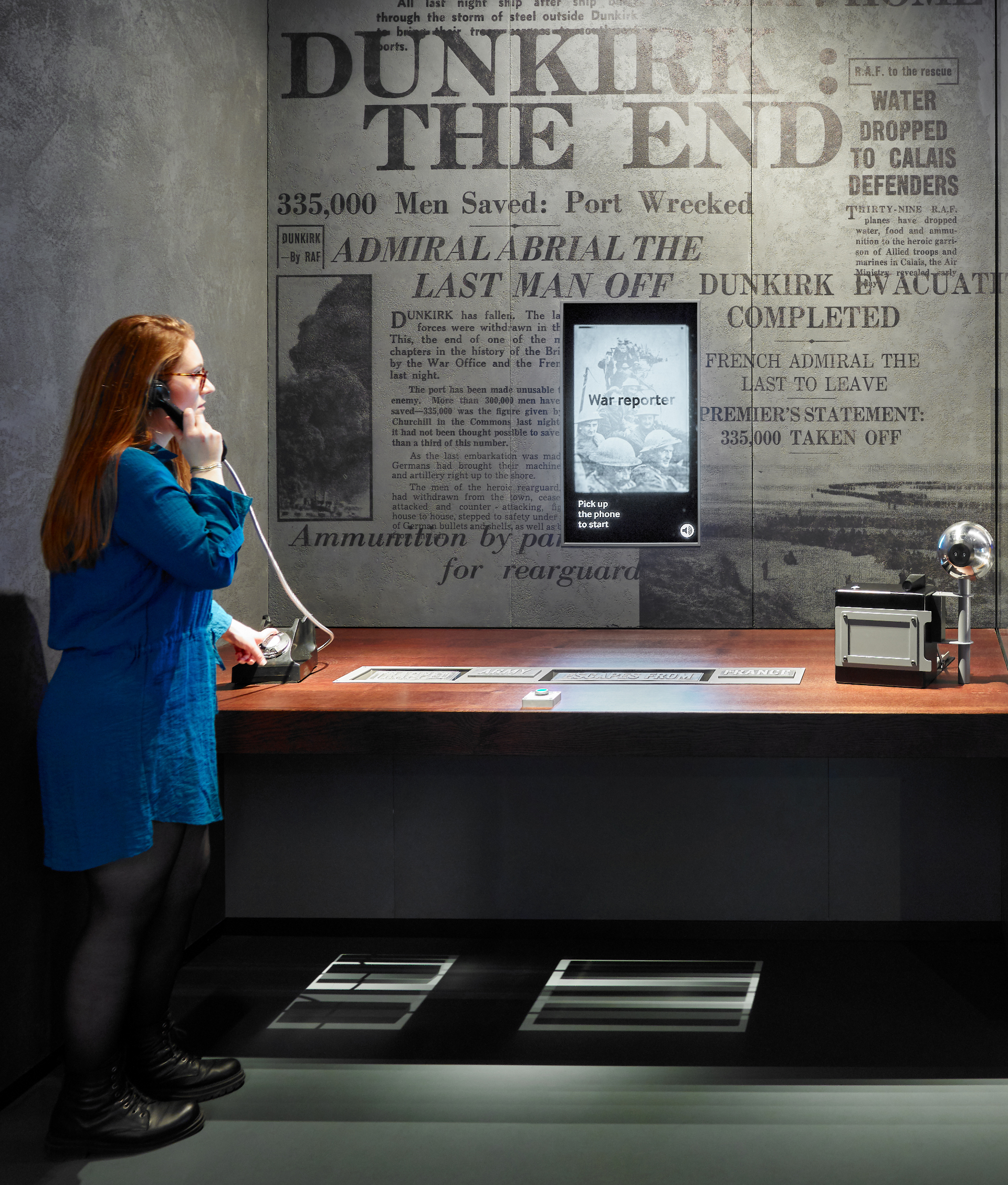 'War Reporter' is an interactive experience controlled by physical, touchable objects. Visitors use the objects to make selections and build their own newspaper headline covering the evacuation of Dunkirk. The choice of wording and photos for the headline allows visitors to give the story a positive or negative feeling. There are 81 different combinations in total.
