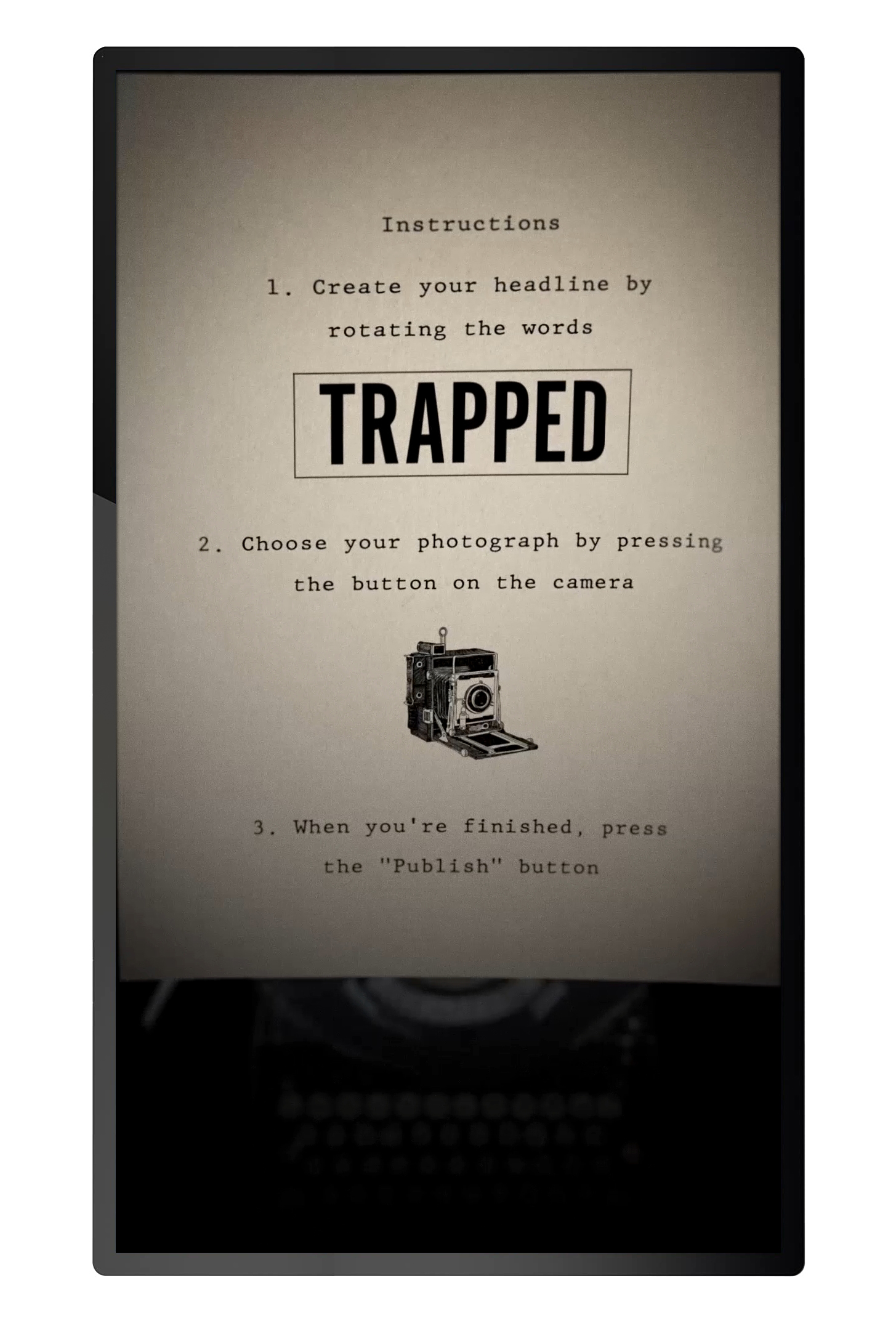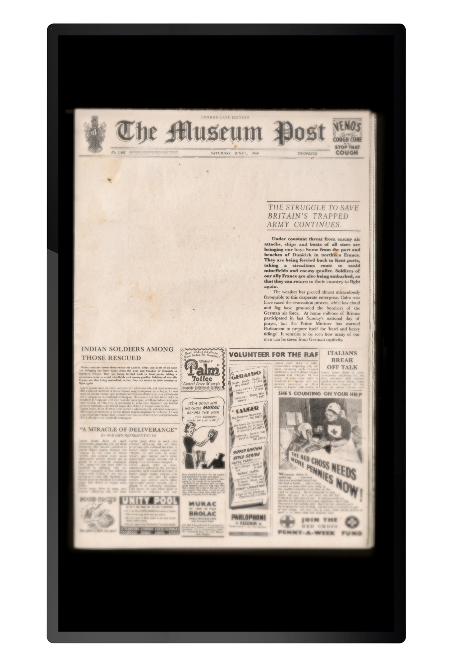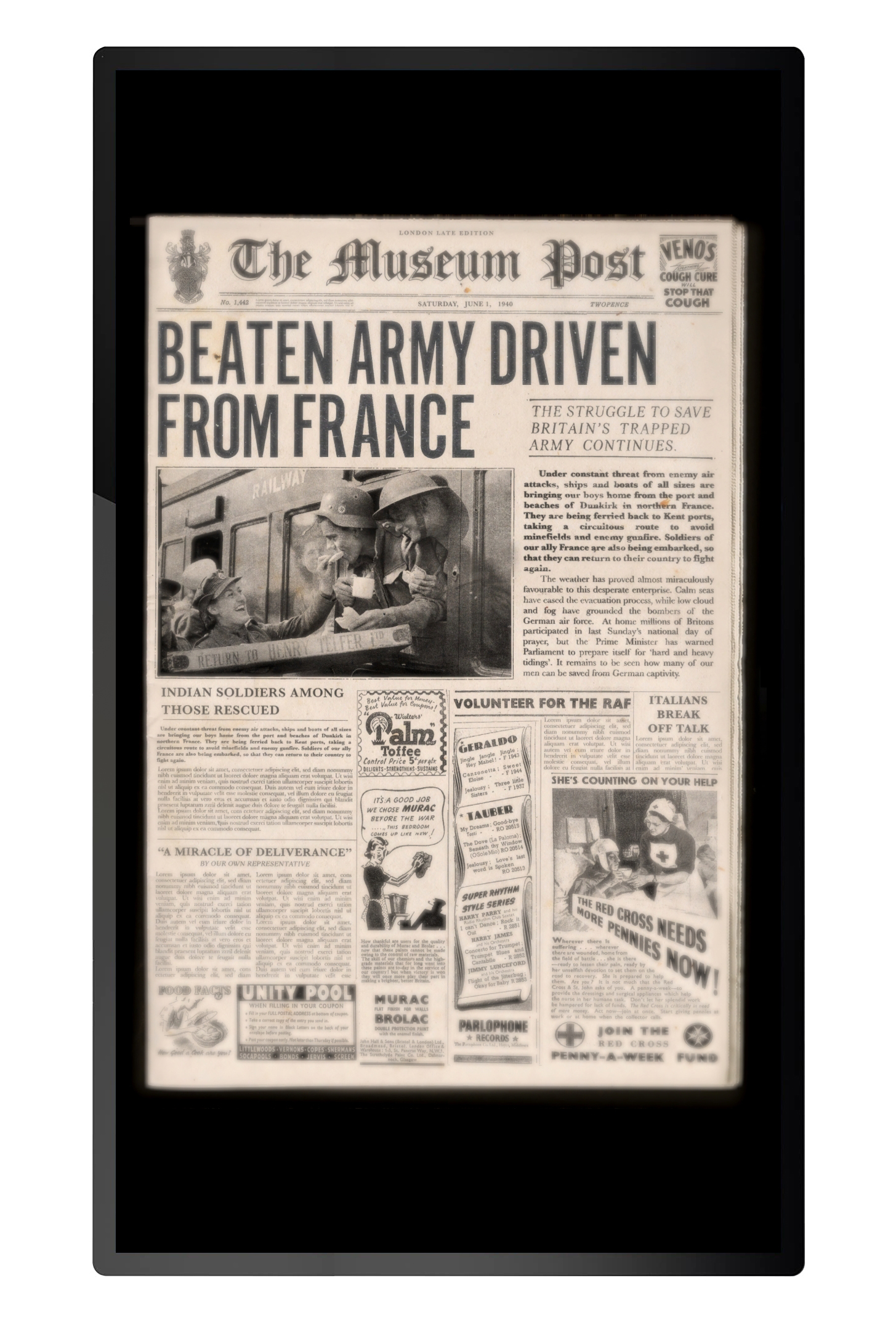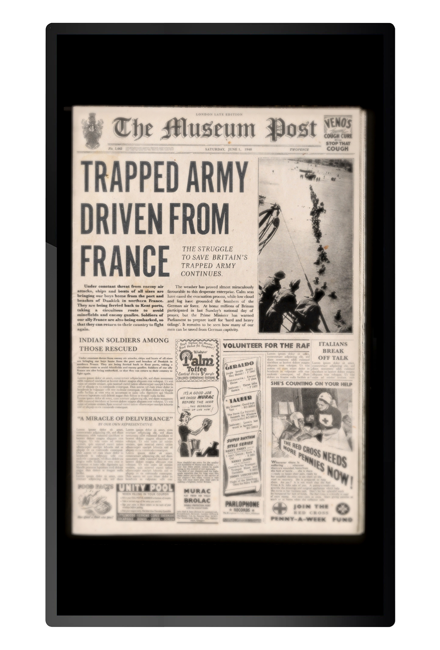 'War Reporter' is an interactive experience controlled by physical, touchable objects. Visitors use the objects to make selections and build their own newspaper headline covering the evacuation of Dunkirk. The choice of wording and photos for the headline allows visitors to give the story a positive or negative feeling. There are 81 different combinations in total.