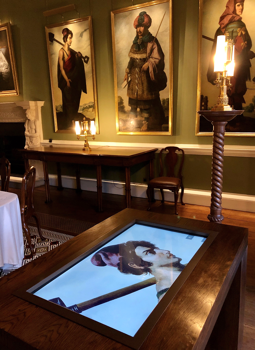 The touch screen is located at one end of the Long Dining Room, and the screen is mounted flat like a table top. Visitors can choose to rotate the interface through 180 degrees so that the screen can be used from two different sides. The preferred side allows visitors to use the touch screen while also being able to look at the real paintings in the room. The opposite side provides more physical space around the screen, making it more accessible for wheelchairs.